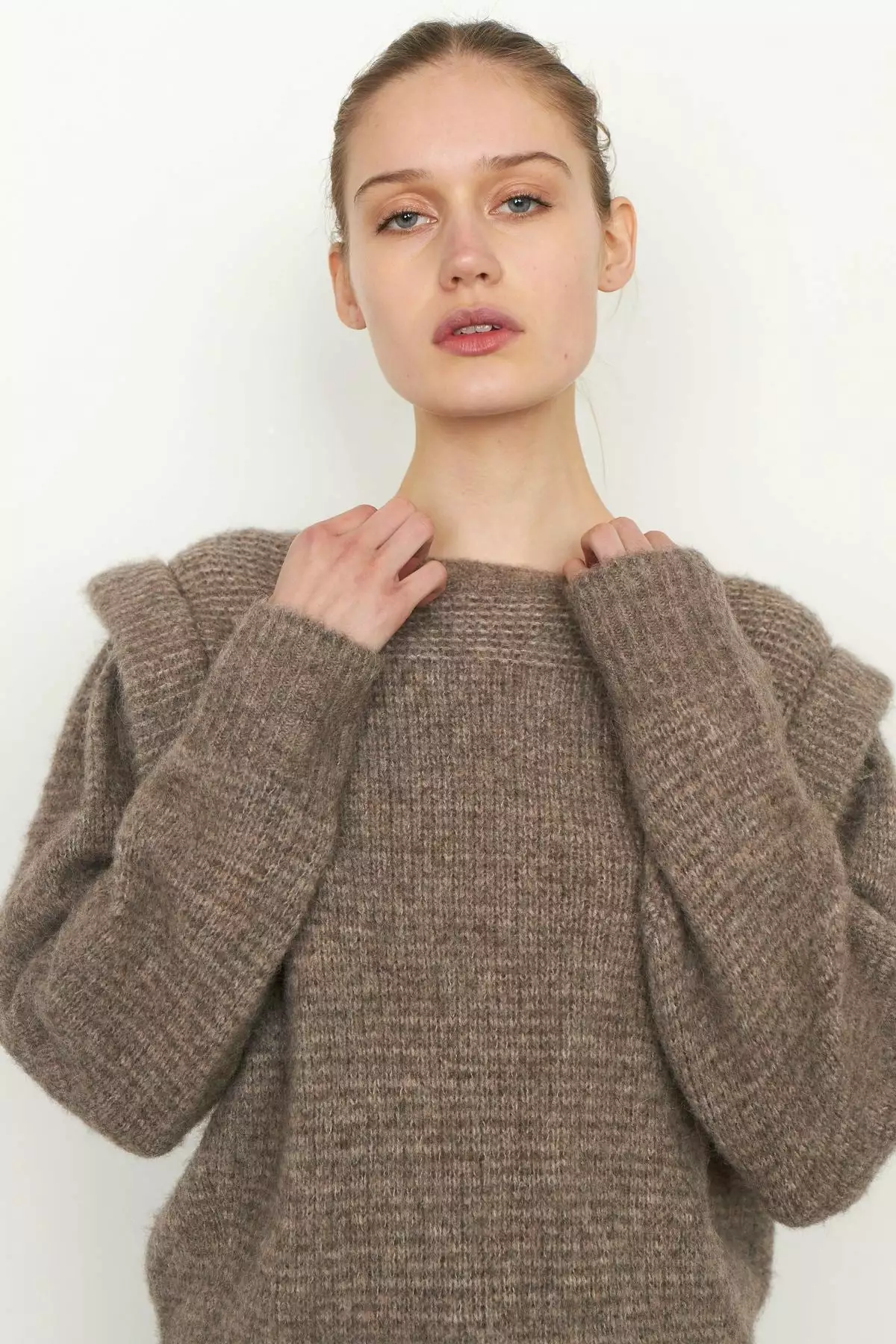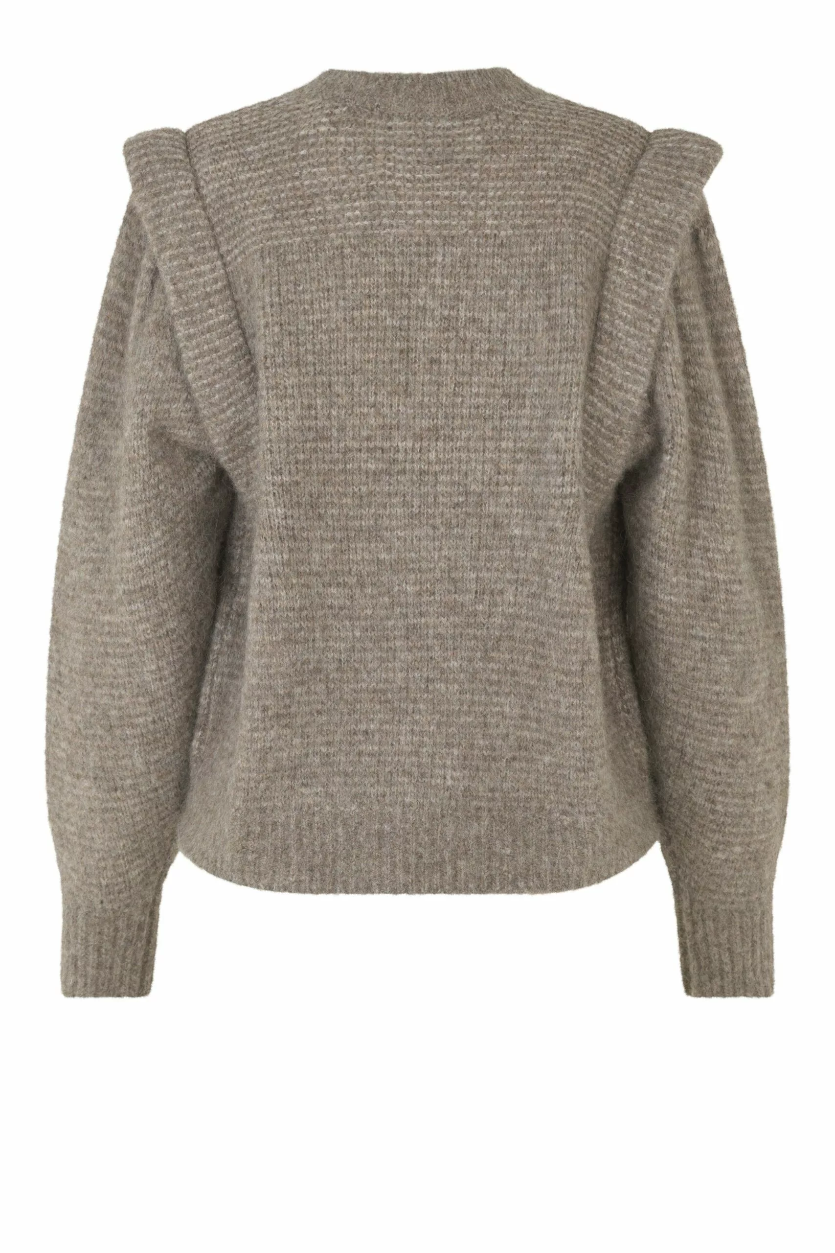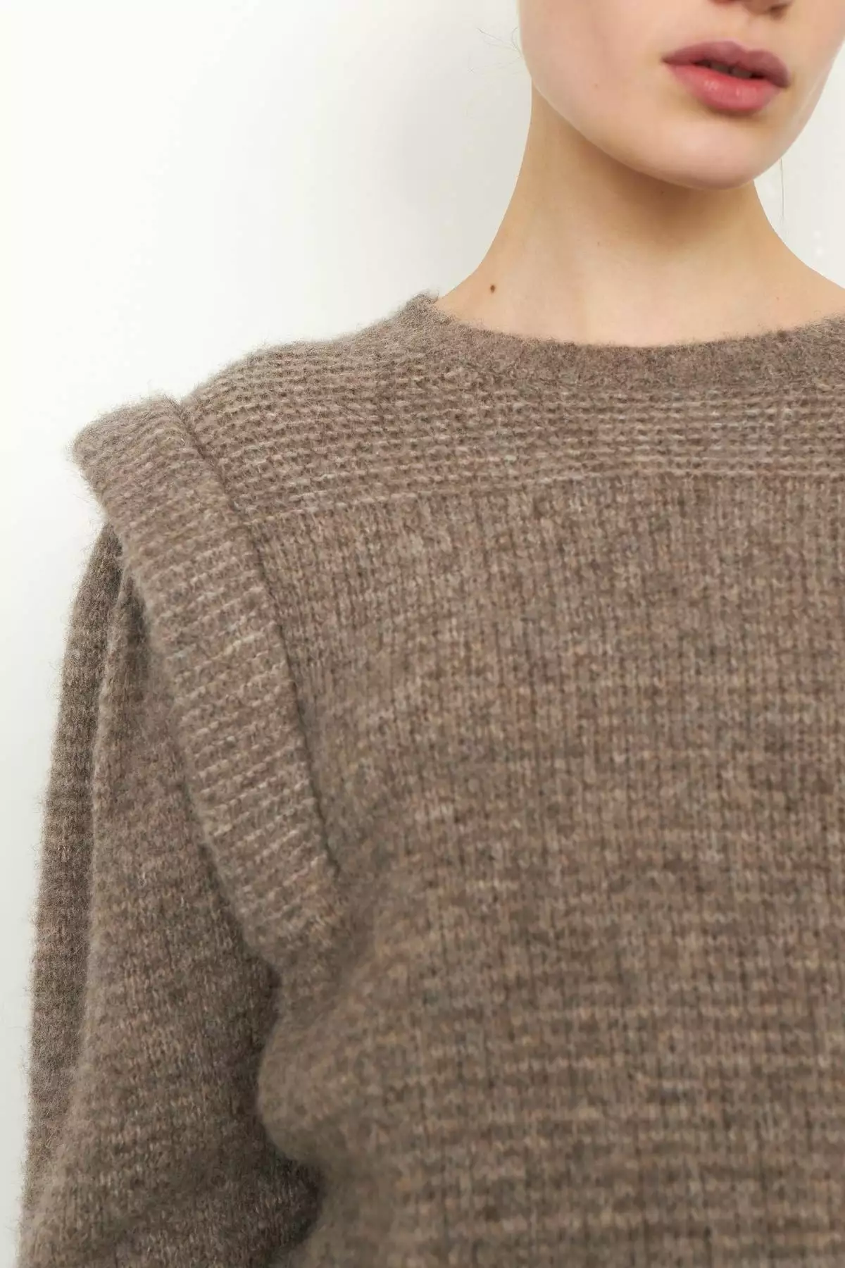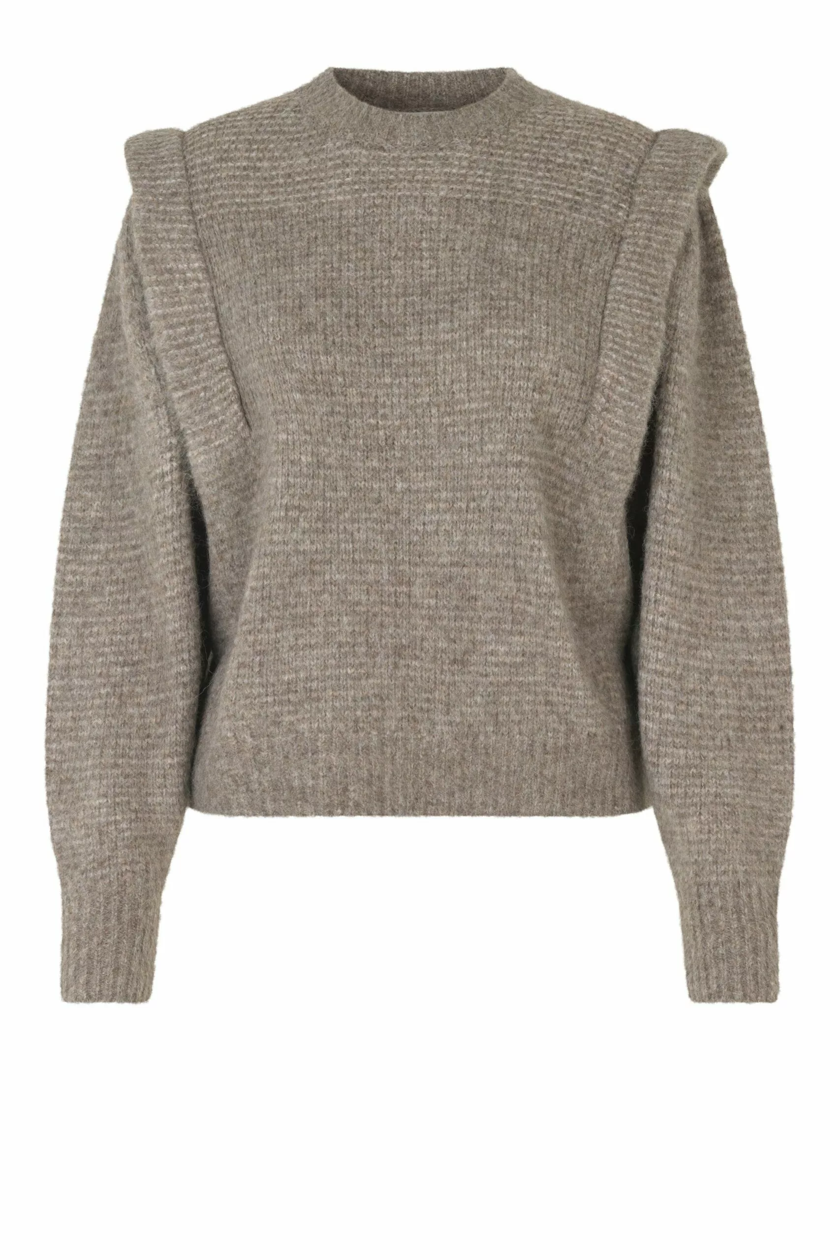 Abby Knit O-Neck fra Second Female. En superfin statement strikk laget i en myk, alpakka og ullblandingskvalitet. Strikken har fint vrangbord rundt den avrundede halsen, mansjettene og nederkant. Den har brede, unike skulderdetaljer, voluminøse ermer og vanlig passform.