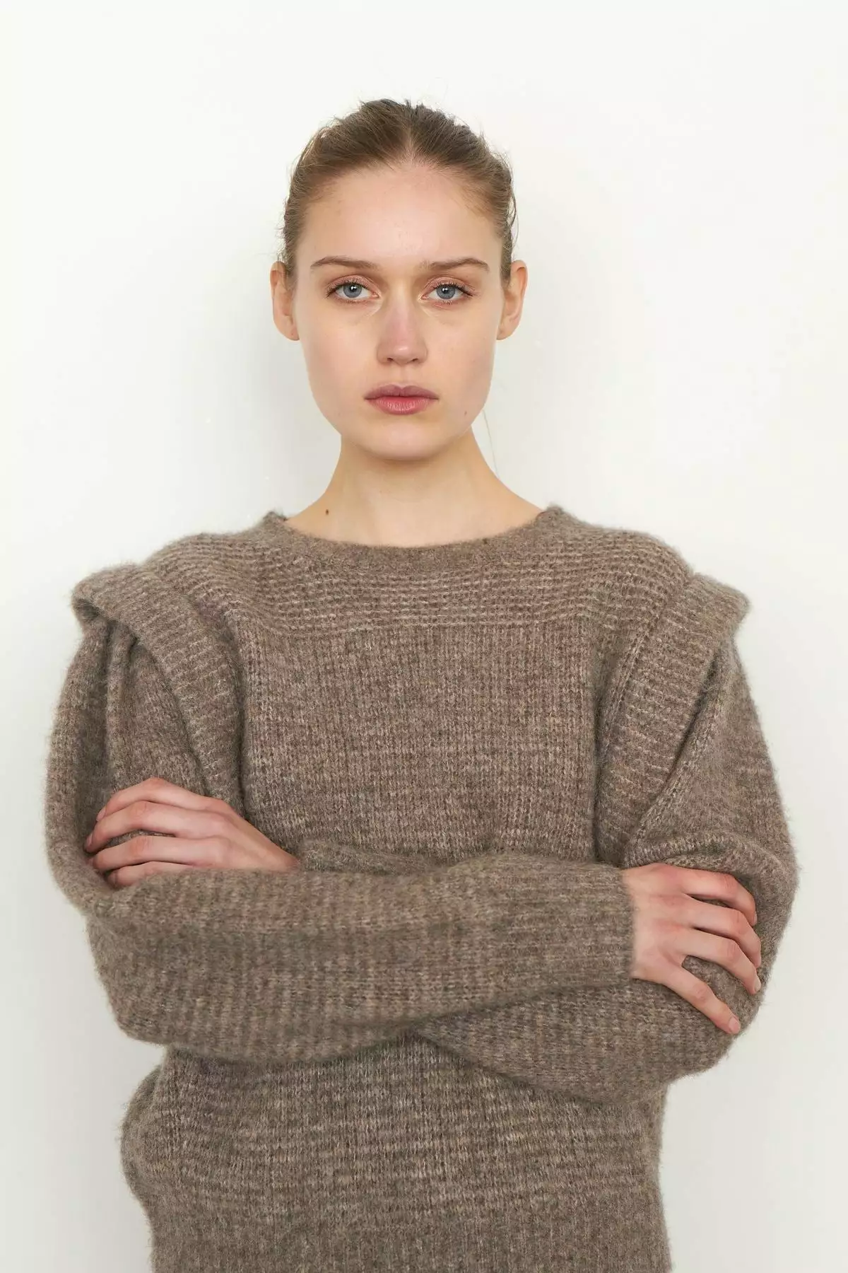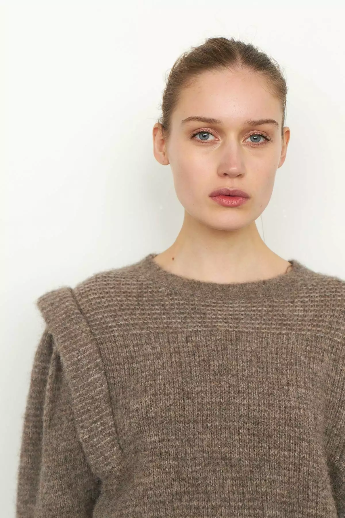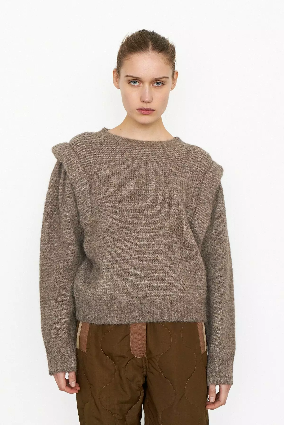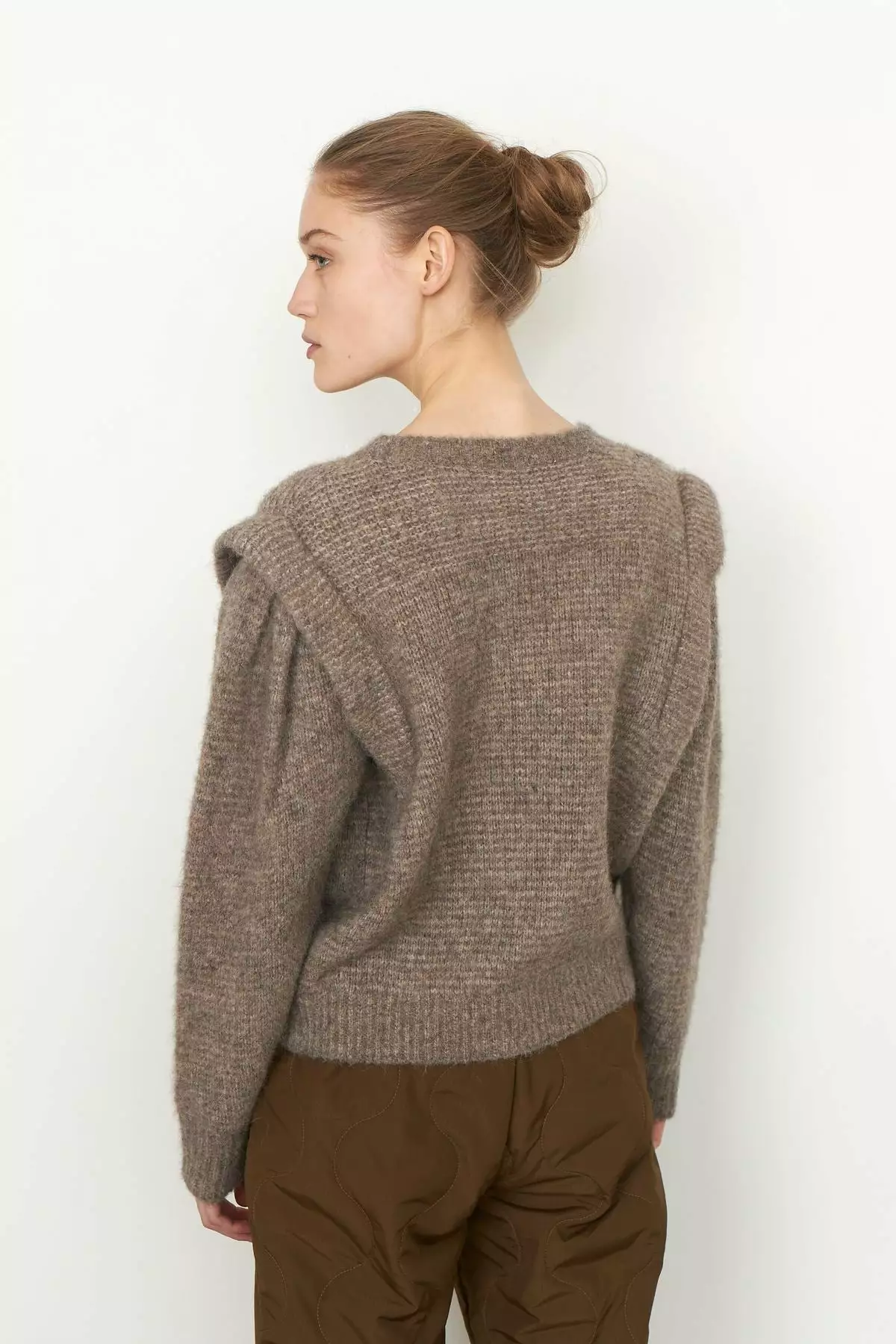 Abby Knit O-Neck fra Second Female. En superfin statement strikk laget i en myk, alpakka og ullblandingskvalitet. Strikken har fint vrangbord rundt den avrundede halsen, mansjettene og nederkant. Den har brede, unike skulderdetaljer, voluminøse ermer og vanlig passform.