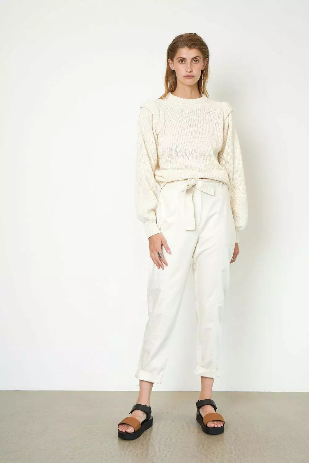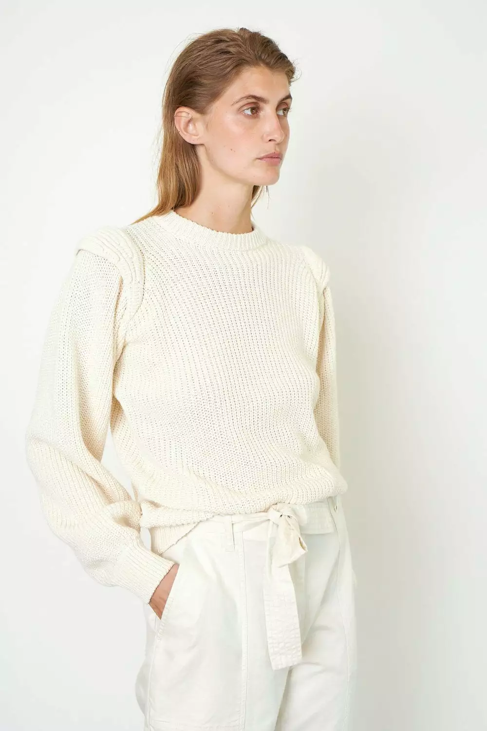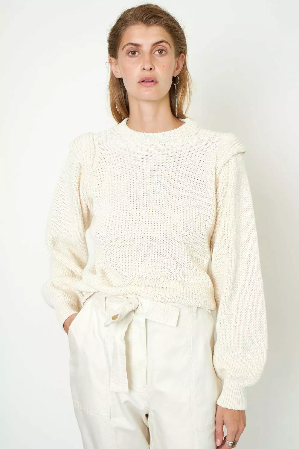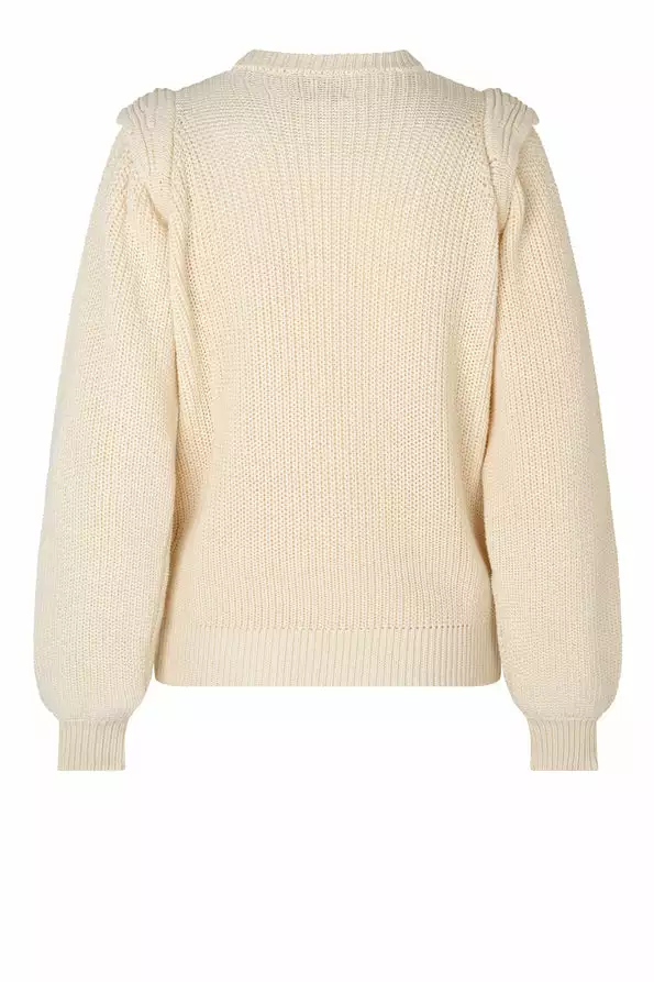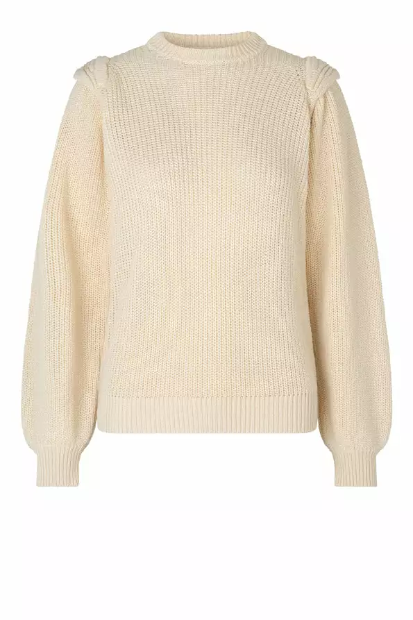 Amalia Knit O-Neck fra Second Female. Denne strikken er laget i en vakker bomullskvalitet. Den har fine ribber langs den avrundede halsen, mansjetten og nederkant. Strikken har unik skulderdetalj, volumiserte ermer og vanlig passform.
