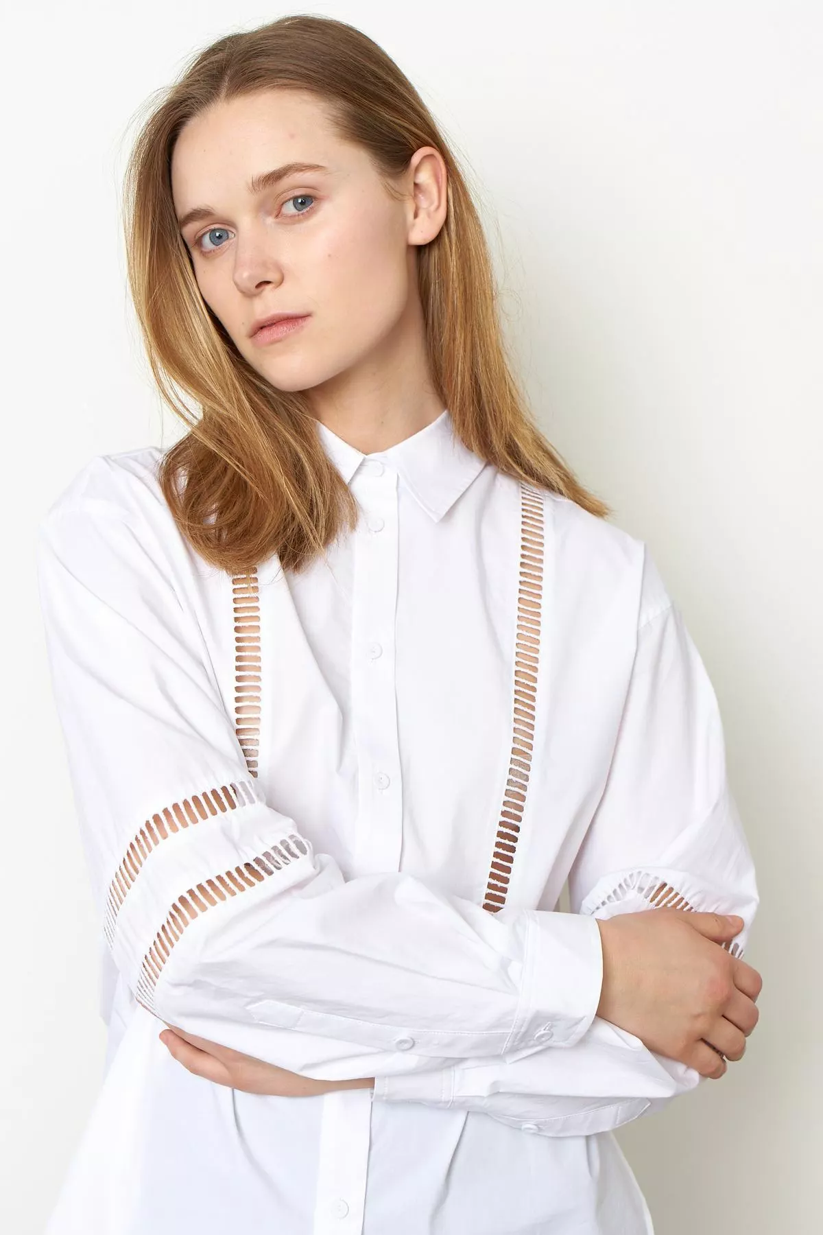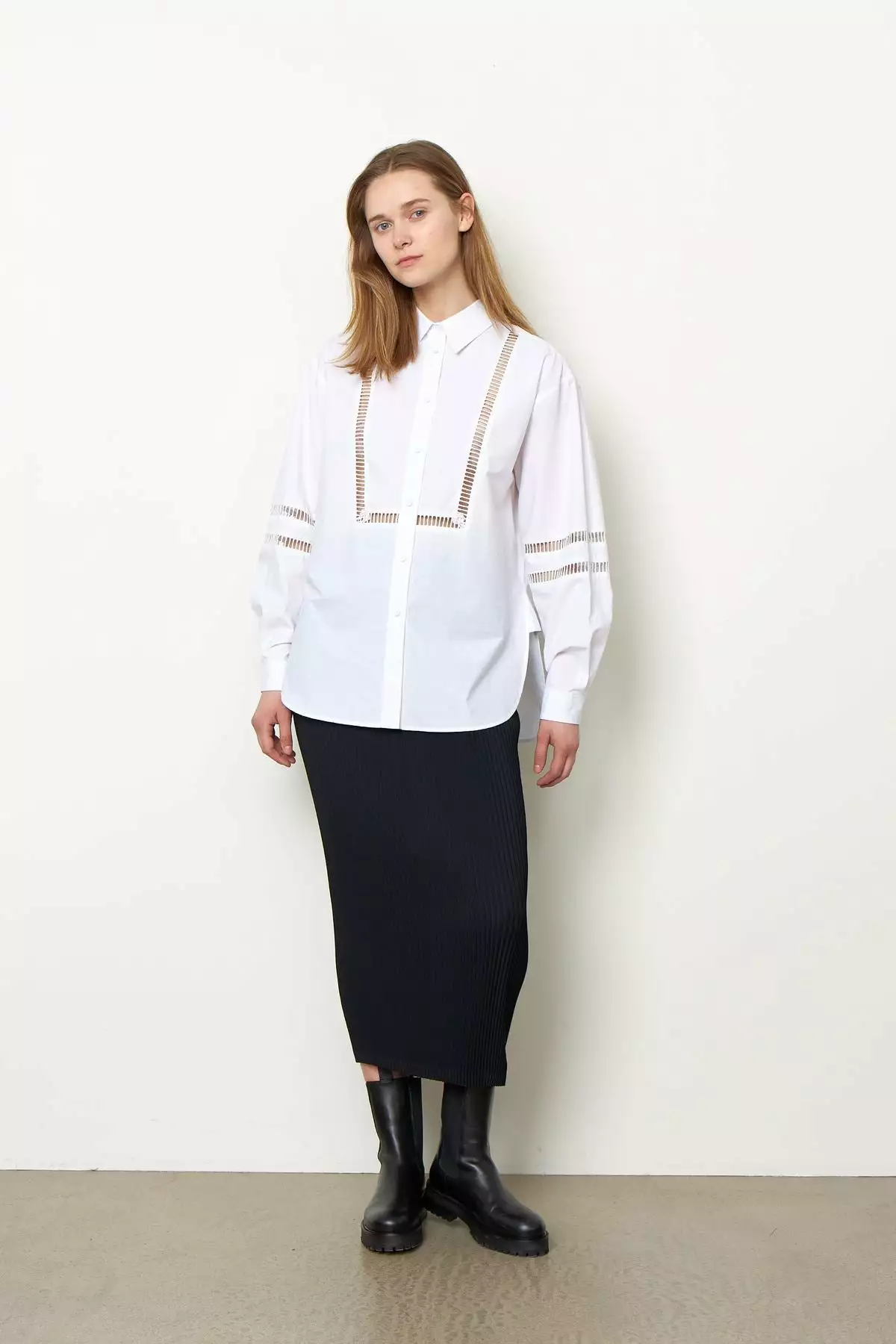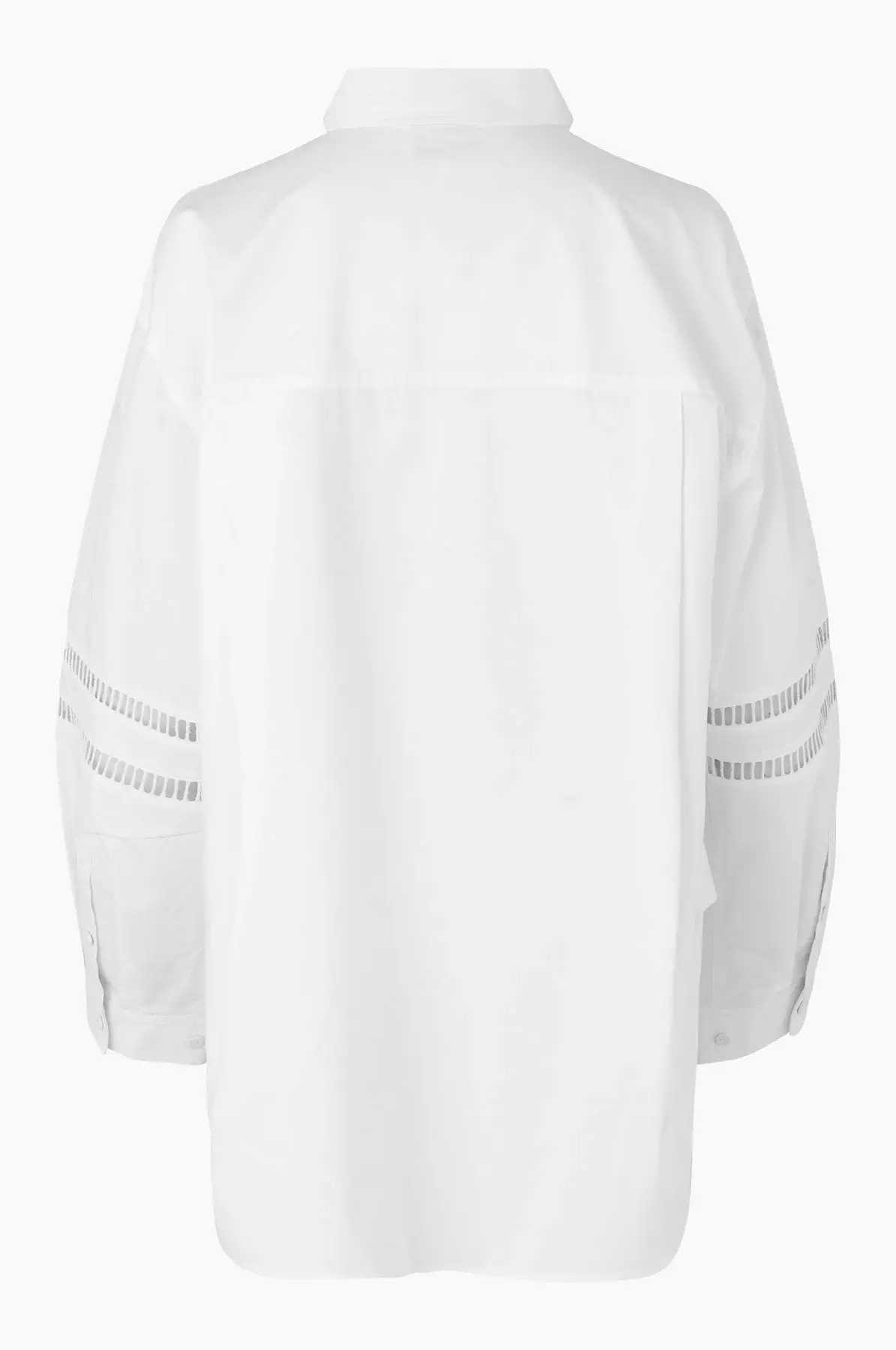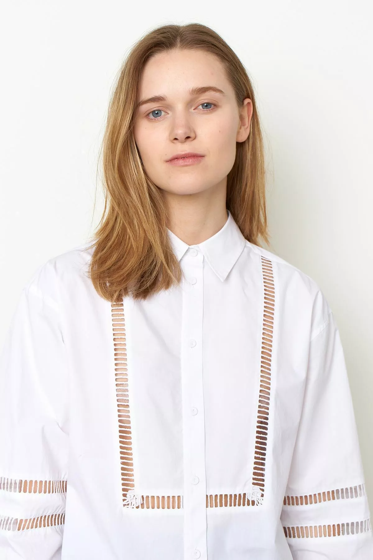 Arkin Shirt fra Second female. Unik skjorte laget i en 100% sprø, økologisk bomullskvalitet. Skjorten har klassisk krage og knapper i frontåpning. Den har unike hull-detaljer foran og på ermer. Skjorten har vanlige ermer med klassiske mansjetter og knappelukking.