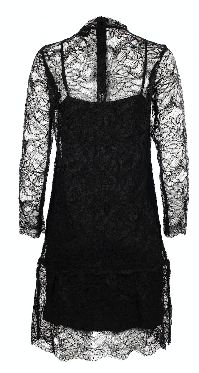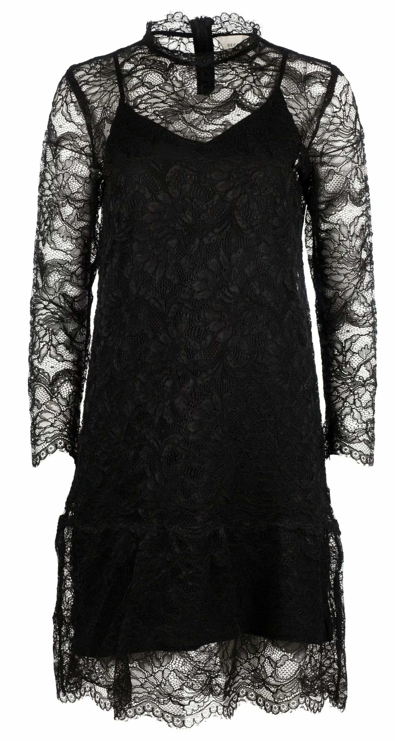 Lekker svart blondekjole fra Second Female. Den er langermet, perfekt til sesongens festligheter. Lukkes med glidelås bak. Underkjole følger med.
