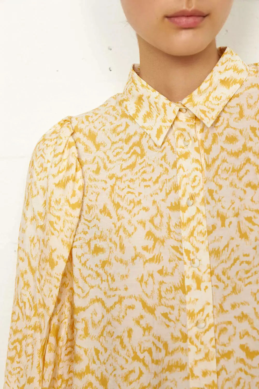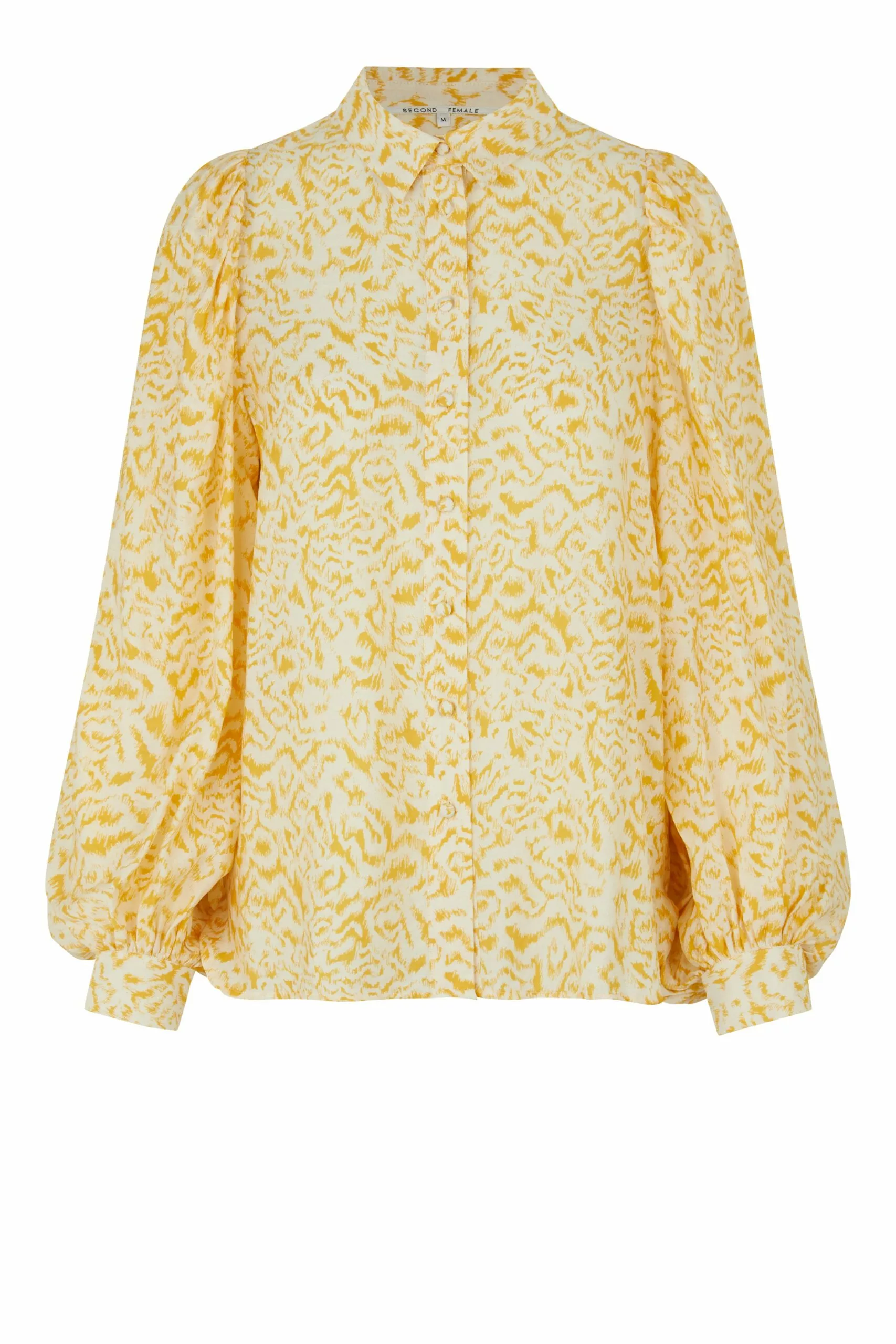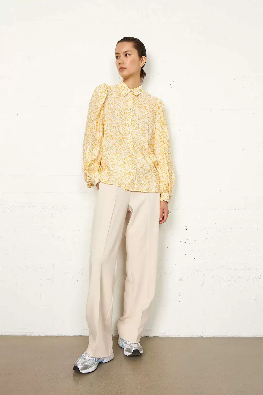 Belladonna Shirt fra Second Female. Belladonna Shirt har kortere, avrundede splitter i sidene, klassisk skjortekrage og stolpe med synlige knapper. Ermene er lange og har rynker på både skulder og mansjetter. Mansjettene kan åpnes på baksiden hvor det er splitt og knappelukking.