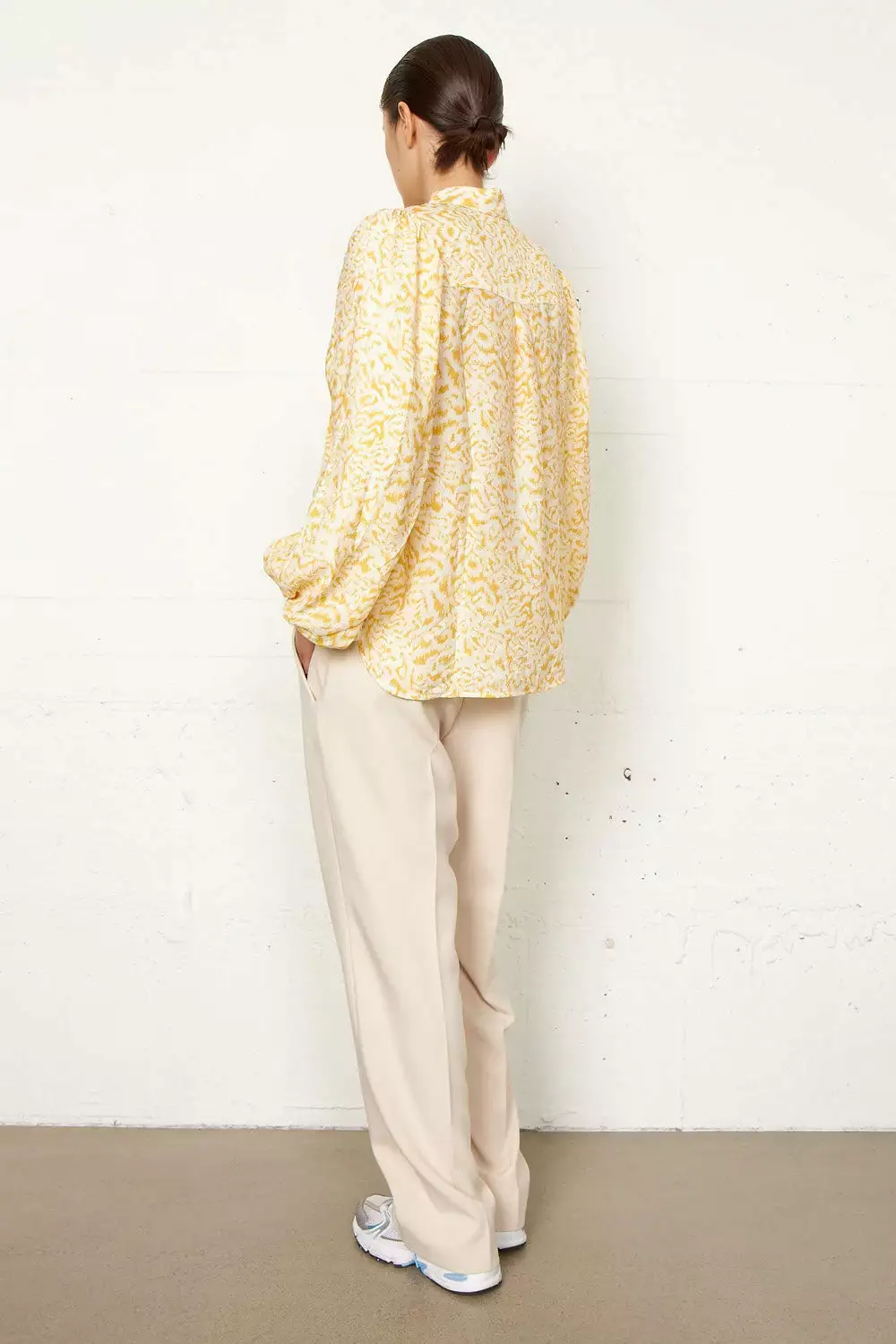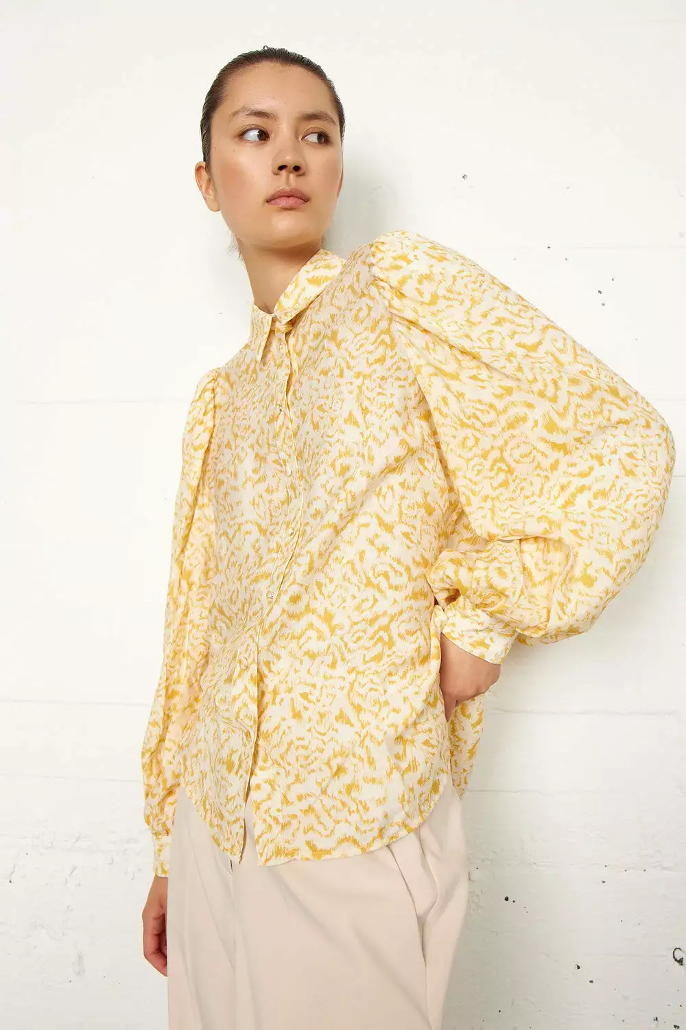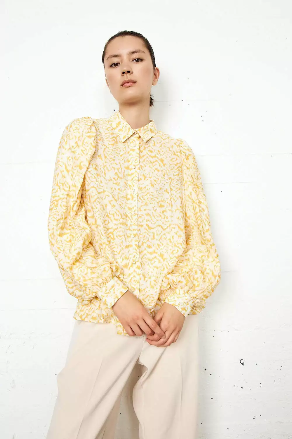 Belladonna Shirt fra Second Female. Belladonna Shirt har kortere, avrundede splitter i sidene, klassisk skjortekrage og stolpe med synlige knapper. Ermene er lange og har rynker på både skulder og mansjetter. Mansjettene kan åpnes på baksiden hvor det er splitt og knappelukking.