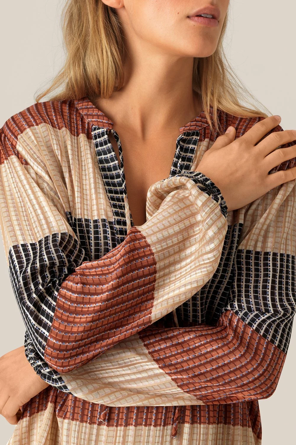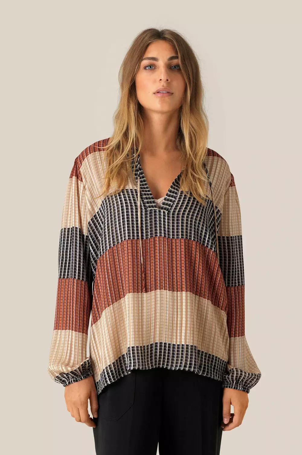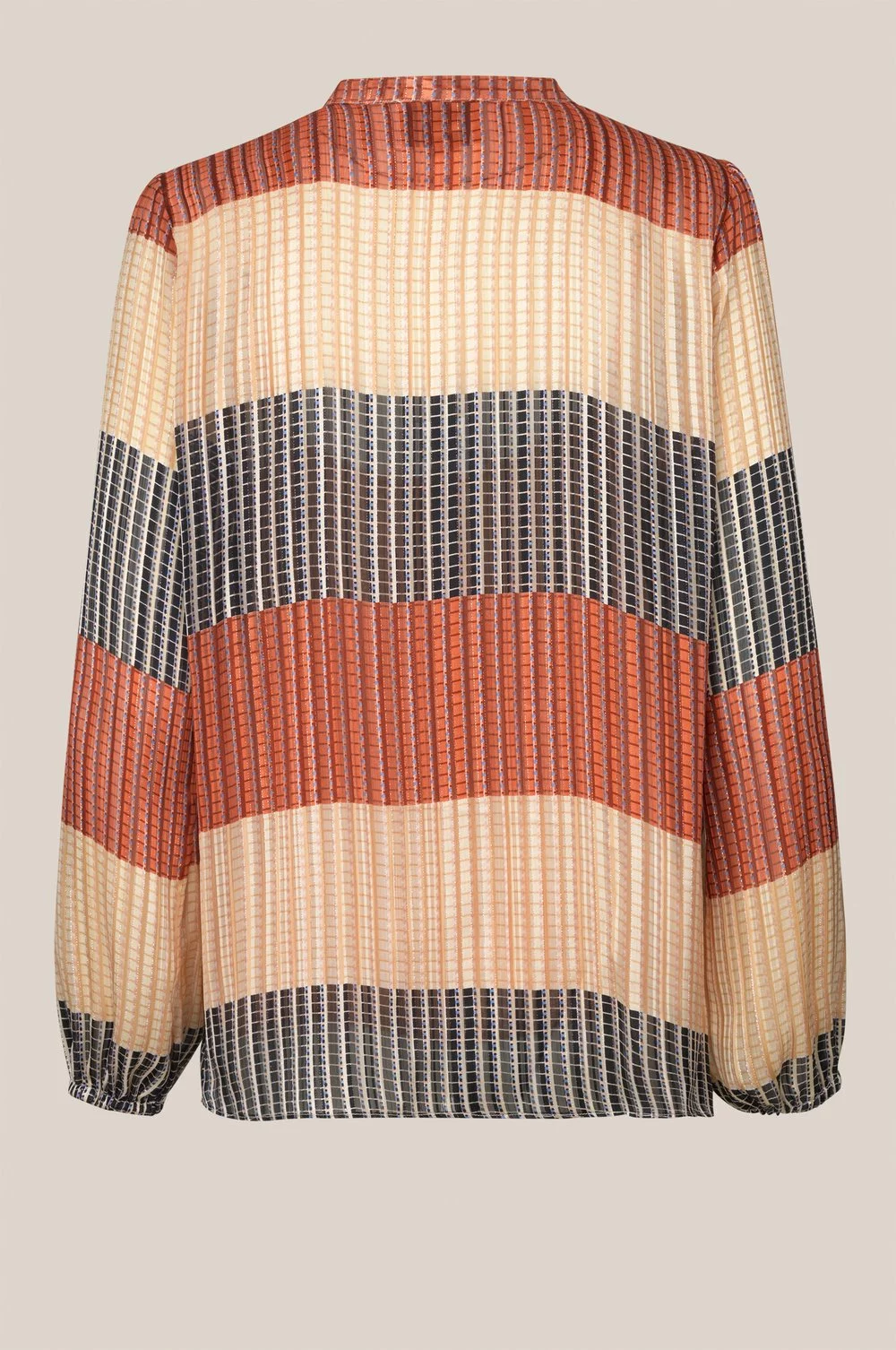 Board LS Blouse fra Second Female er laget i et stripete polyester stoff med sølvtråder. Toppen har høy hals med knyting i halsen. Dyp v-hals og lave skuldre. Puffy ermer med strikk nederst. Blusen er i en standard og casual passform.