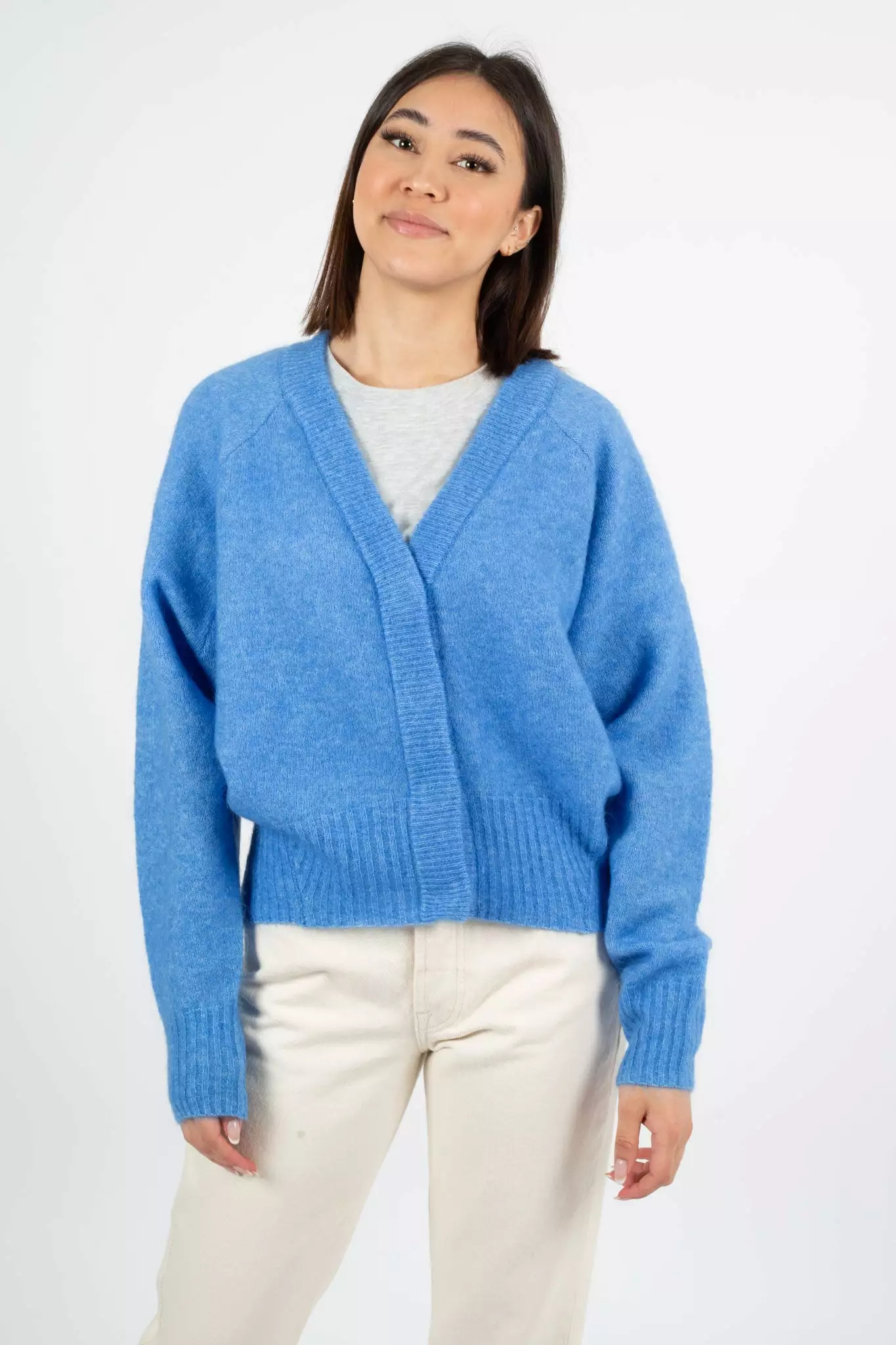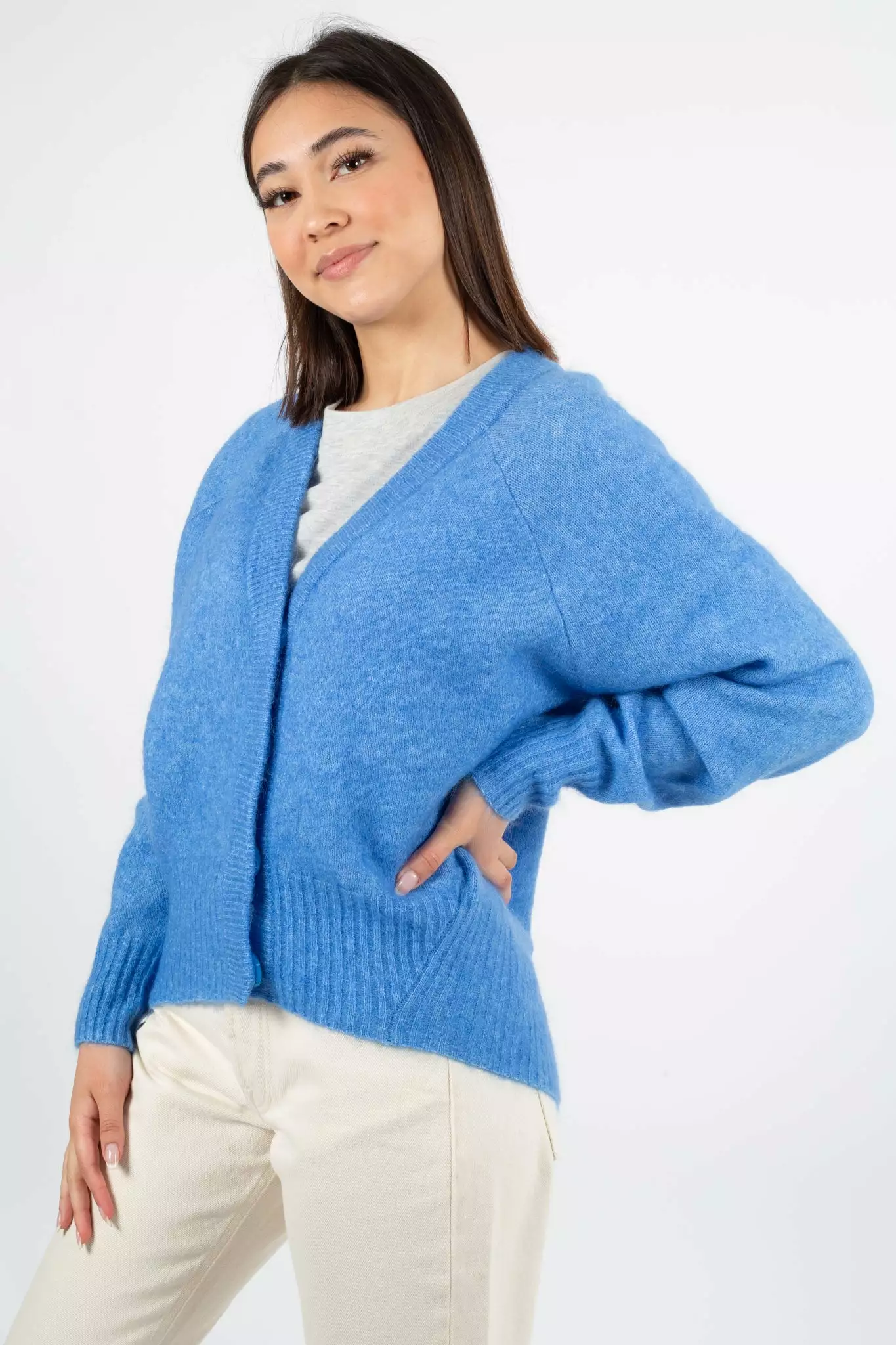 Brook Knit Boxy Cardigan fra Second Female. Deilig og varm cardigan med boxy passform. Genseren har V-hals og vide ermer. Skjulte knapper i front. Perfekt å slenge over kjolen i sommer!