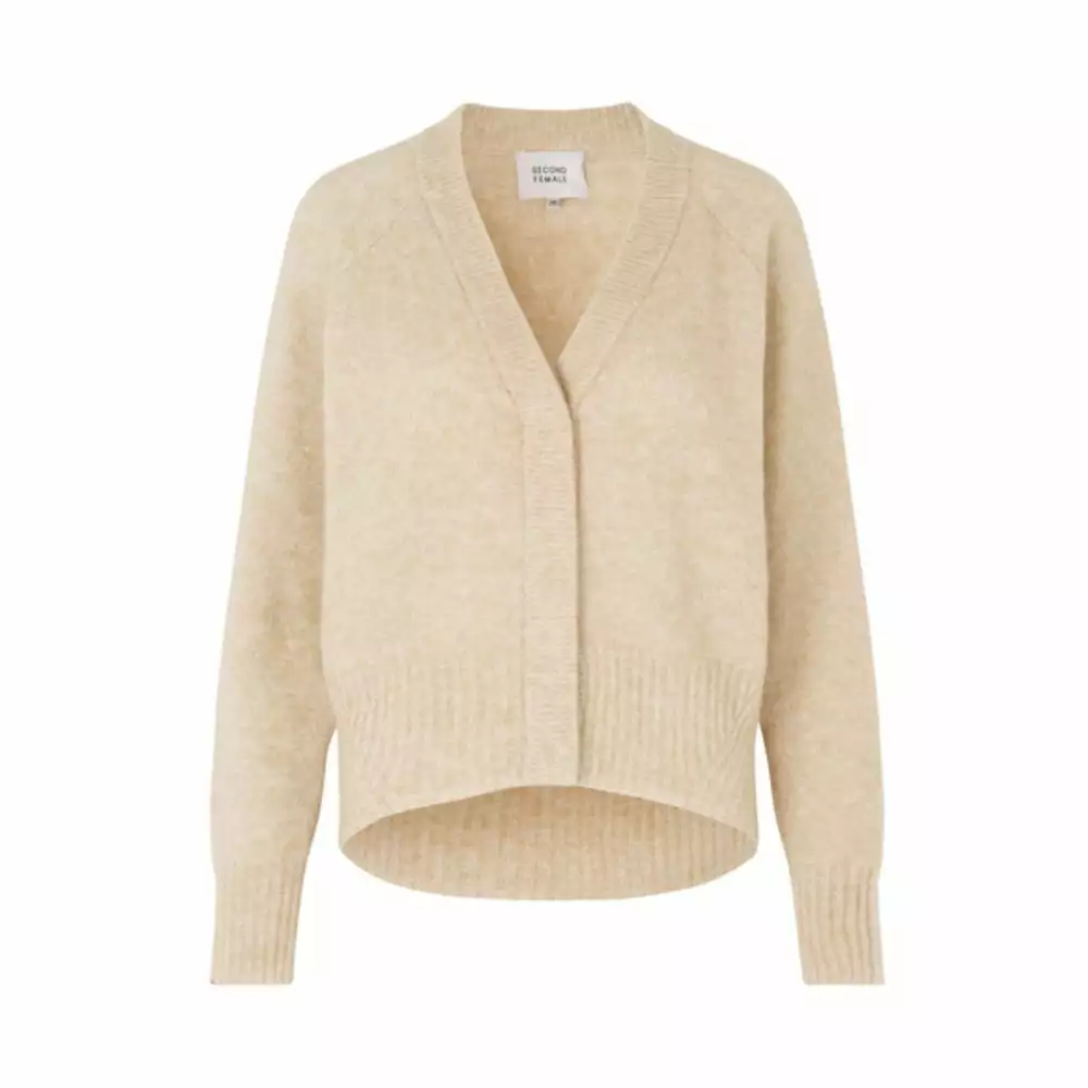Brook Knit Boxy Cardigan fra Second Female. Deilig og varm cardigan med boxy passform. Genseren har V-hals og vide ermer. Skjulte knapper i front. Perfekt å slenge over kjolen i sommer!