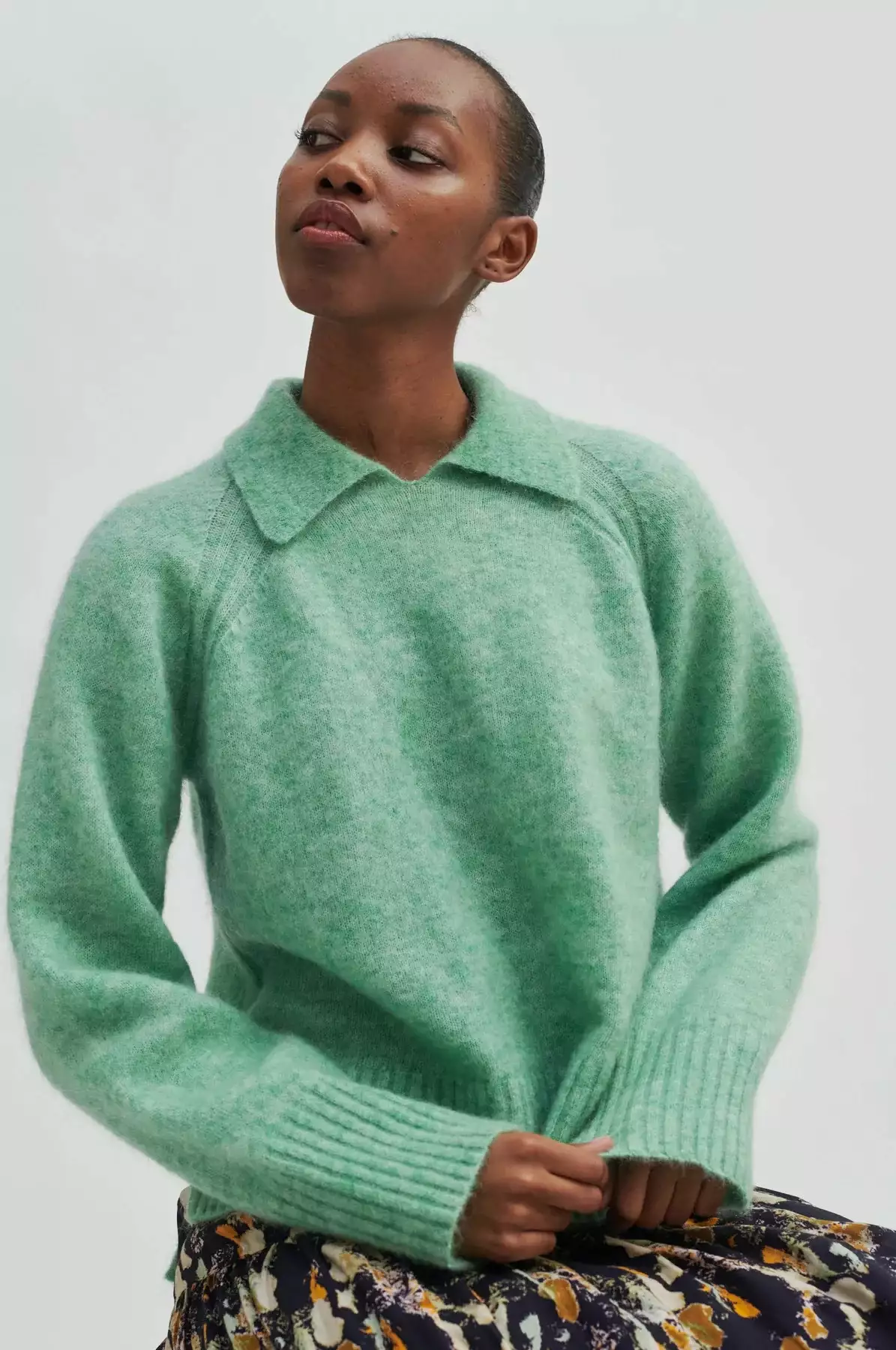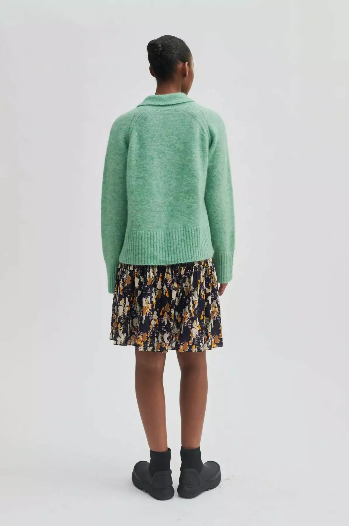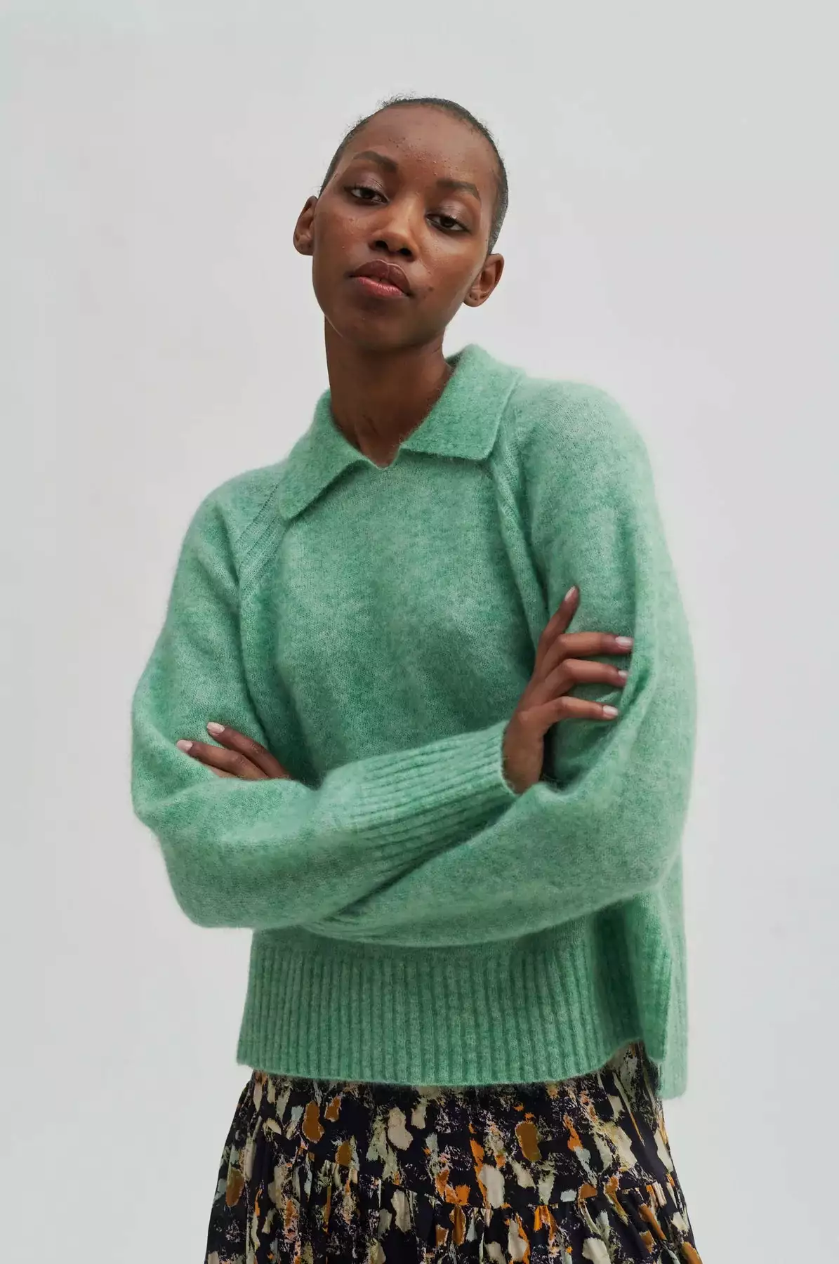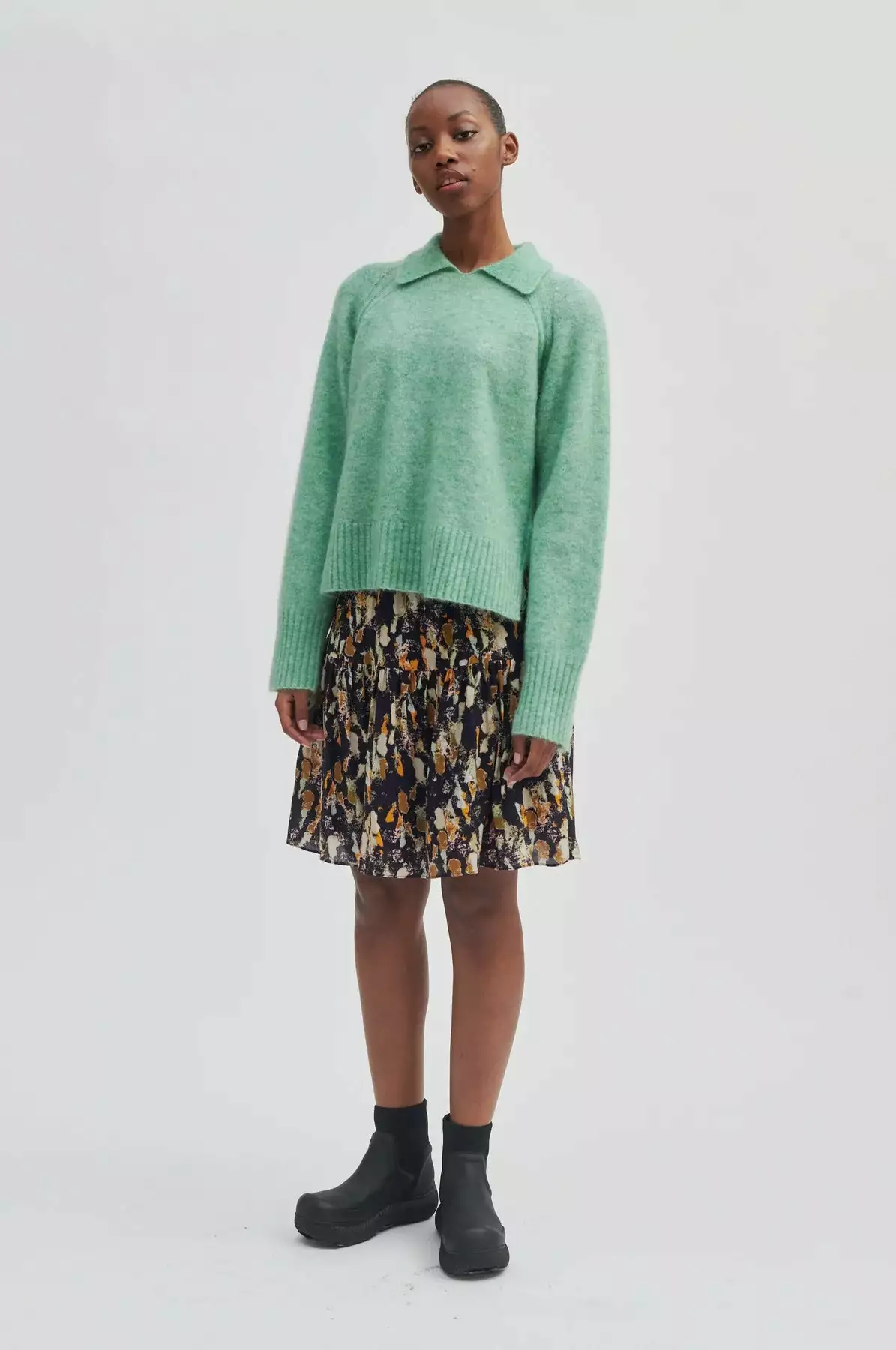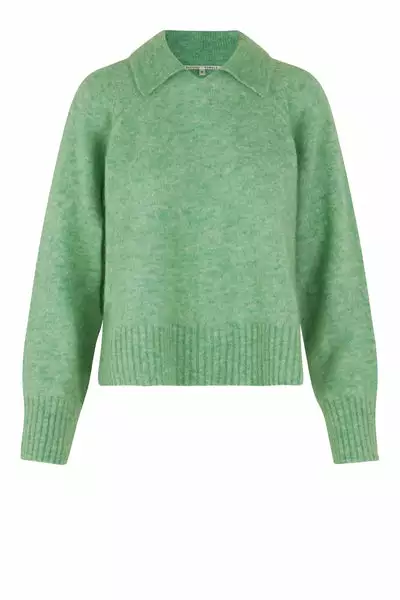 Brook Knit Collar fra Second Female. Deilig strikkegenser i en nydelig grønnfarge. Genseren har lange ermer, krage og ribbestrikkede mansjetter. Bruk den gjerne til bukse, eller over en kjole.