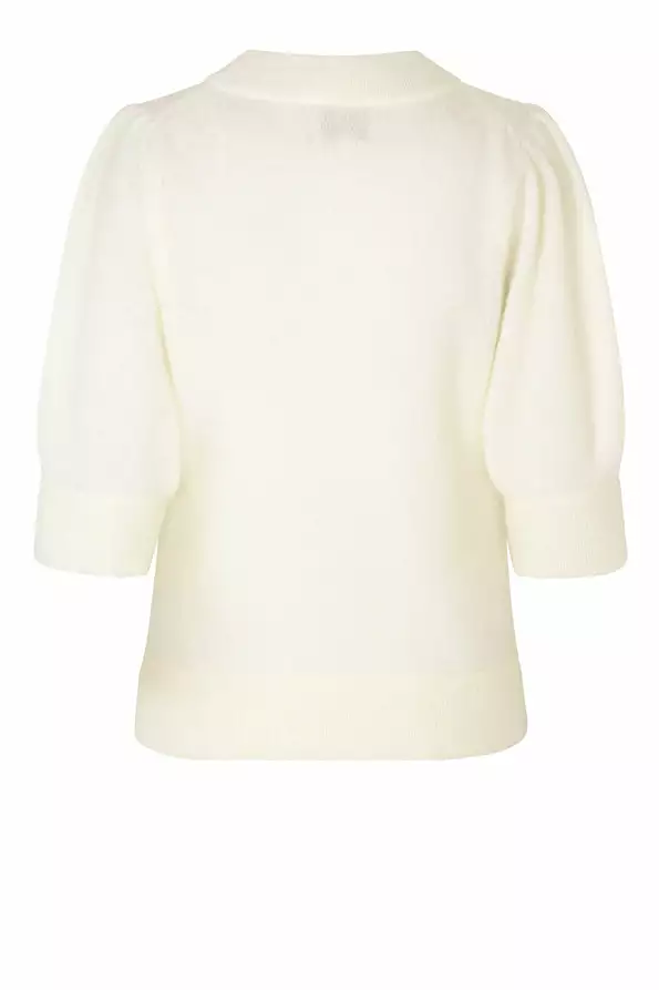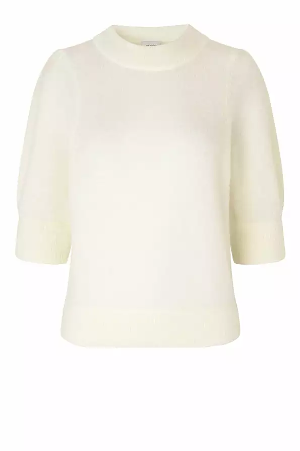 Brook Knit Puff SS fra Second Female. En superdeilig strikkegenser for vÄren!  Genseren har rund hals, 3/4 lange ermer og puffende skuldre. Rett og avslappet i fasongen. Ribbestrikket kant pÄ hals, ending av erm og i kant