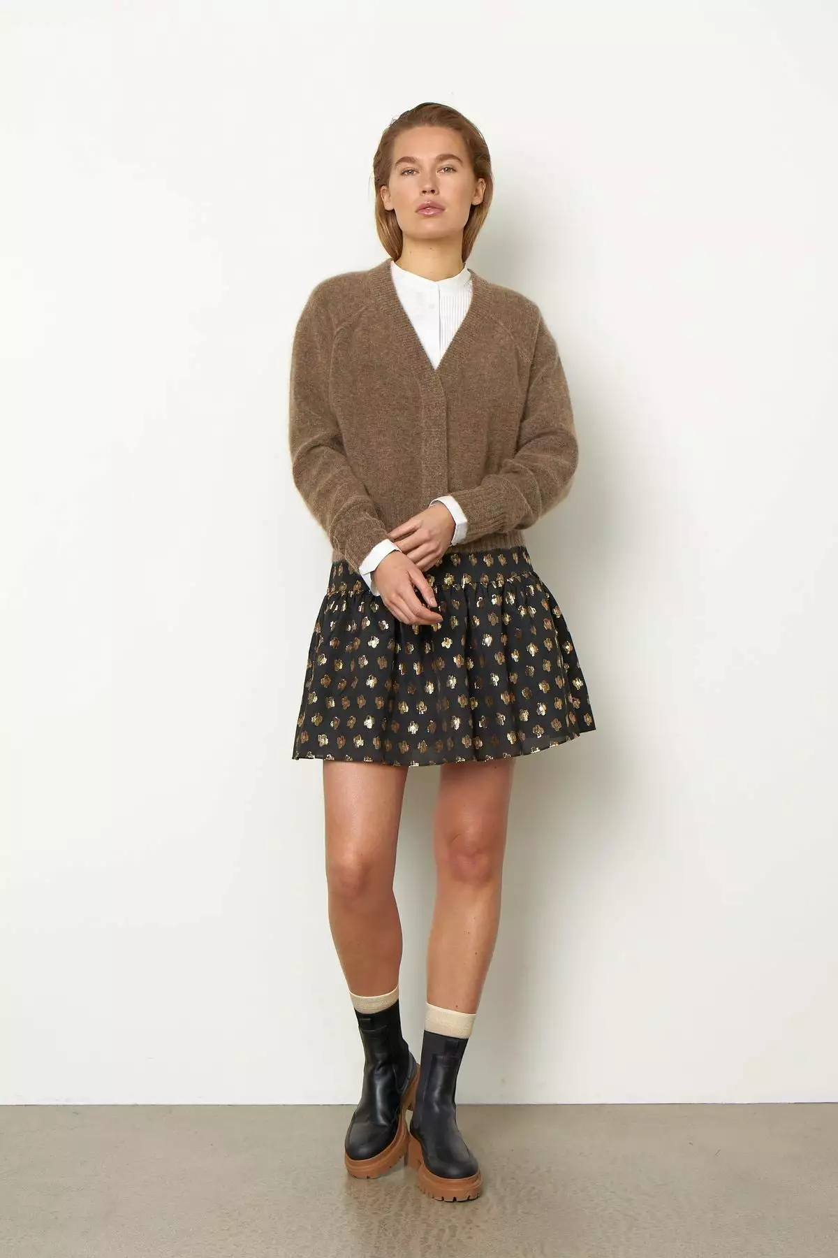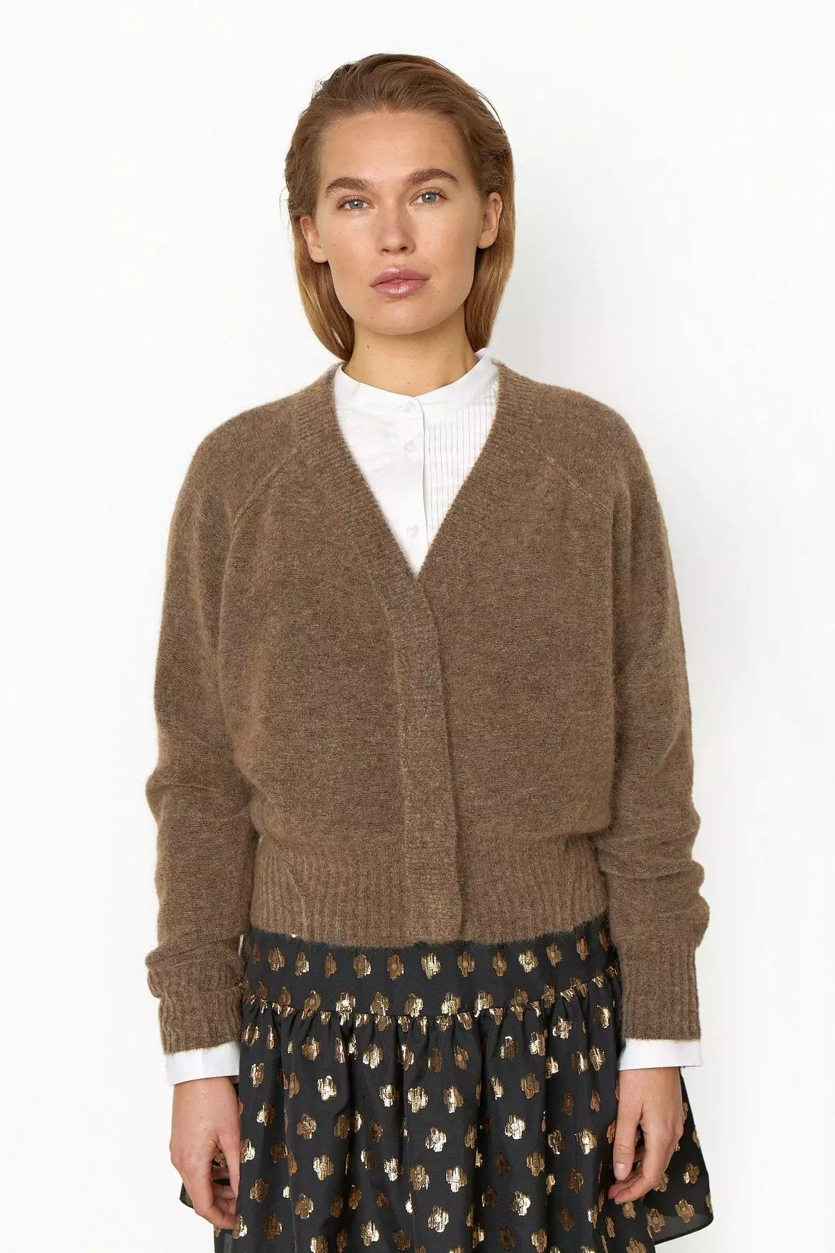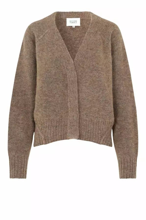 Brook Knit Reverse Boxy Cardigan fra Second Female. Boxy cardigan laget i en sertifisert, myk mohair- og ullblandingskvalitet. Cardiganen har fin vrangbord langs den dype V-utringningen, åpning foran, kant og mansjett. Den har skjulte trykknapper. Cardiganen har raglanermer og strikkede detaljer. Denne stilen er en nødvendig garderobe!