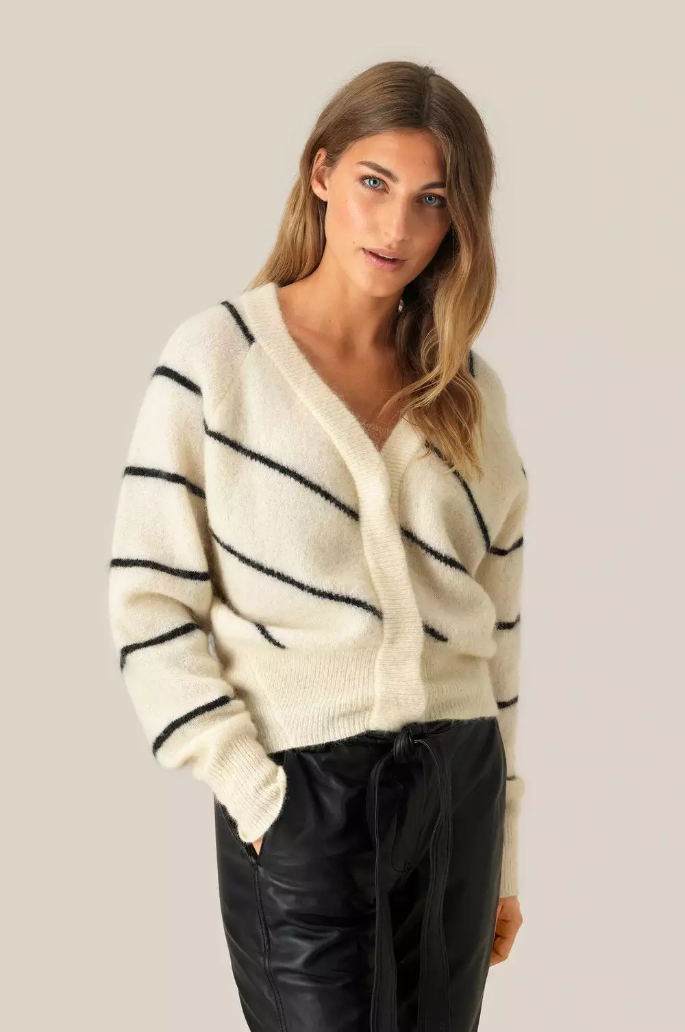 Fin stripete cardigan fra Second Female. Supermyk genser med v-hals og skjulte knapper. Den er litt lengre bak, men har boxy passform.