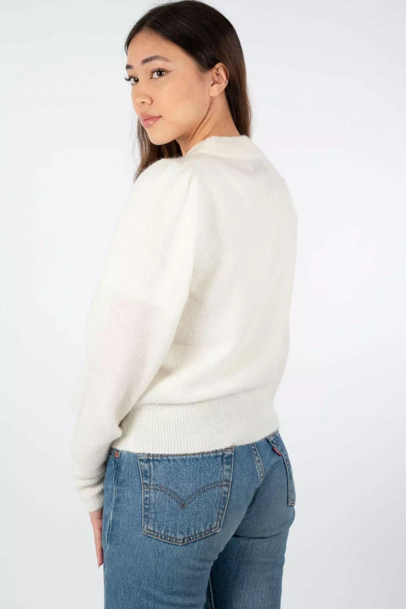 Brook Knit Volumen O-Neck fra Second Female. Nydelig genser i myk mohair og ull-blanding. Delikat ribbkant ved halsen, på kanten og langs kanten på ermene. Voluminøse ermer.