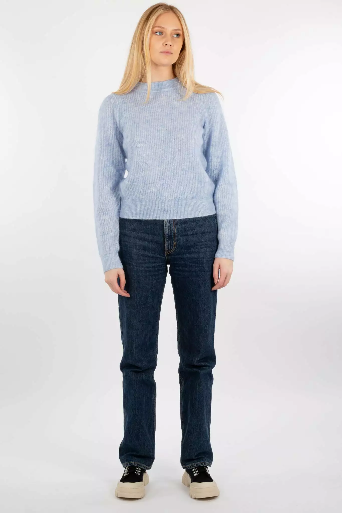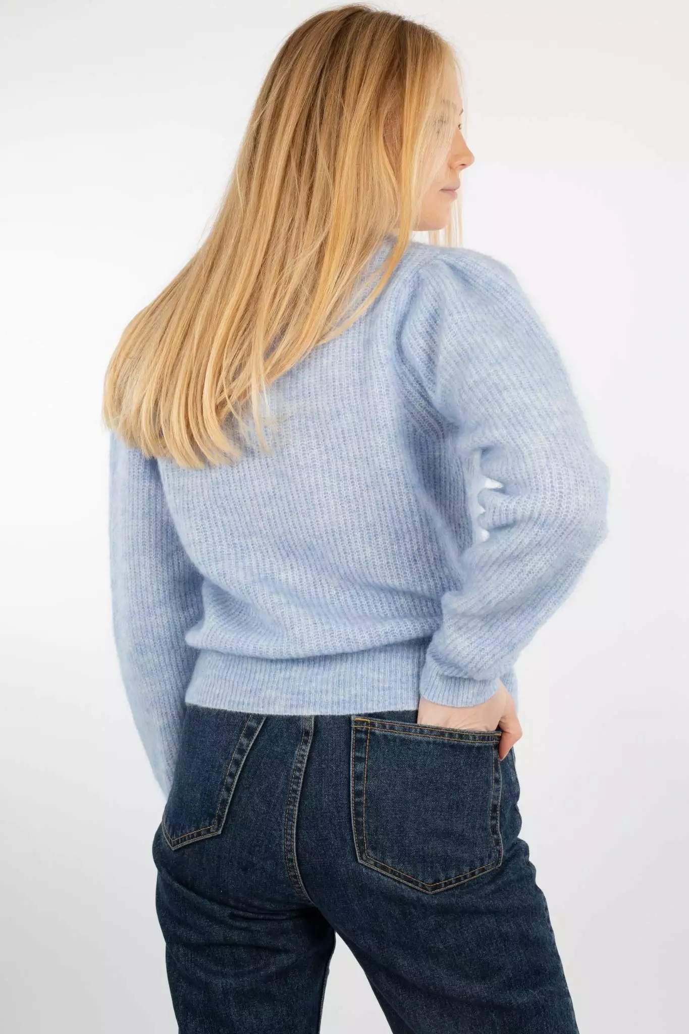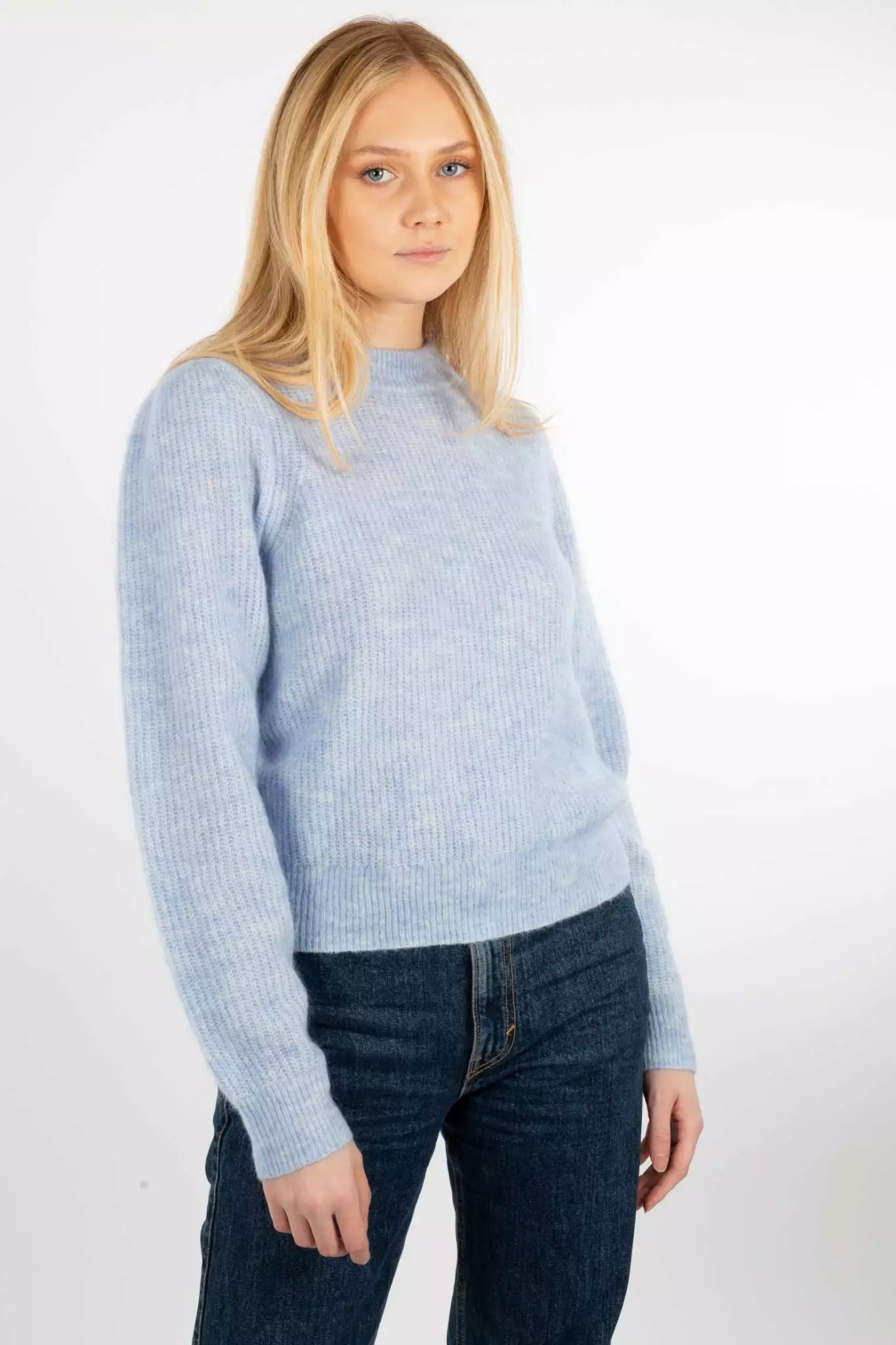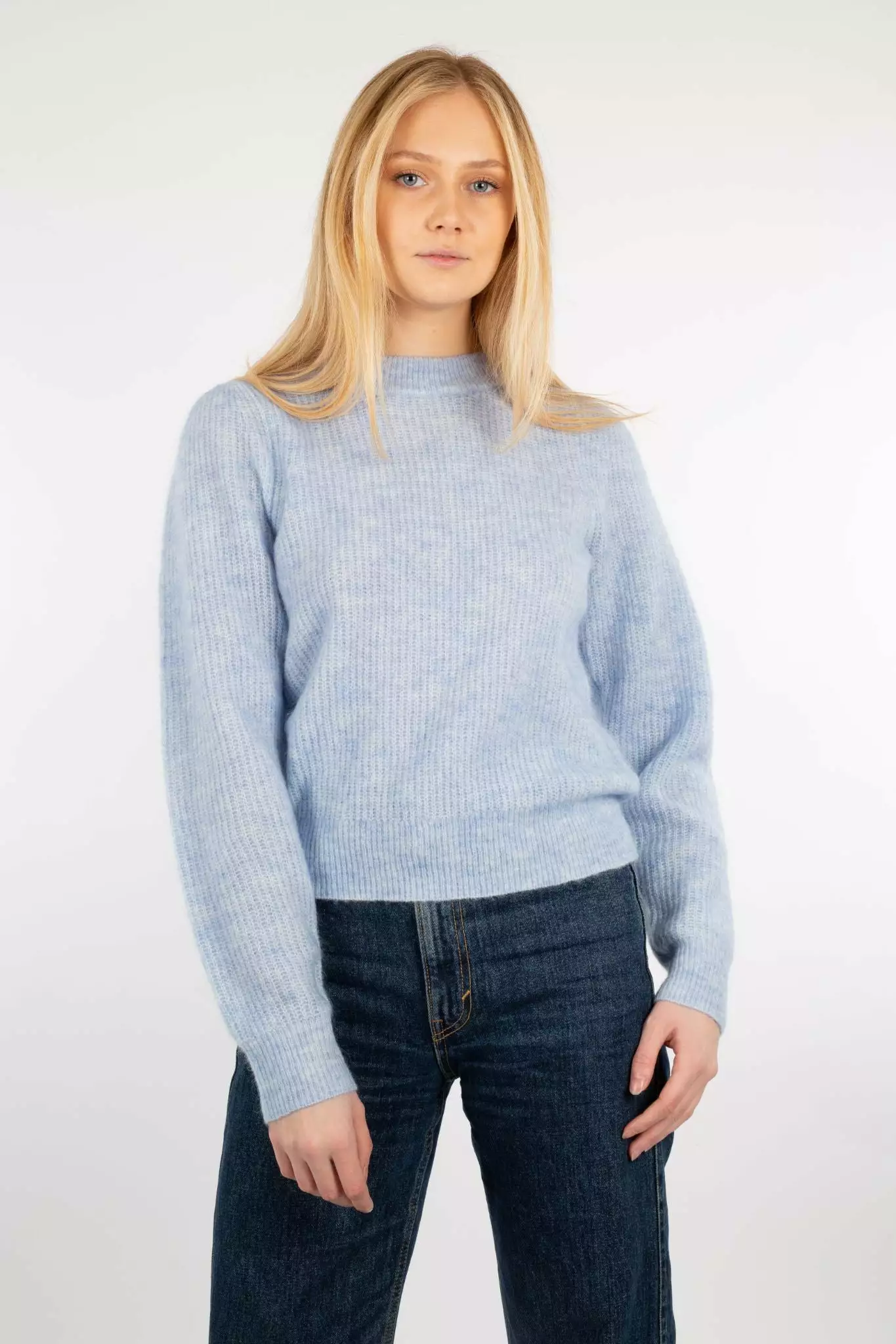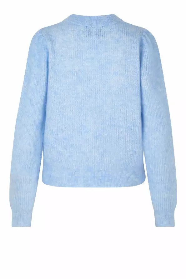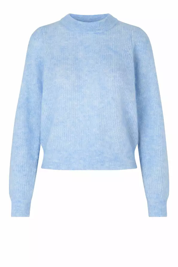Brooky Knit Puff O-Neck fra Second Female. Deilig og var strikkegenser laget i myk mohair- og ullblanding. Genseren har tjukk kant rundt hals, ermer og kant. Regular fit.
