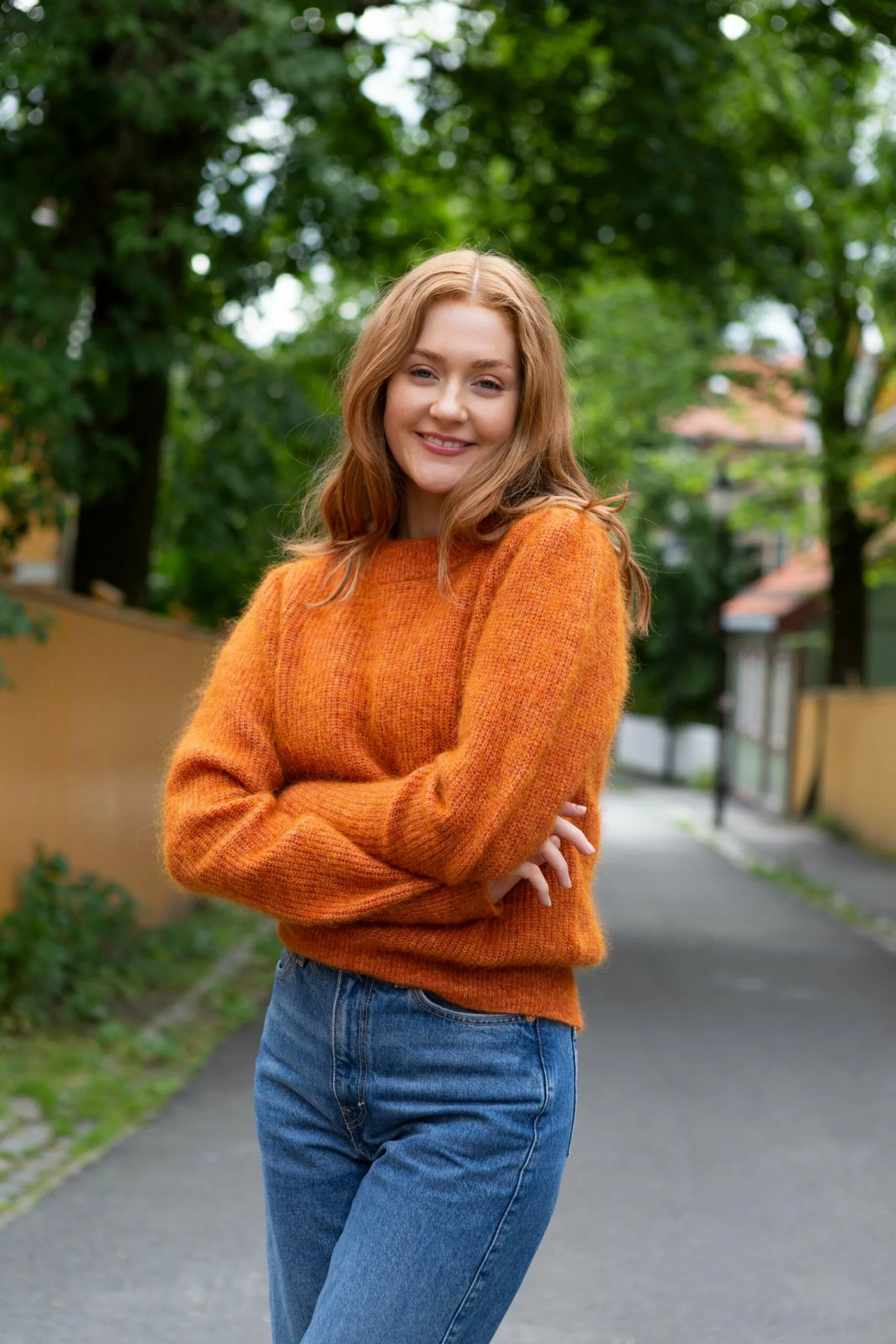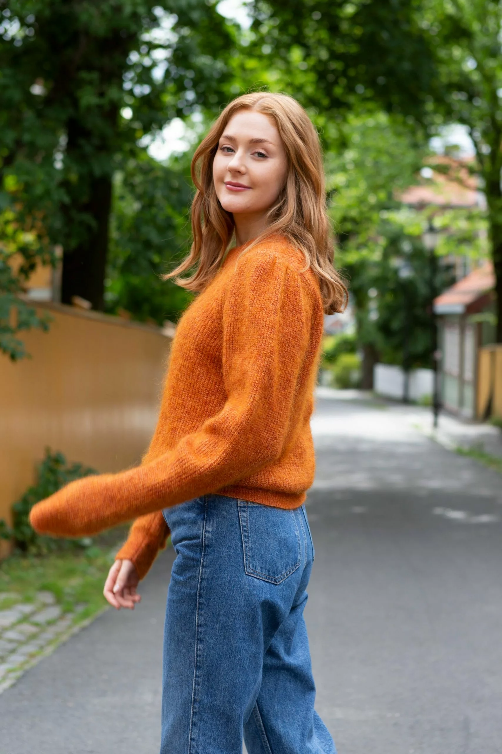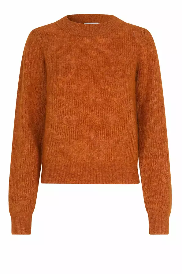 Brooky Knit Puff O-Neck fra Second Female. Deilig og var strikkegenser laget i myk mohair- og ullblanding. Genseren har tjukk kant rundt hals, ermer og kant. Regular fit.