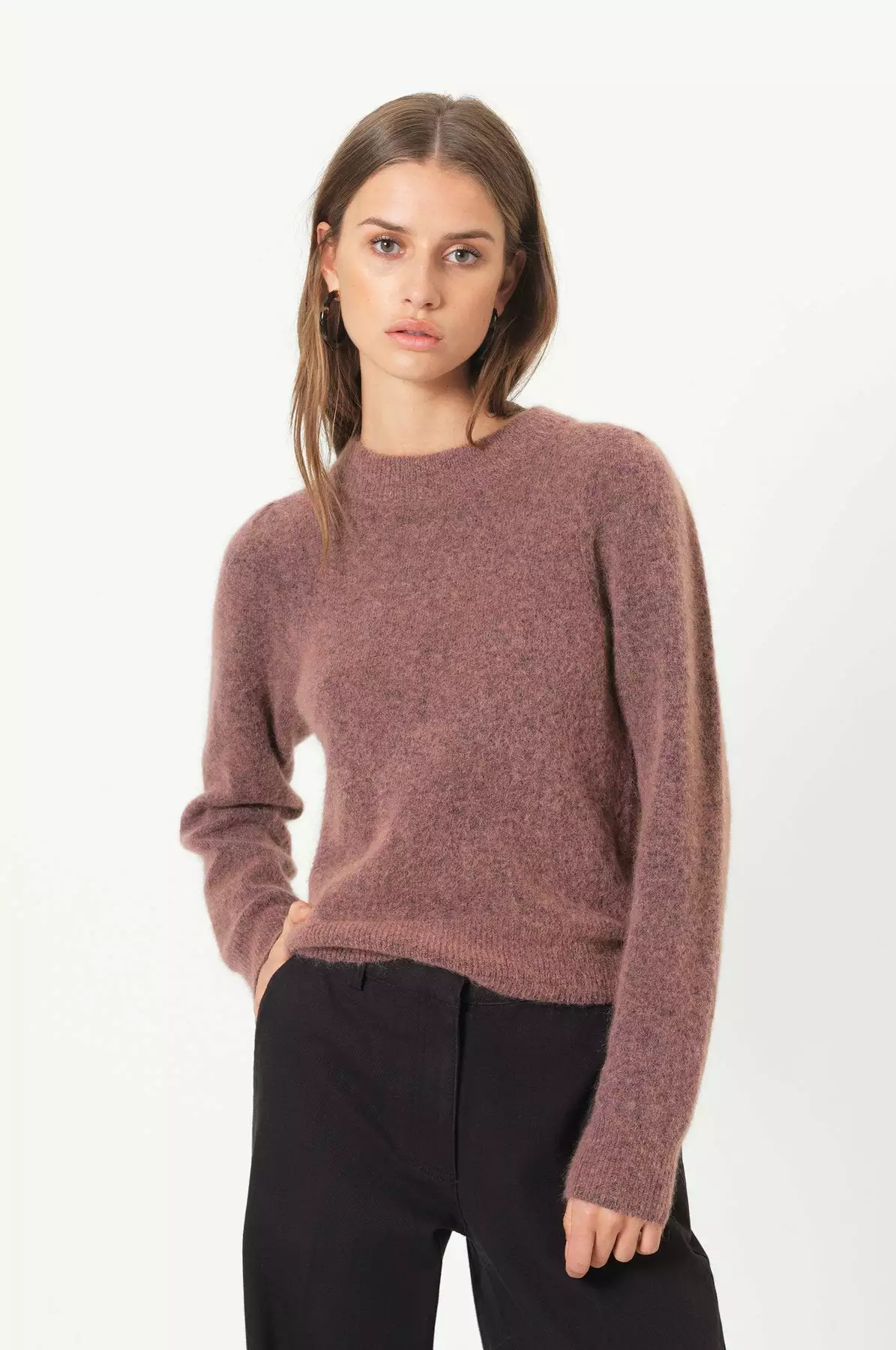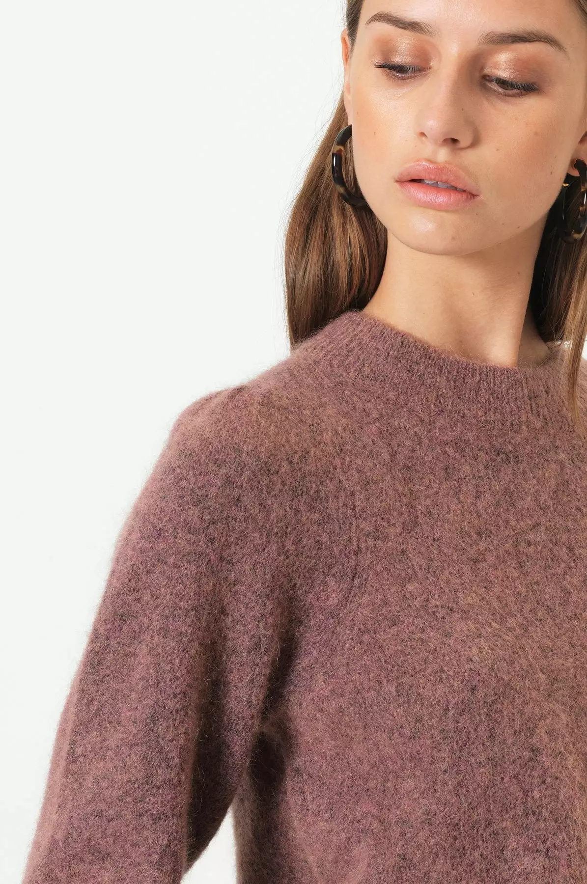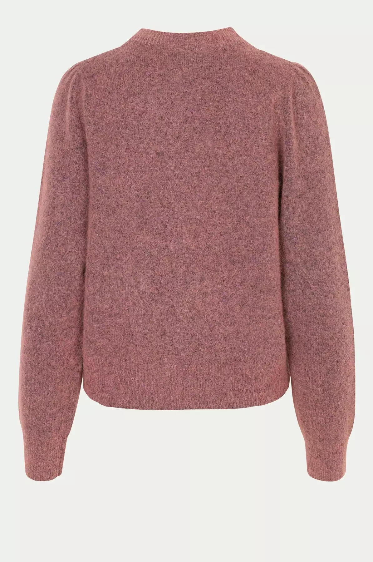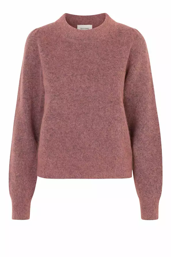 Brooky Knit Volumen O-Neck fra Second Female. Nydelig høstgenser i myk mohair og ull-blanding. Delikat ribkant ved halsen, på kanten og langs kanten på ermene. Voluminøse ermer.