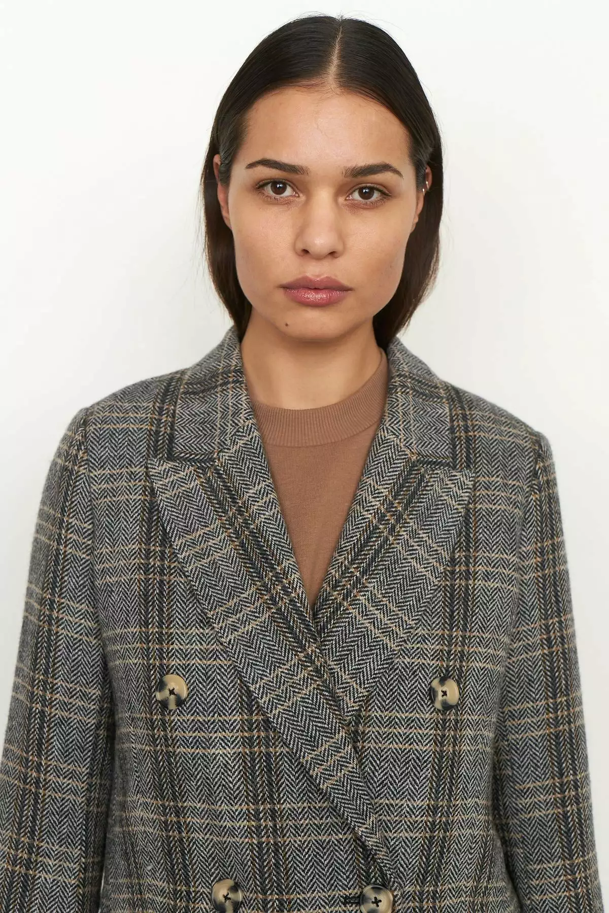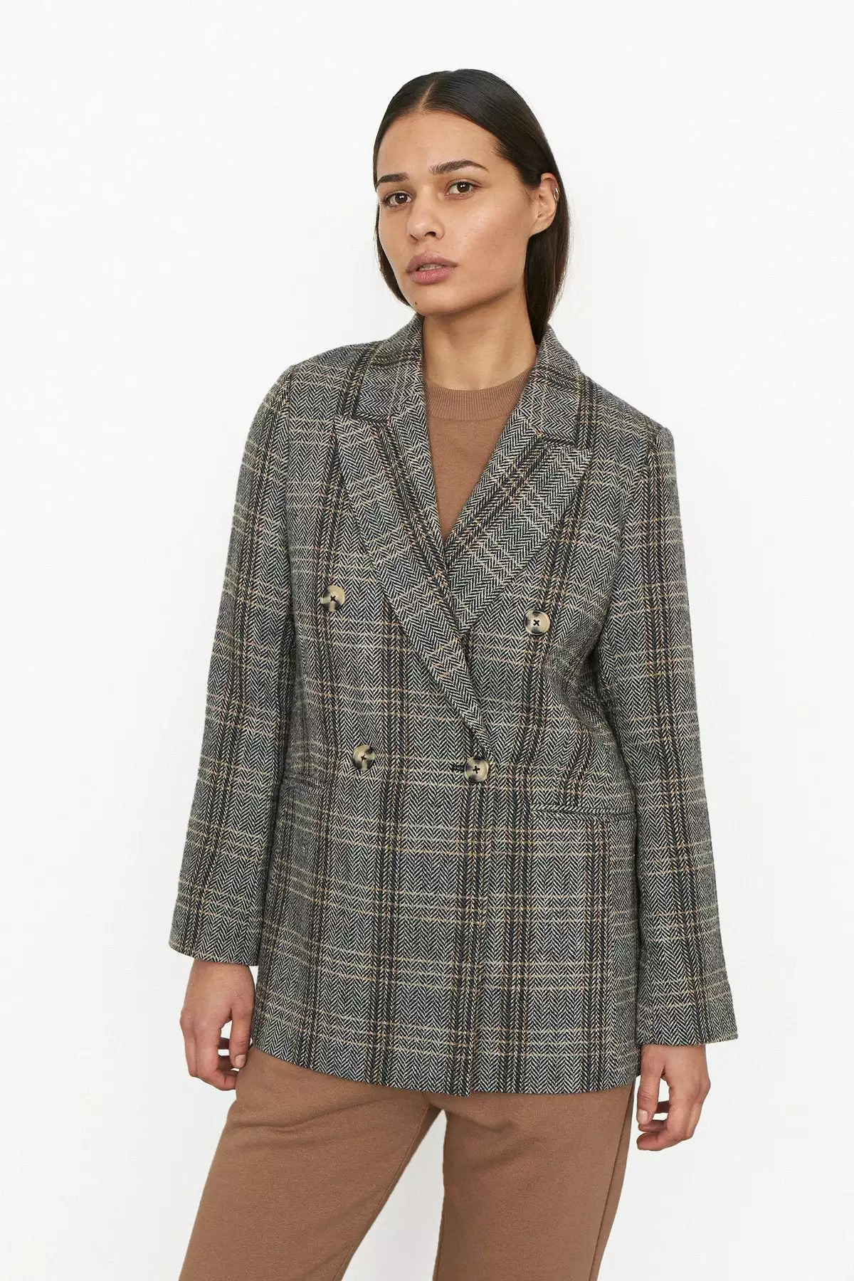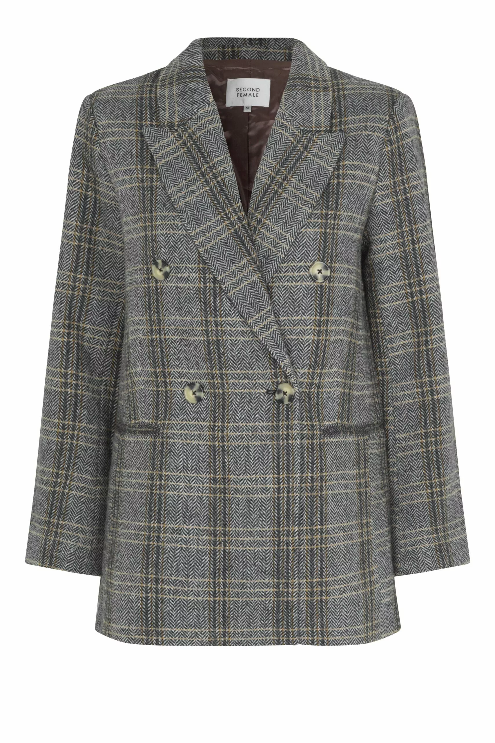 Cesina Blazer fra Second Female. Elegant blazer laget i en rutete, fiskebeinmønstret ullblandingskvalitet. Blazeren er dobbeltbrystet med kontrastknappelukking og har klassisk fit. Den har praktiske lommer foran og splitt bak og mansjetter med knappelukking.