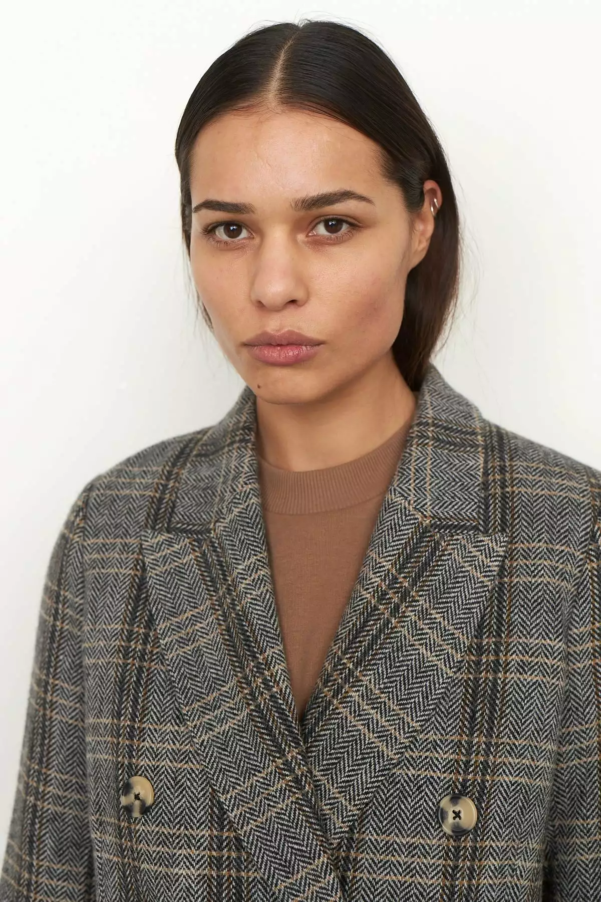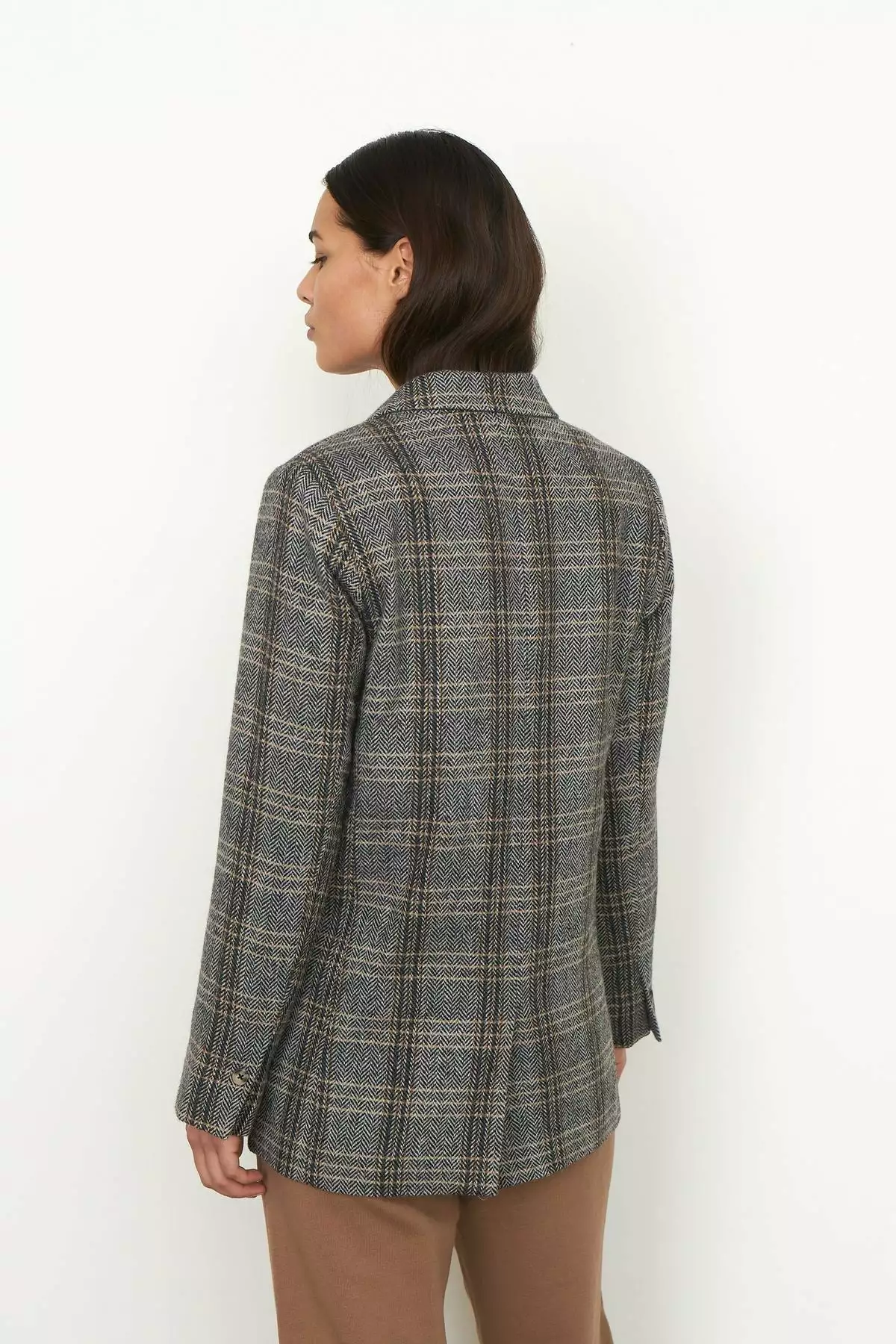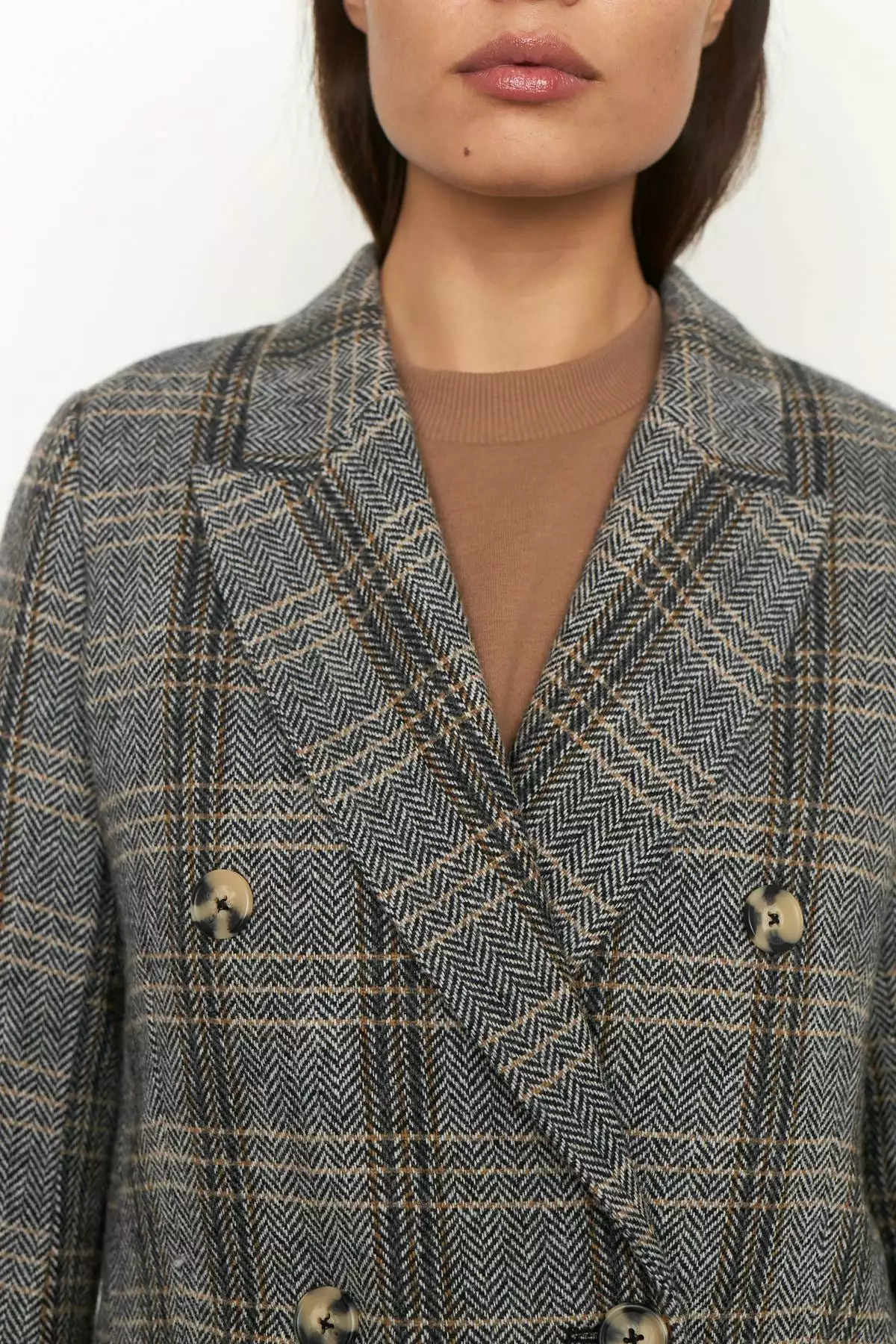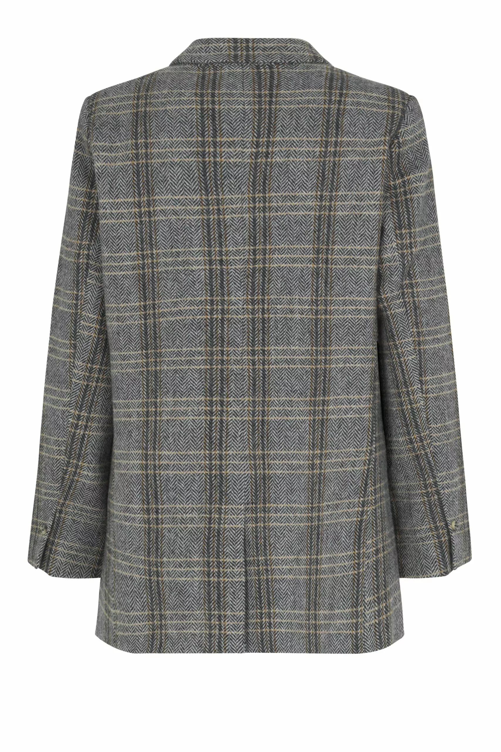 Cesina Blazer fra Second Female. Elegant blazer laget i en rutete, fiskebeinmønstret ullblandingskvalitet. Blazeren er dobbeltbrystet med kontrastknappelukking og har klassisk fit. Den har praktiske lommer foran og splitt bak og mansjetter med knappelukking.