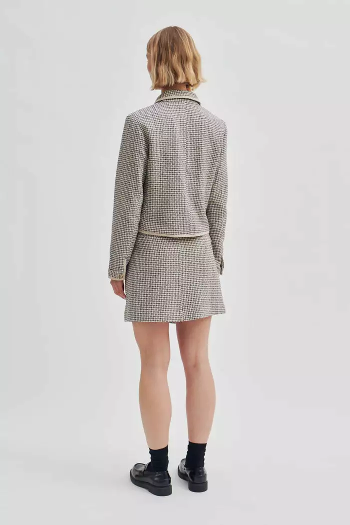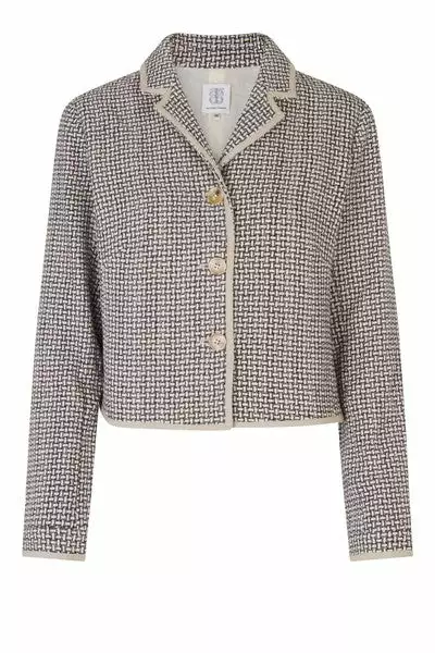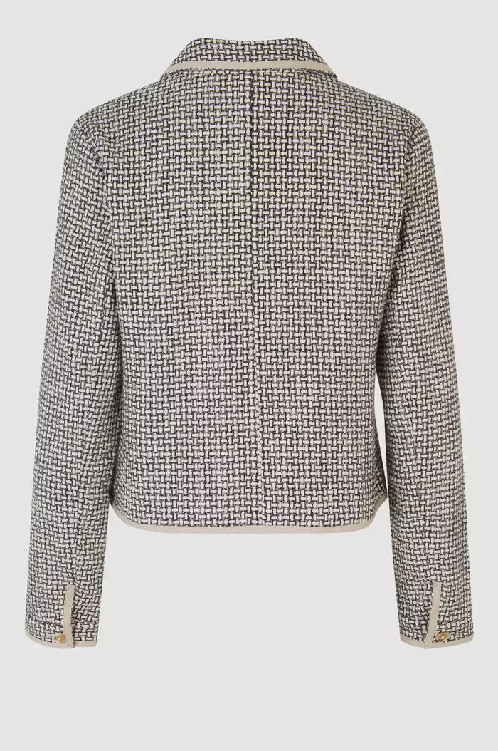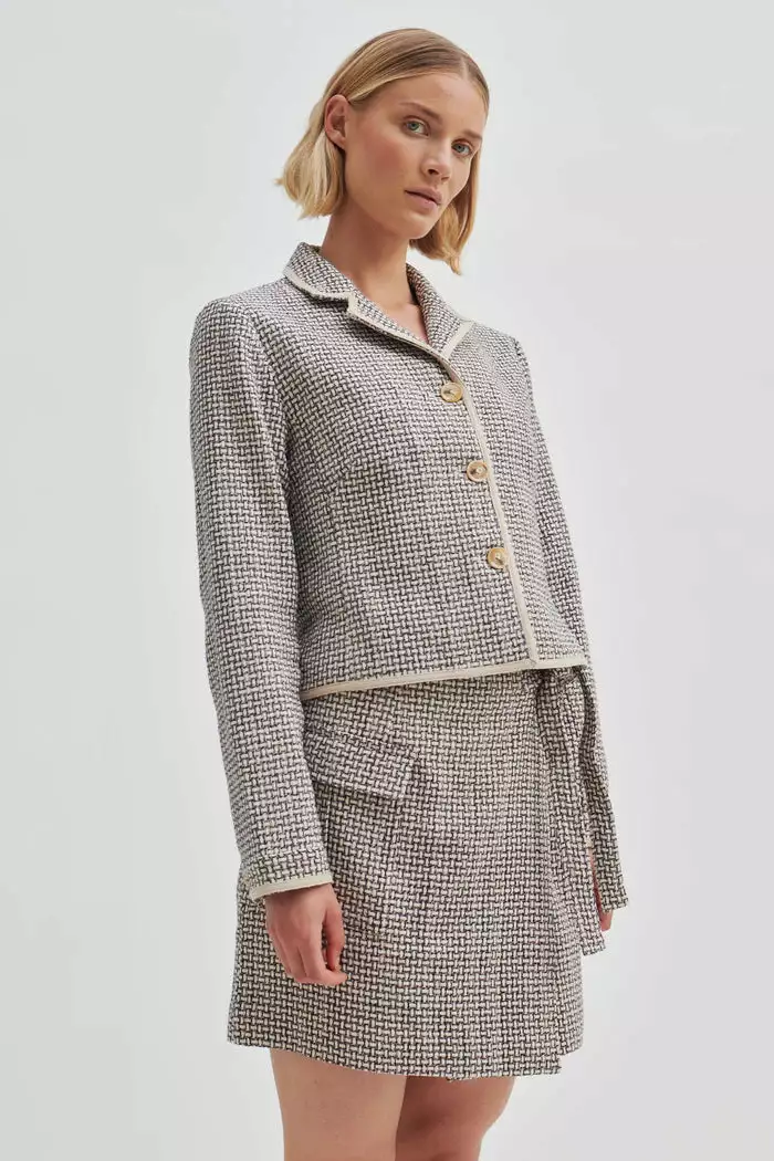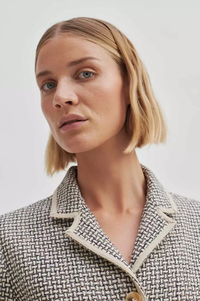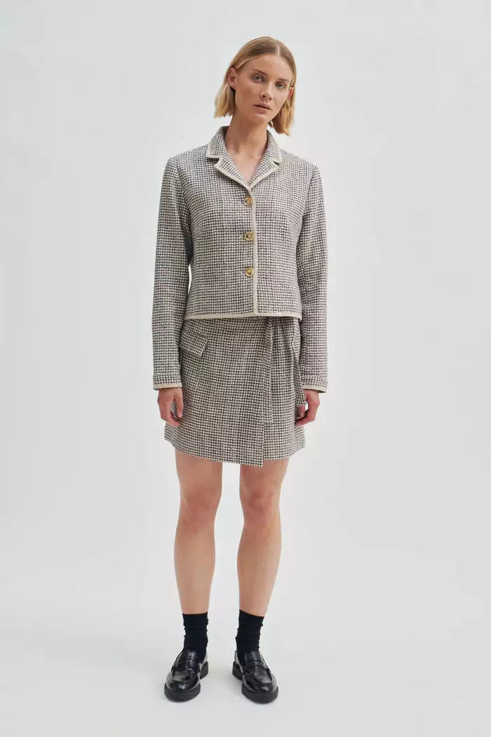 Channa Jacket fra Second Female. En superfin, cropped blazer fra Second Female i et delikat print. Channa Jacket har små jakkeslag og knappelukking foran, og er laget i en luksuriøs bomull- og silkemiks. Jakken har kontrasterende kantbånd og er en delikat jakke du enkelt kan bruke i stedet for en cardigan eller den klassiske blazeren. Style den gjerne sammen med Channa Skirt og et par loafers.