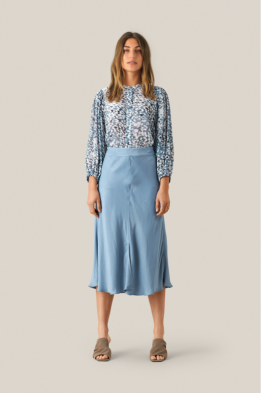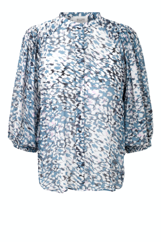 Clouds Shirt fra Second Female er en bluse med klassisk mandarin-krage og synlig knepping i front. 3/4s lange voluminøse ermer med strikk i håndleddet.