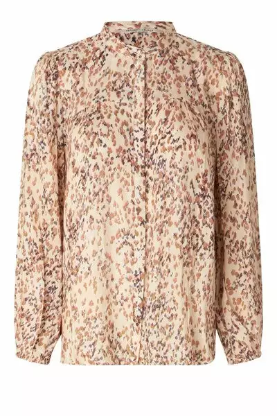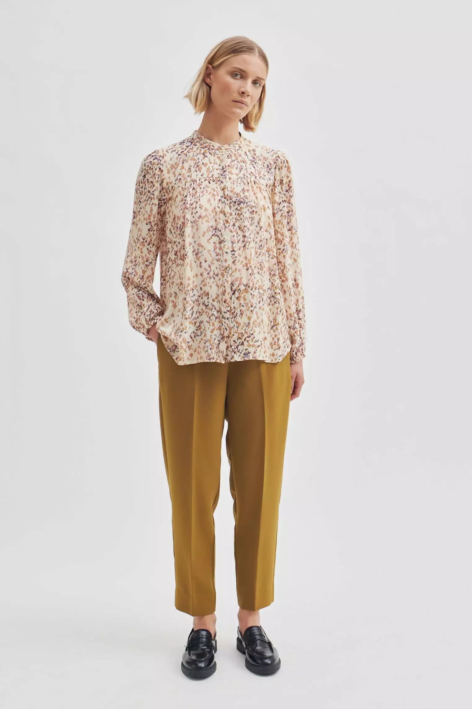 Cosmos Shirt fra Second Female. Søt bluse fra Second Female i et fint print med orange og lilla detaljer på en delikat cream bunnfarge. Cosmos Shirt har lange, løse ermer med smal, elastisk mansjett og liten puff på skuldrene. Blusen har rund hals og knappestolpe i front. Den rette passformen gjør Cosmos Shirt perfekt å style med et par vide dressbukser med høyt liv og et par loafers.