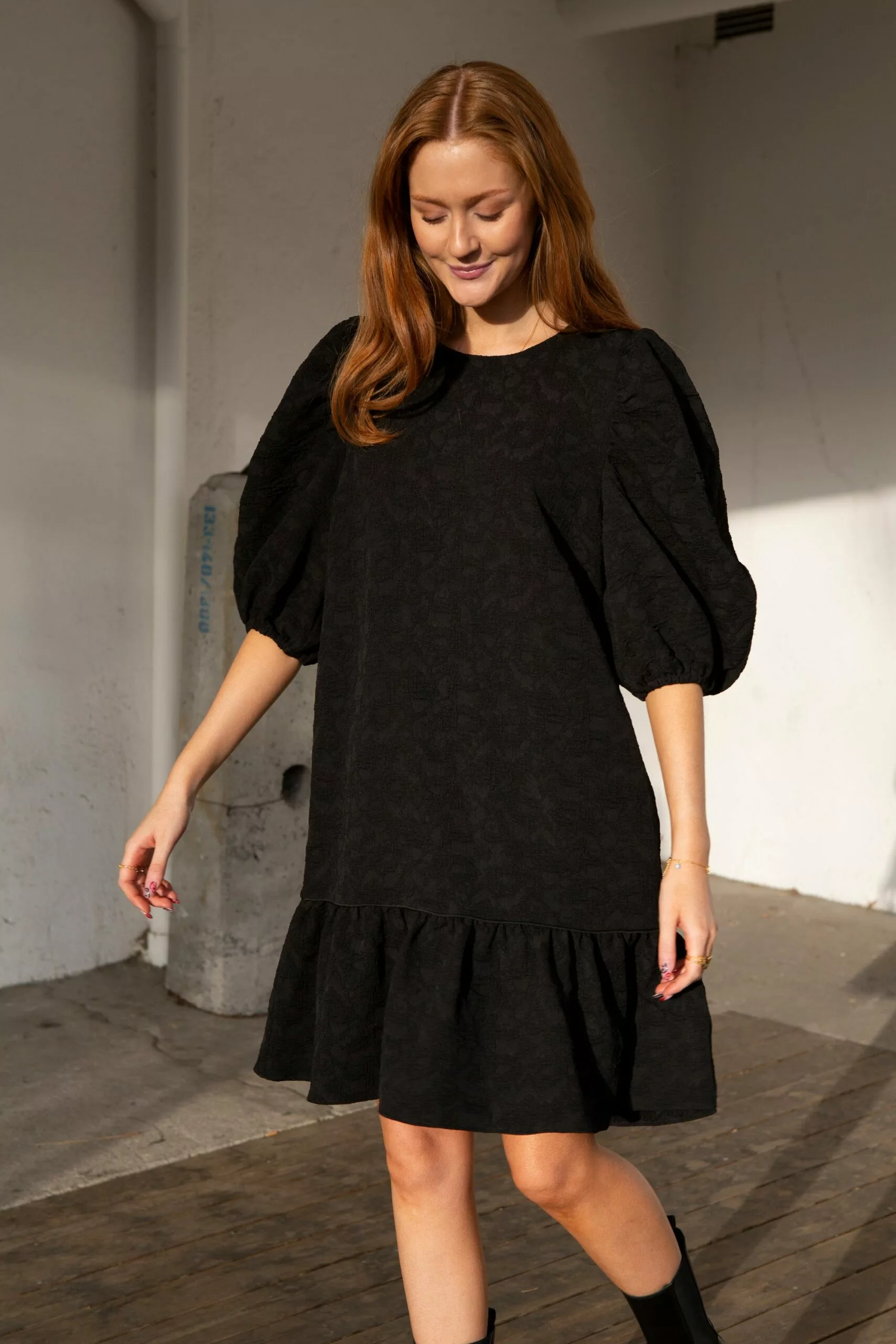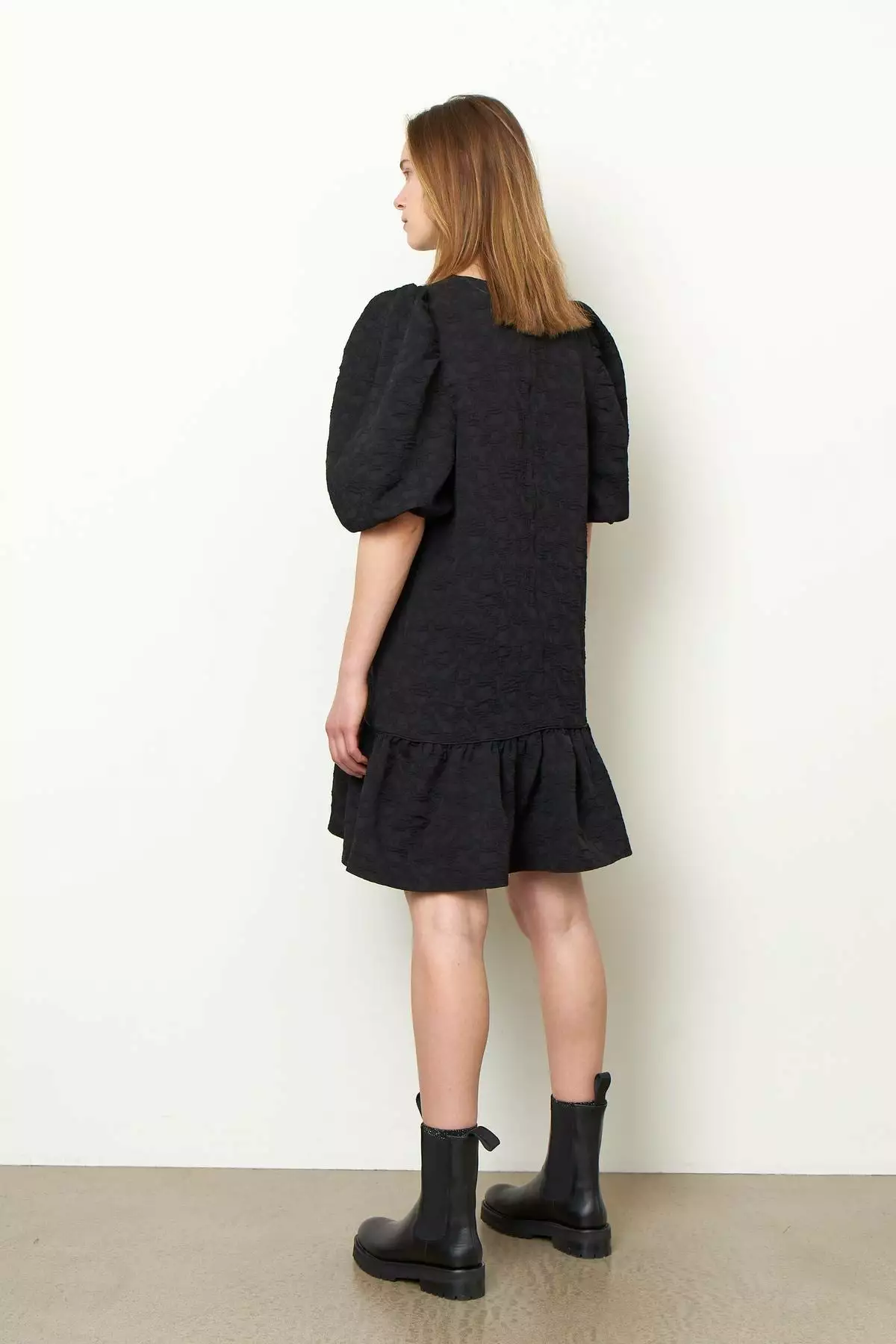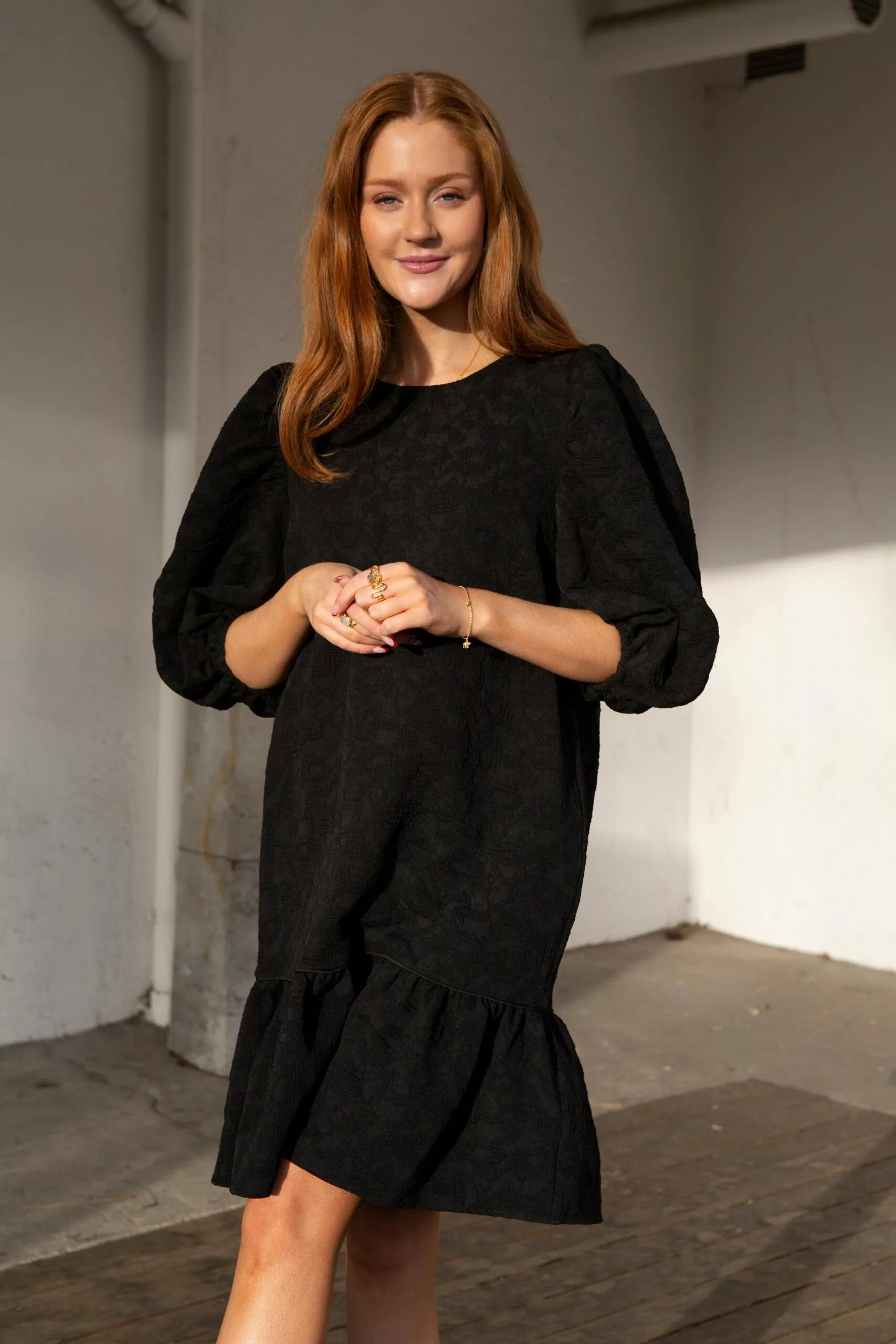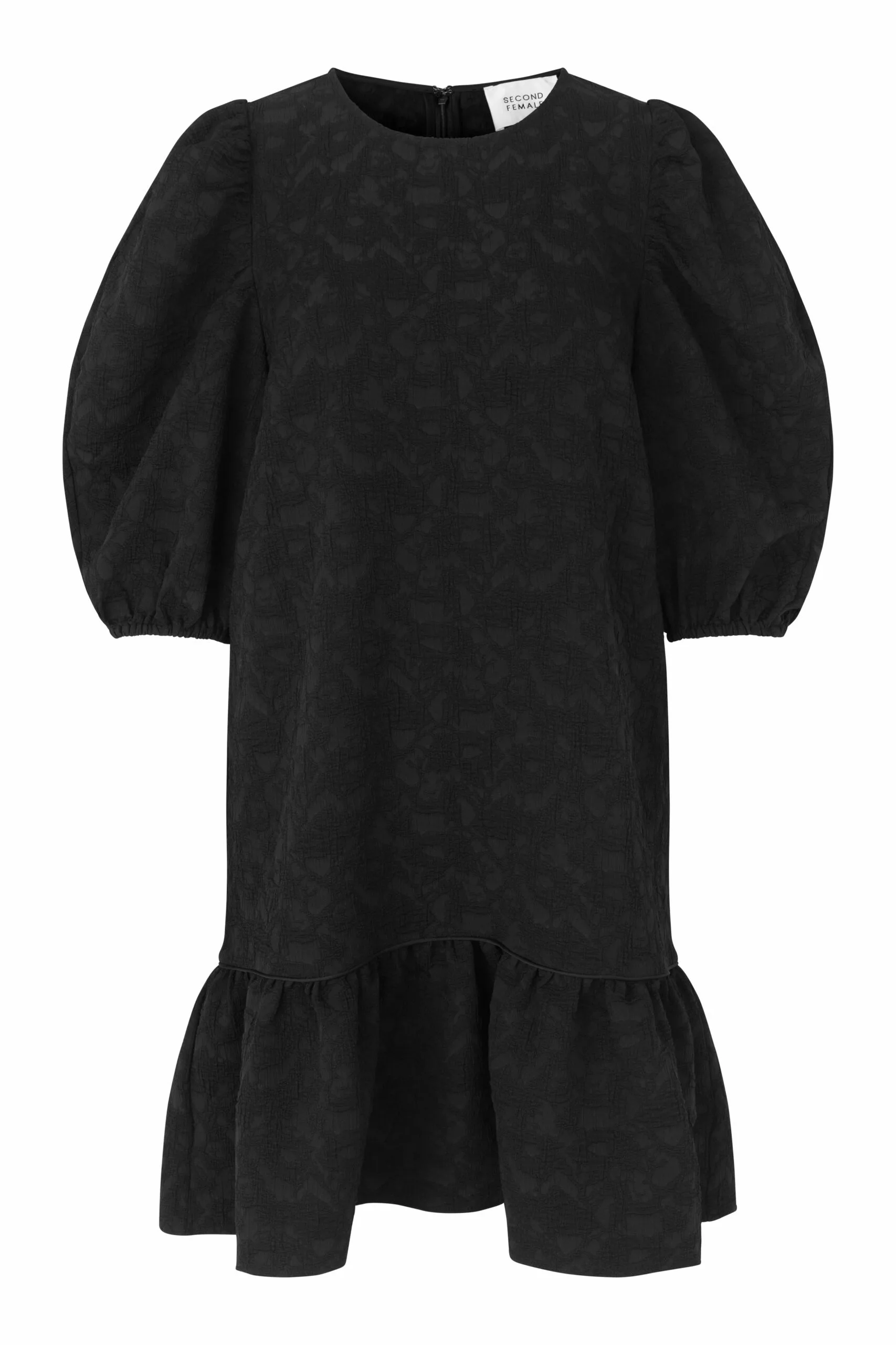 Dorice Dress fra Second female. Lekker midikjole laget i en strukturert polyesterblandingskvalitet. Kjolen har avrundet hals og glidelåsåpning bak. Den har bredt volangpanel ved kantkanten med piper langs kuttelinjen. Kjolen har rynker ved skuldrene for de voluminøse, puffermer og har elastiske mansjetter.