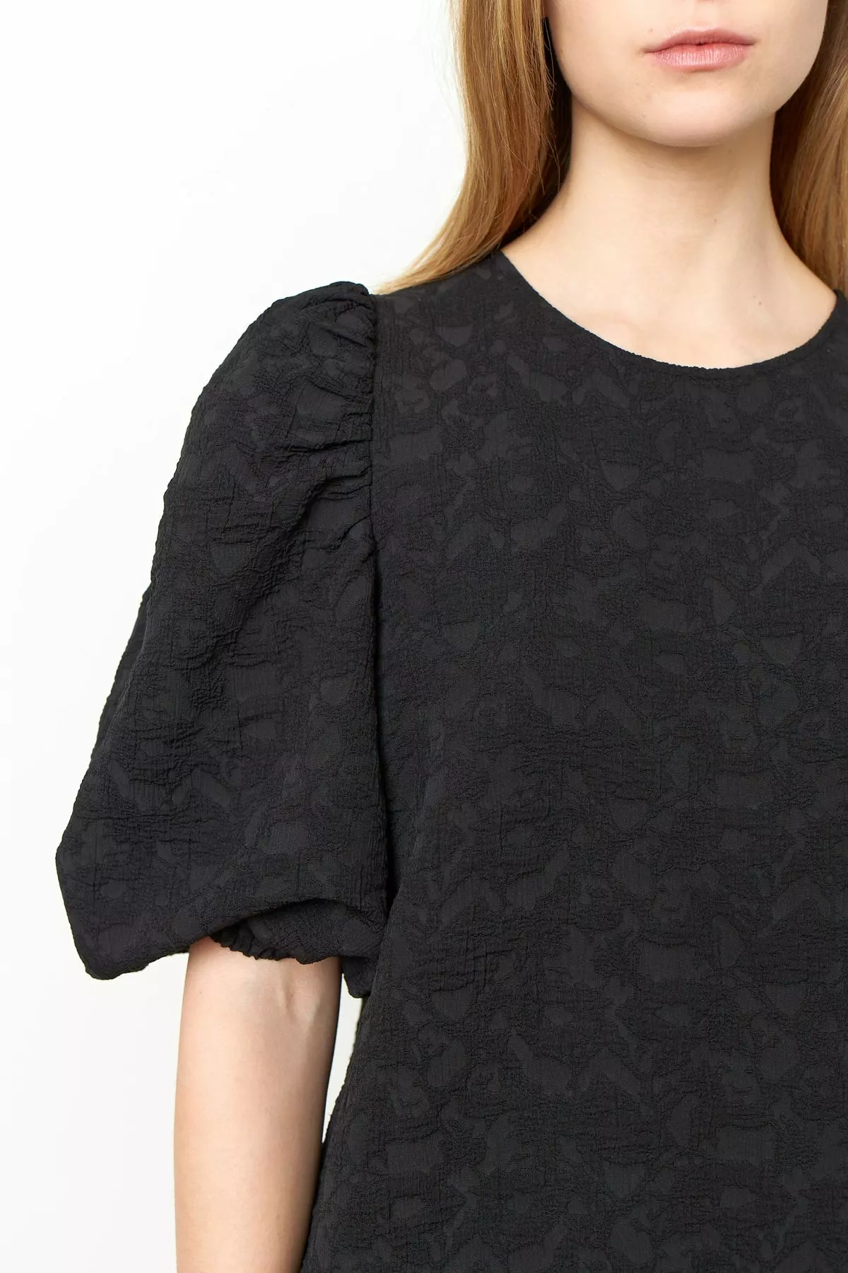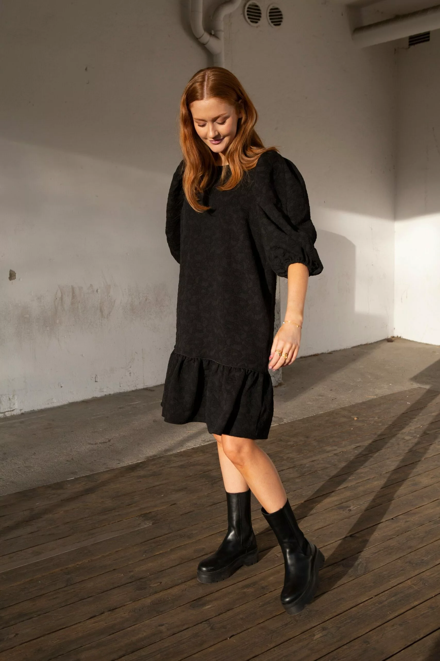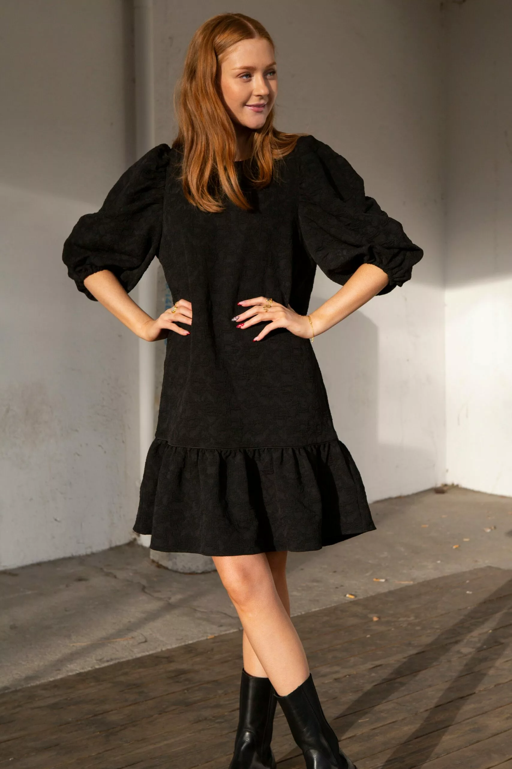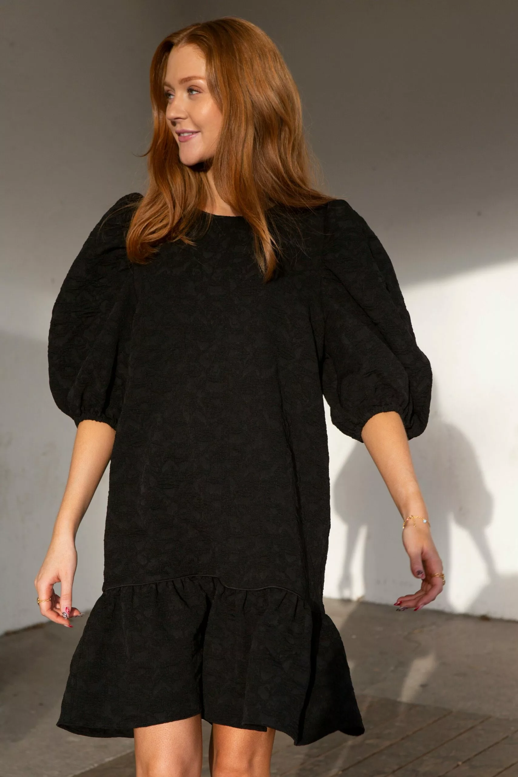 Dorice Dress fra Second female. Lekker midikjole laget i en strukturert polyesterblandingskvalitet. Kjolen har avrundet hals og glidelåsåpning bak. Den har bredt volangpanel ved kantkanten med piper langs kuttelinjen. Kjolen har rynker ved skuldrene for de voluminøse, puffermer og har elastiske mansjetter.