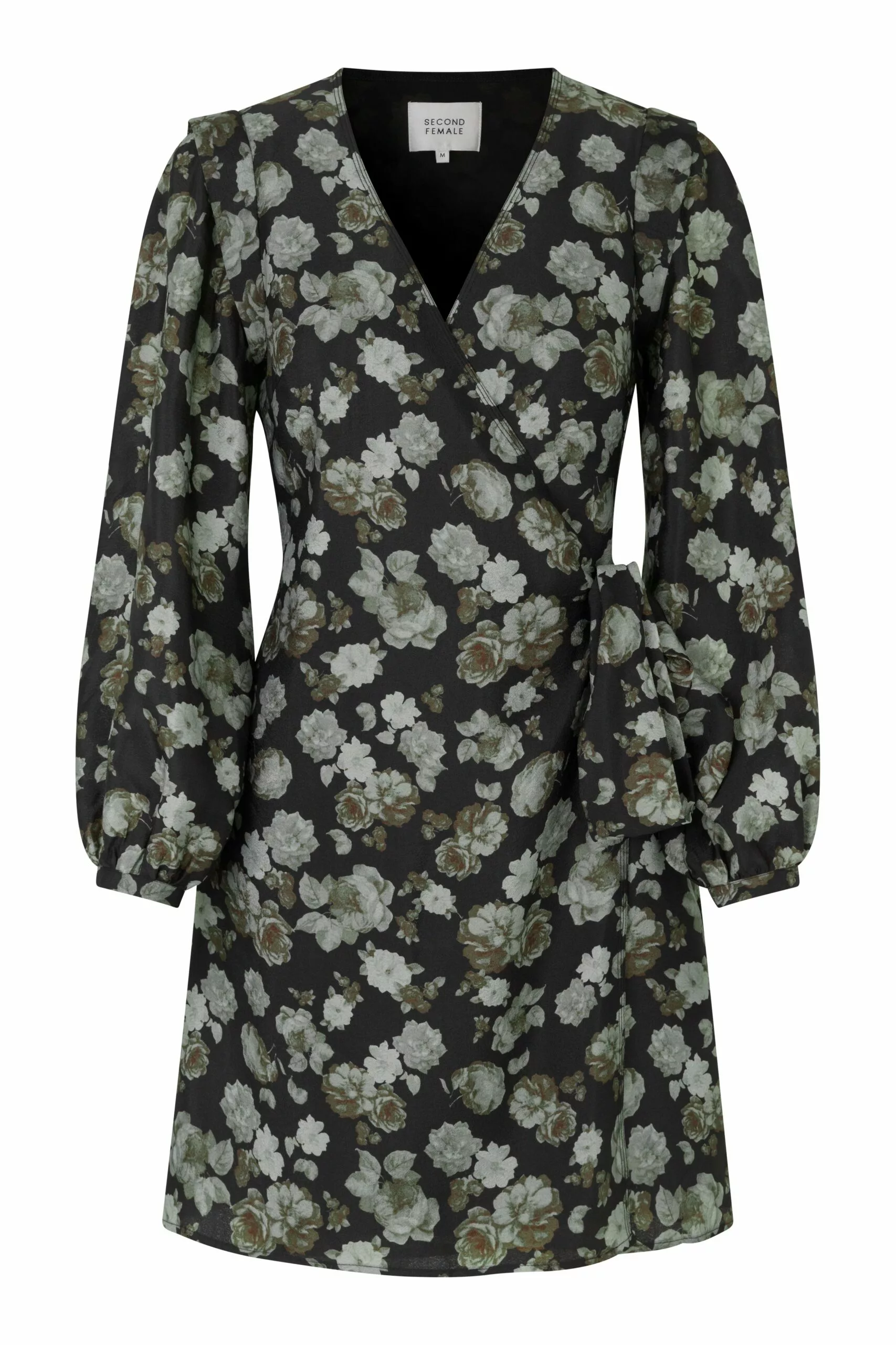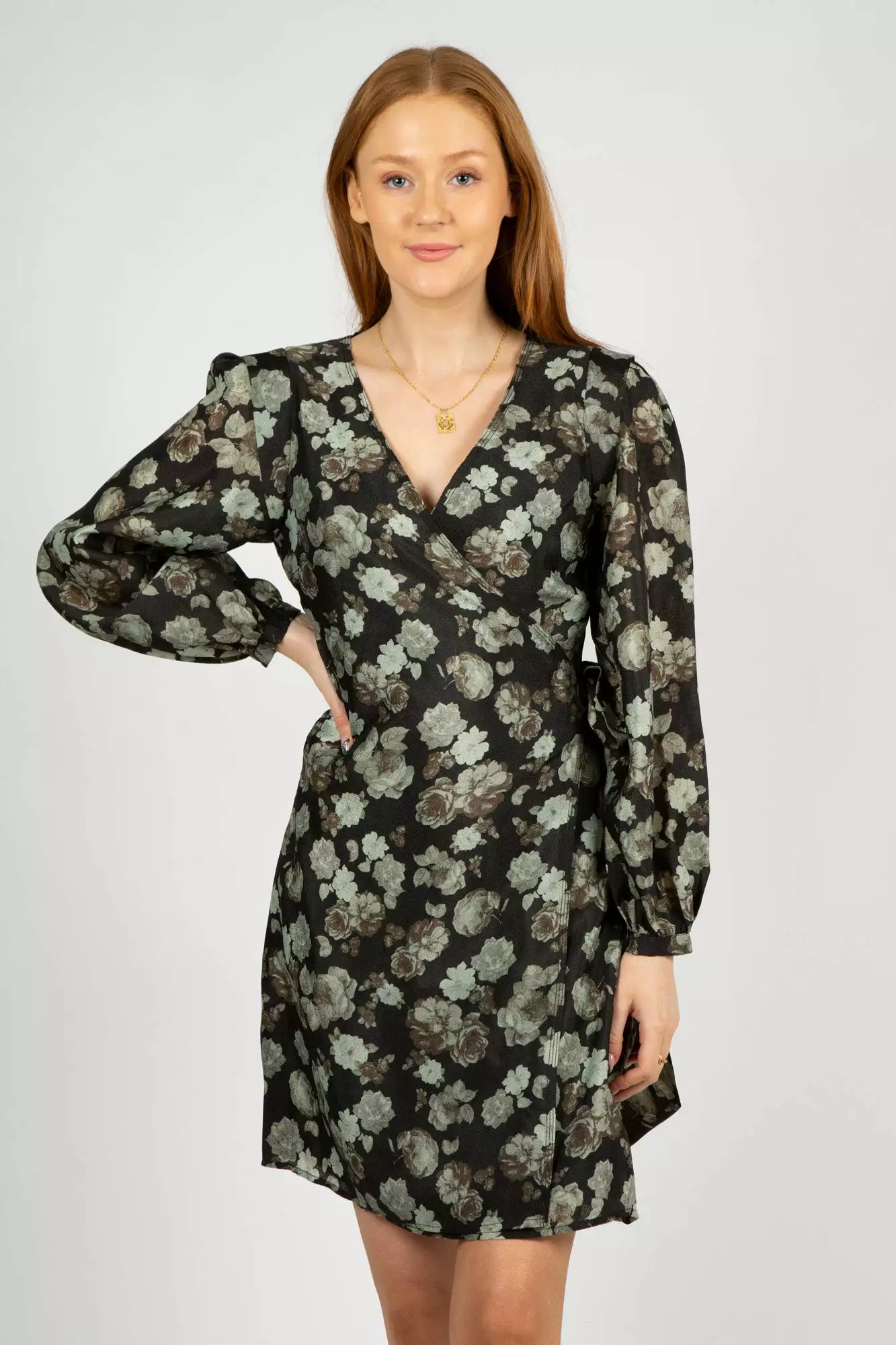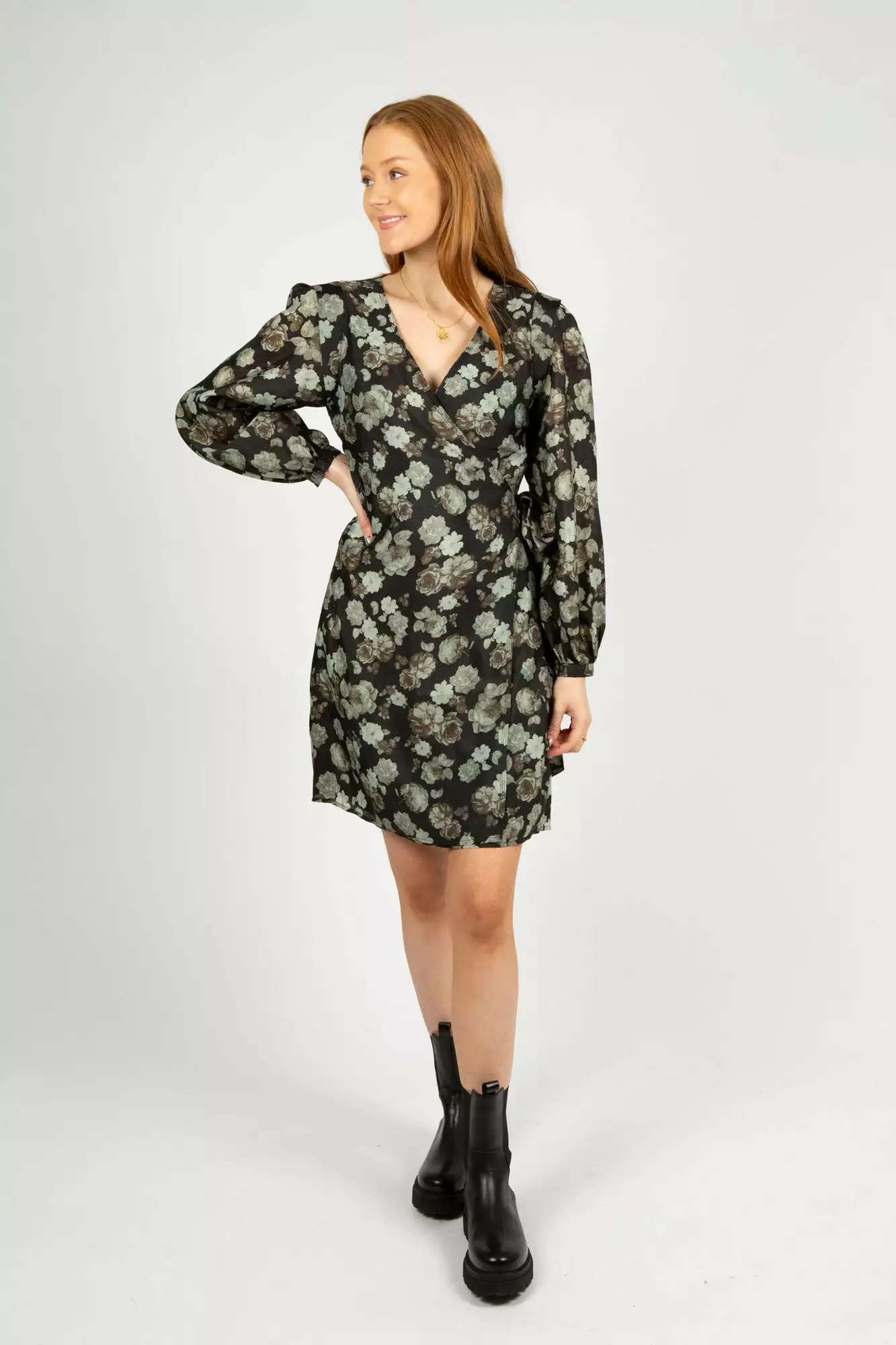 Ellea Wrap Dress fra Second female. Lekker knelang omslagskjole med mønster i grønntoner. Kjolen har svart bunnfarge med stort mønster i grønt og beige. Kjolen har V-åpning med snøring i livet og lange ermer med volum. Perfekt kjole til festsesongen.