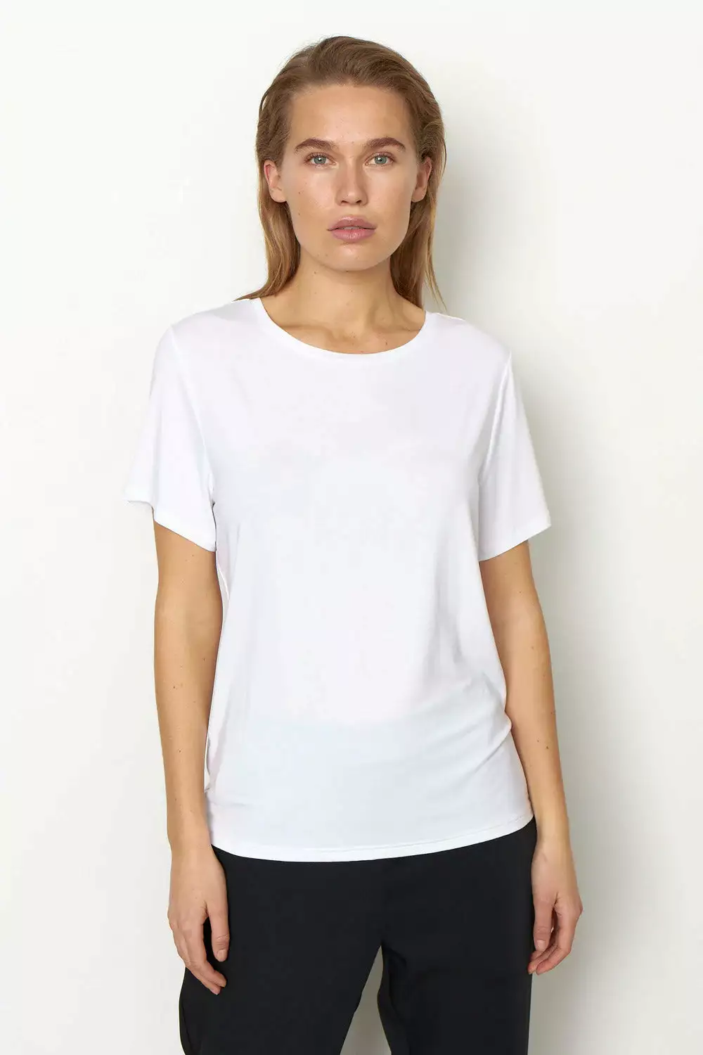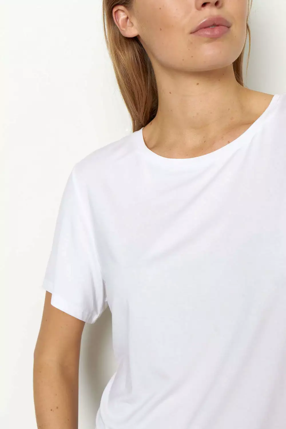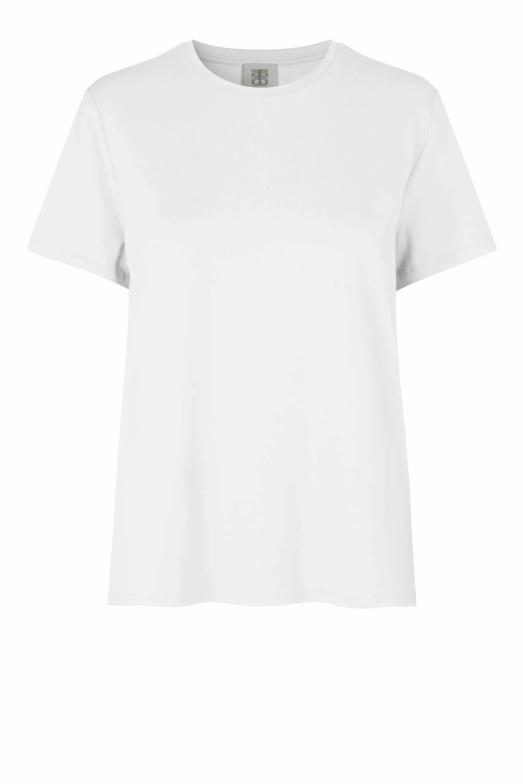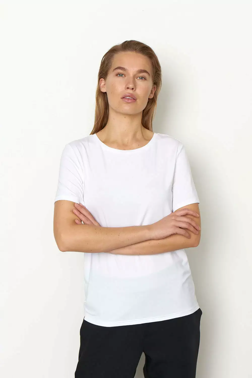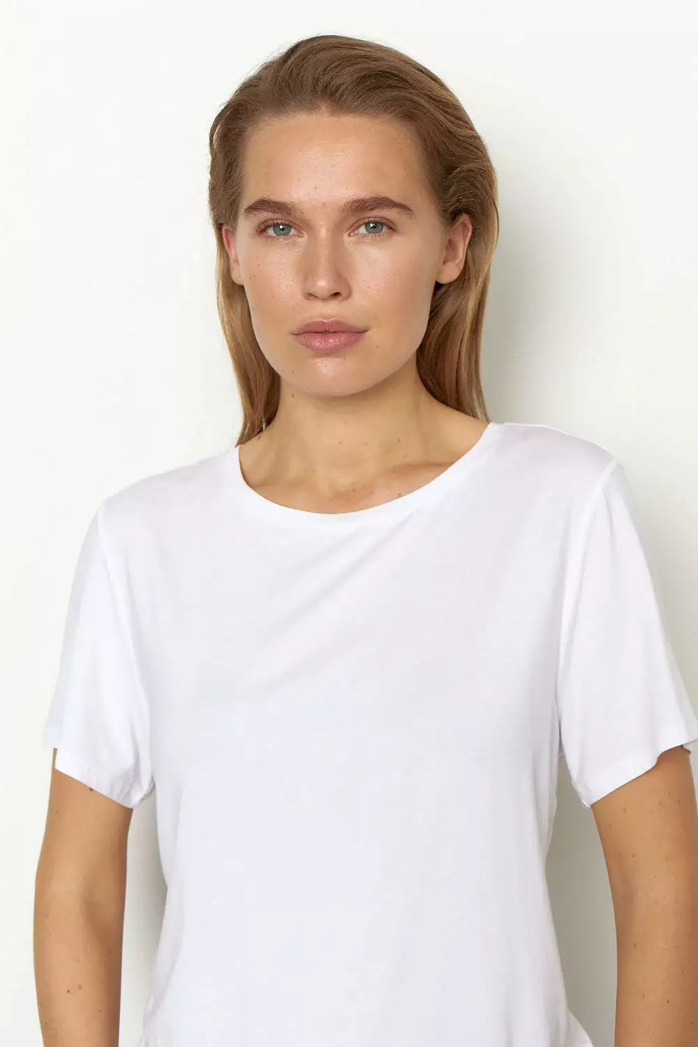 Ello New SS Tee fra Second Female. Den hvite t-skjorten er en skikkelig garderobehelt! Ello New SS Tee fra Second Female er helt perfekt. Den er kuttet i en superkomfortabel modal som holder seg godt vask etter vask, har rund hals og perfekt lengde på ermene – til midt på overarmen. Ello New SS Tee har en rett og flatterende passform, uten at den blir oversized eller boxy – dette gjør den til en penere variant av den hvite t-skjorten – og er perfekt under en dress for et velkledd antrekk som ikke blir for formelt.
