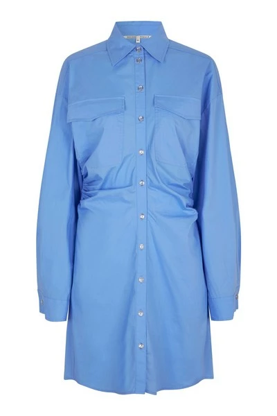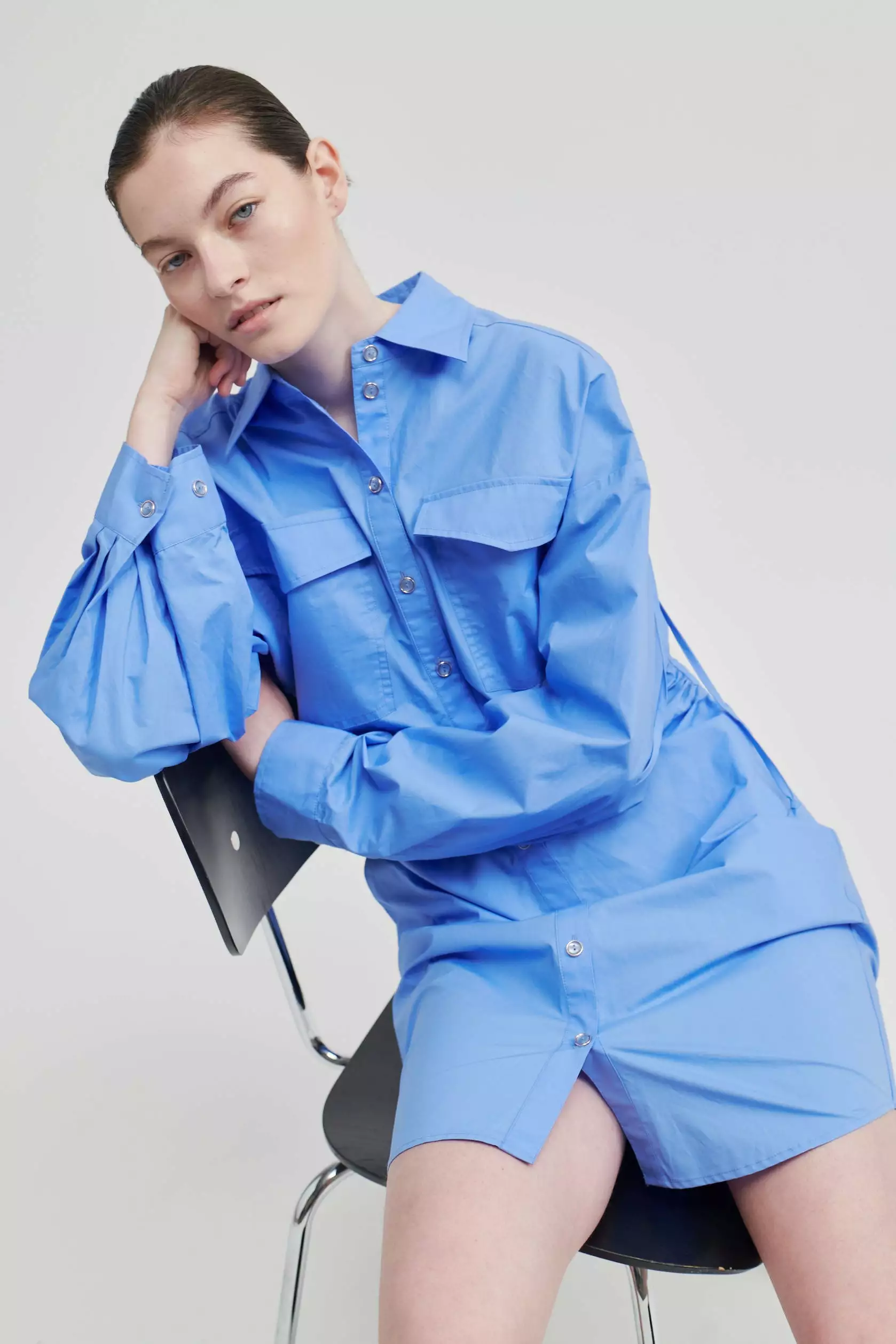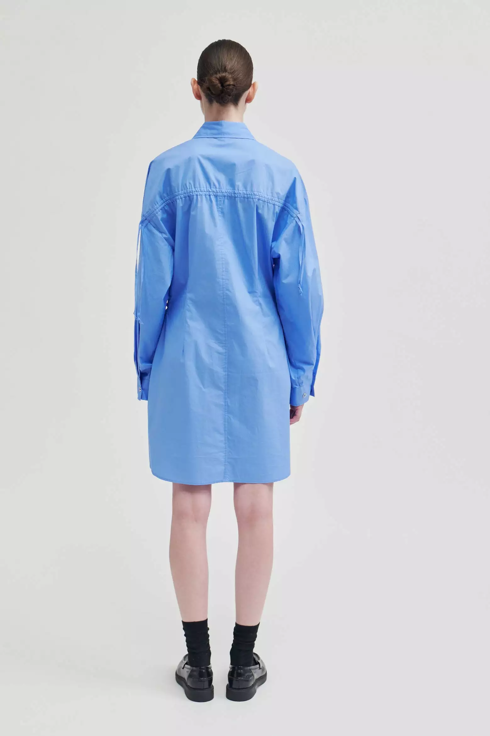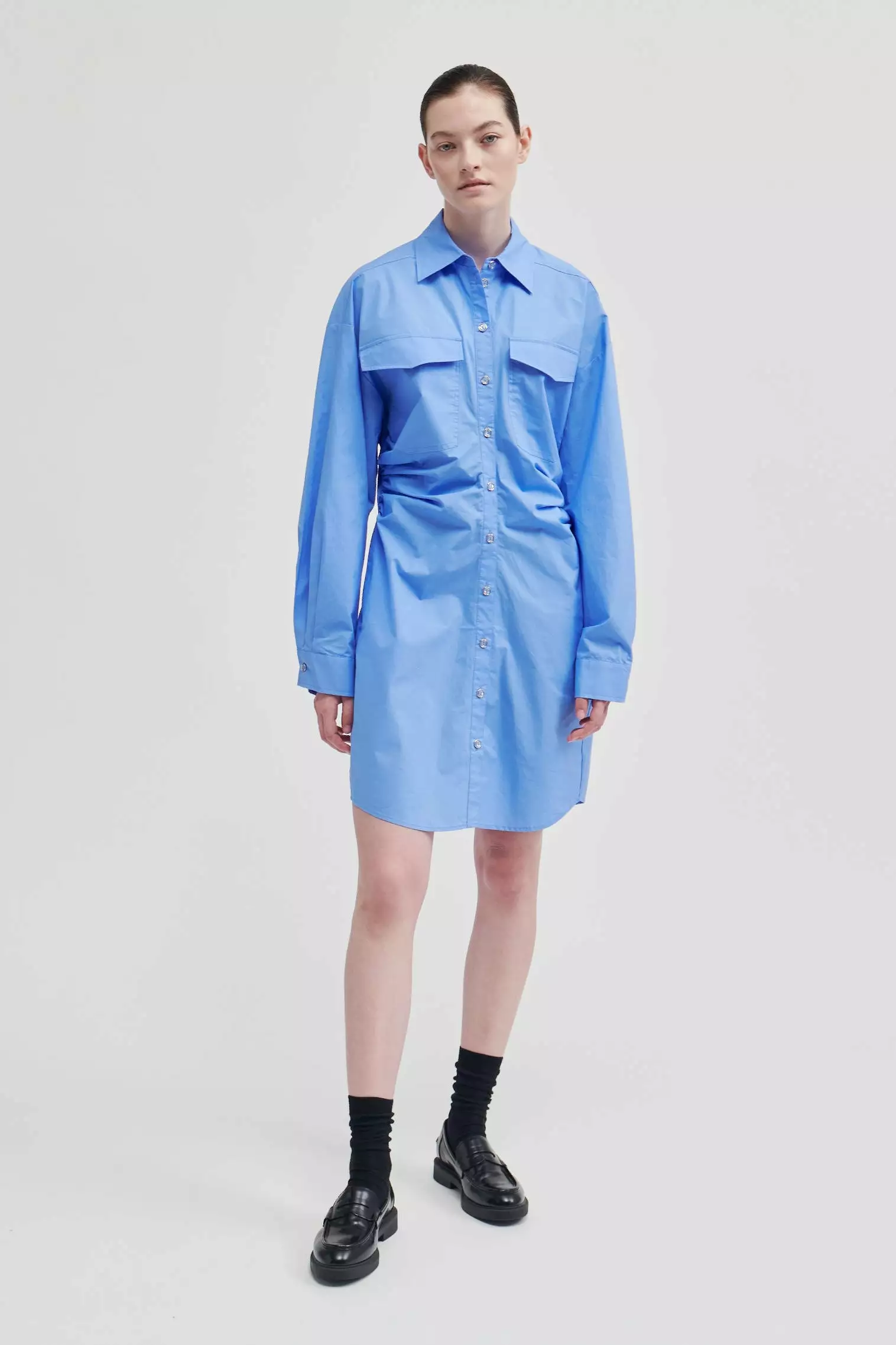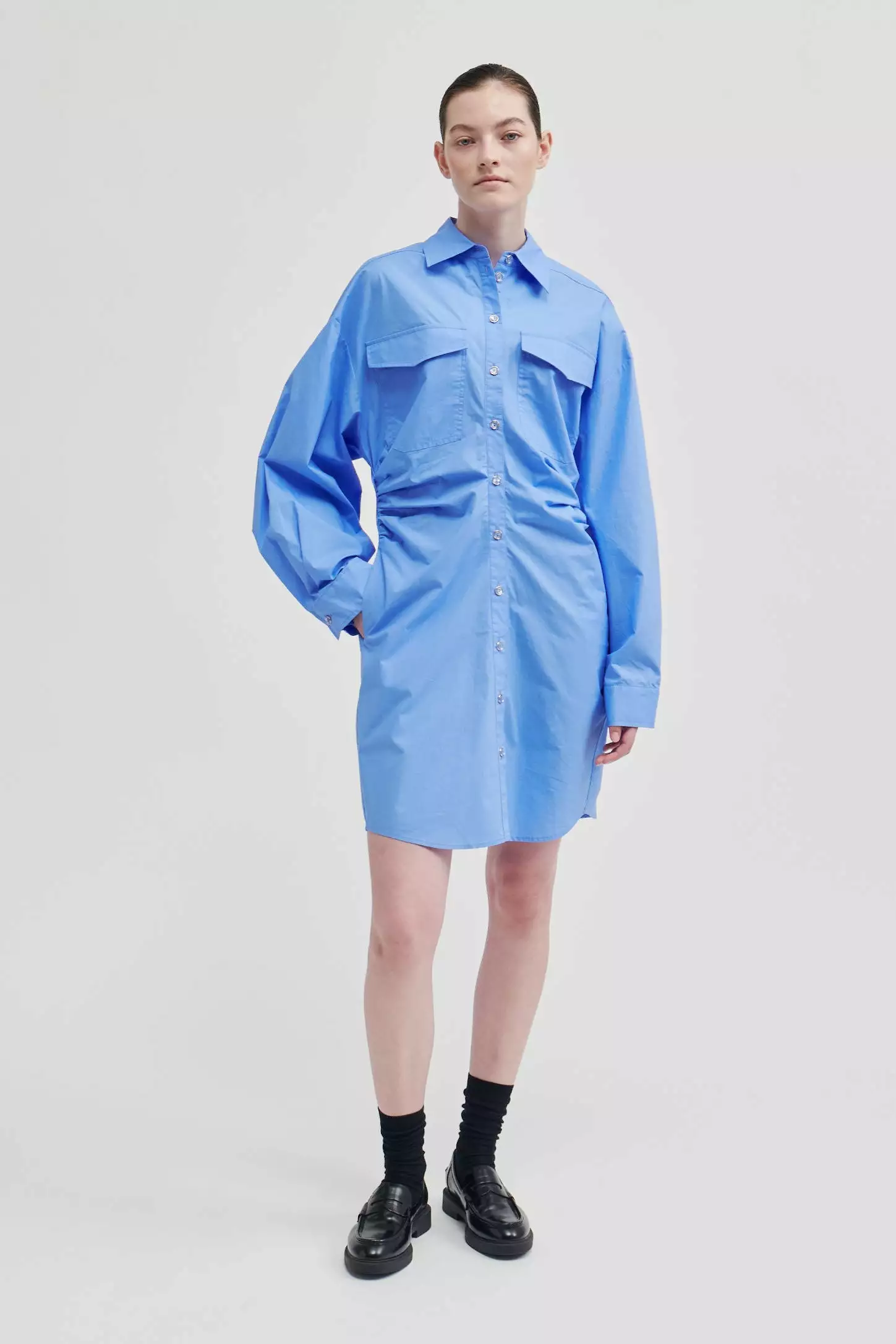 Enara Dress er laget i lett og myk bomull, med spiss krage og knappelukking med perleknapper, lav skuldersøm og lange ermer med justerbare knapper ved mansjettene. Rynkes i sidesømmen for å skape rynket effekt og snøring over ryggen med to tråder. To store brystlommer med klaff og to innerlommer i sidene. Slim fit med løsere topp som kan trekkes inn med snøring.