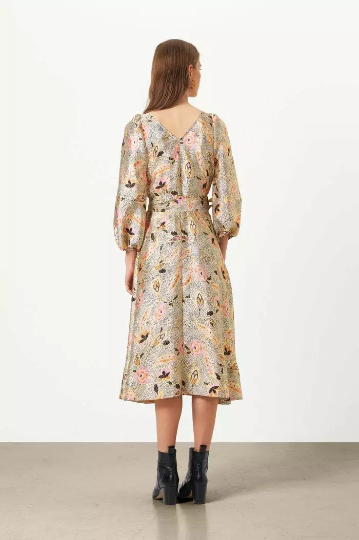 Eske Dress fra Second Female er en knelang kjole med en flott v-utringning og knyting i livet. 3/4 lange ermer.
