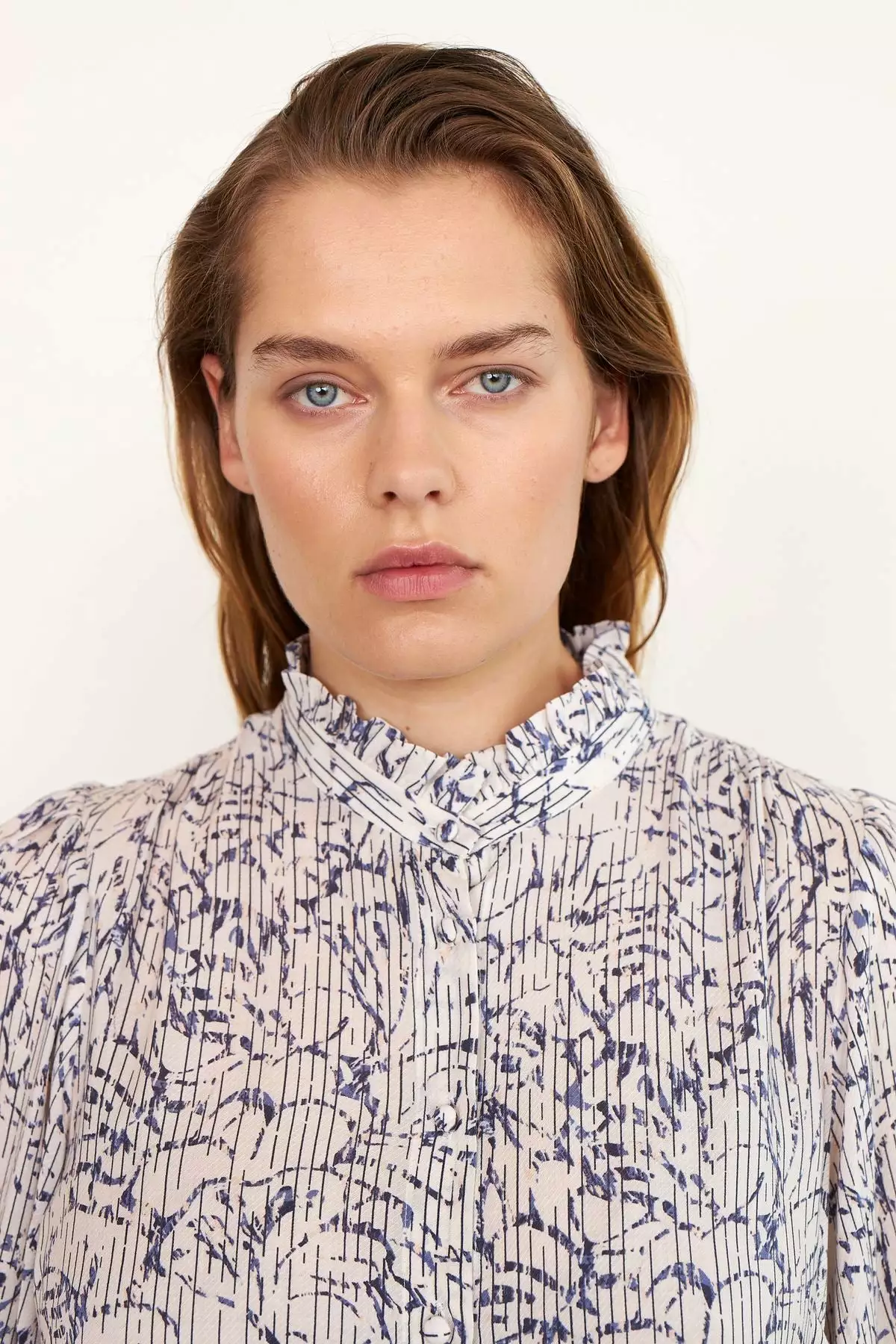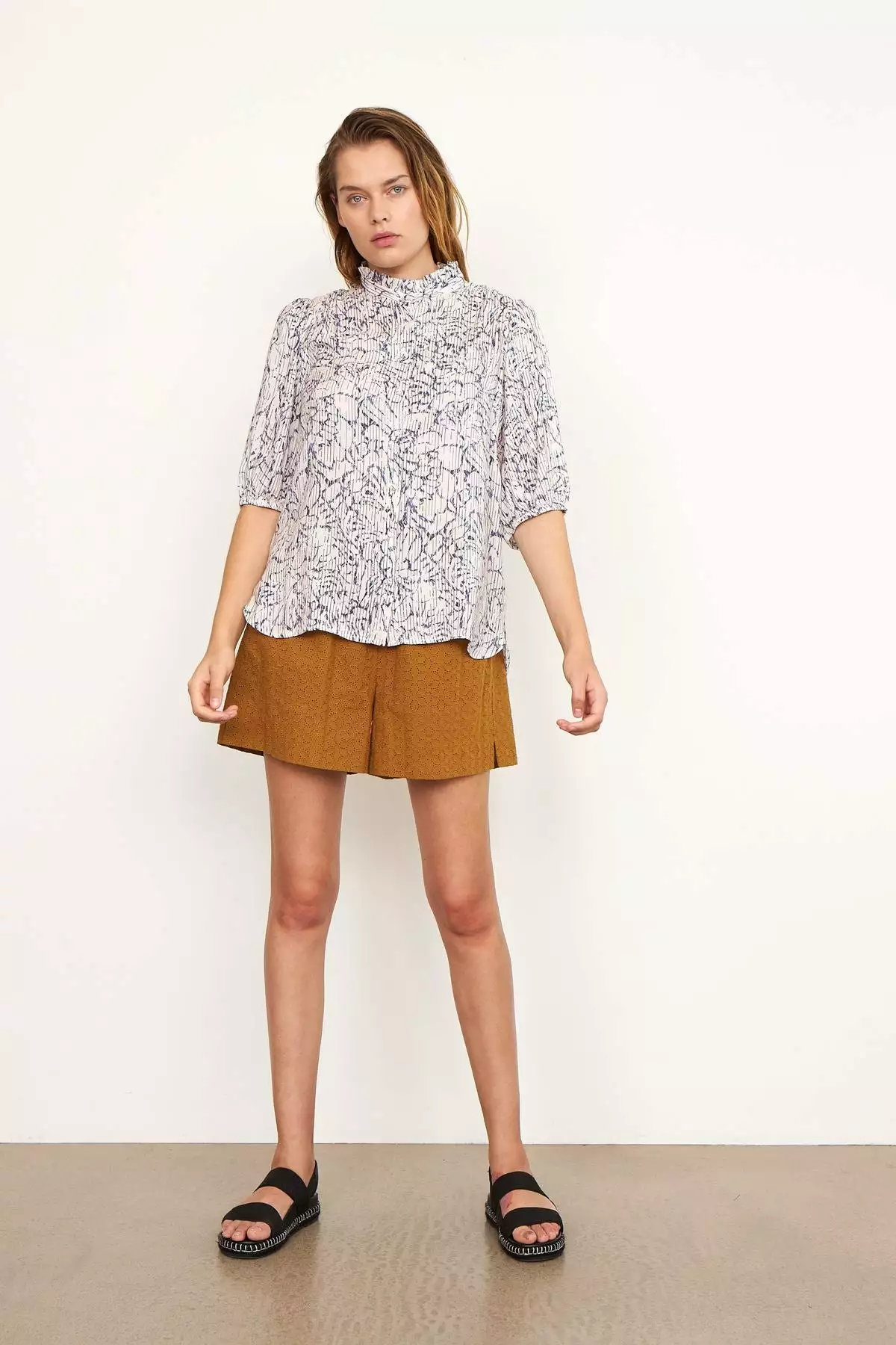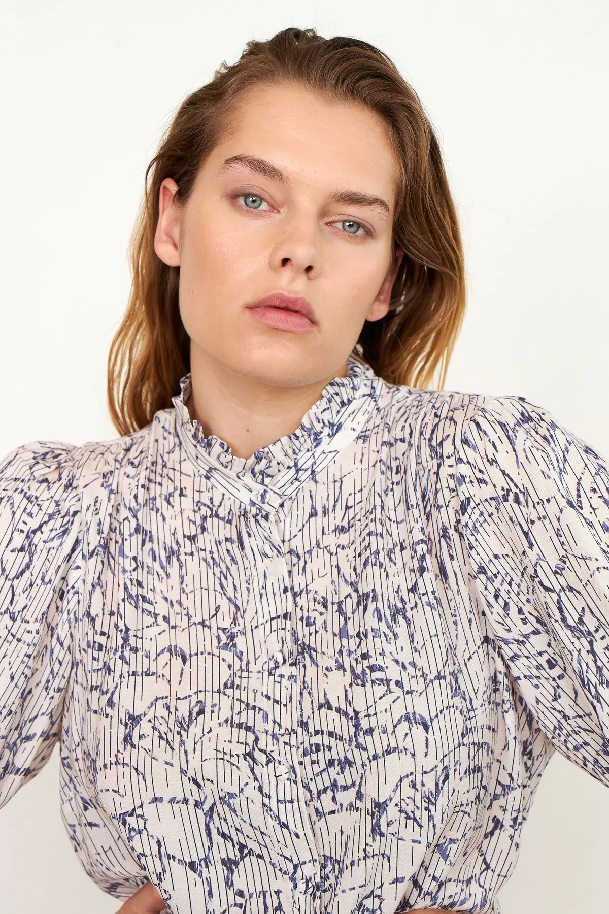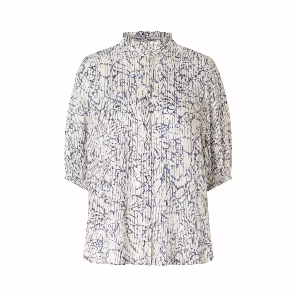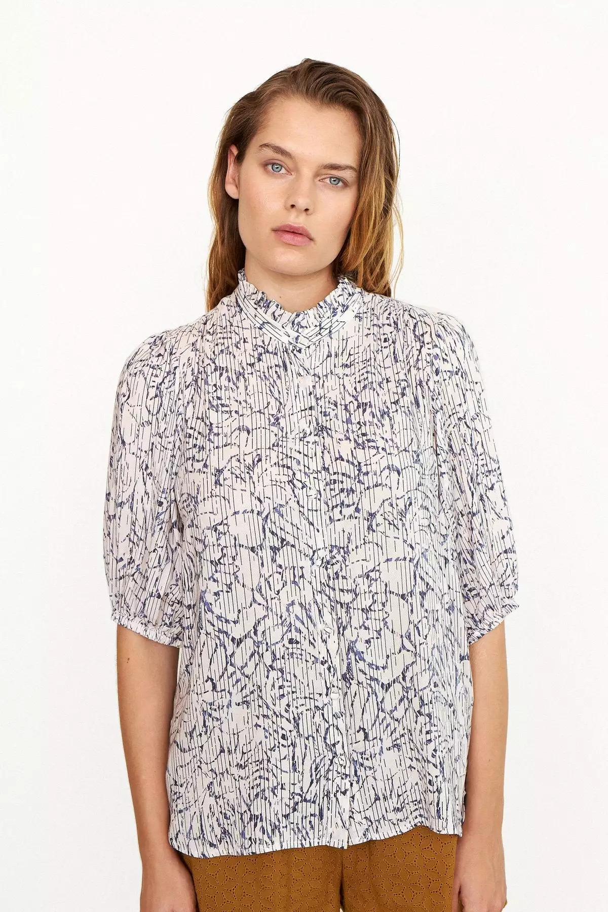 Fiji Shirt fra Second Female. Nydelig skjorte laget i et mønstret viskosestoff. Skjorten har klassisk krage med frynser rundt halsen. Halvlange ermer som har løs og voluminøs passform. Fin sommerlig bluse som passer fint til både linbukser, jeans og shorts.
