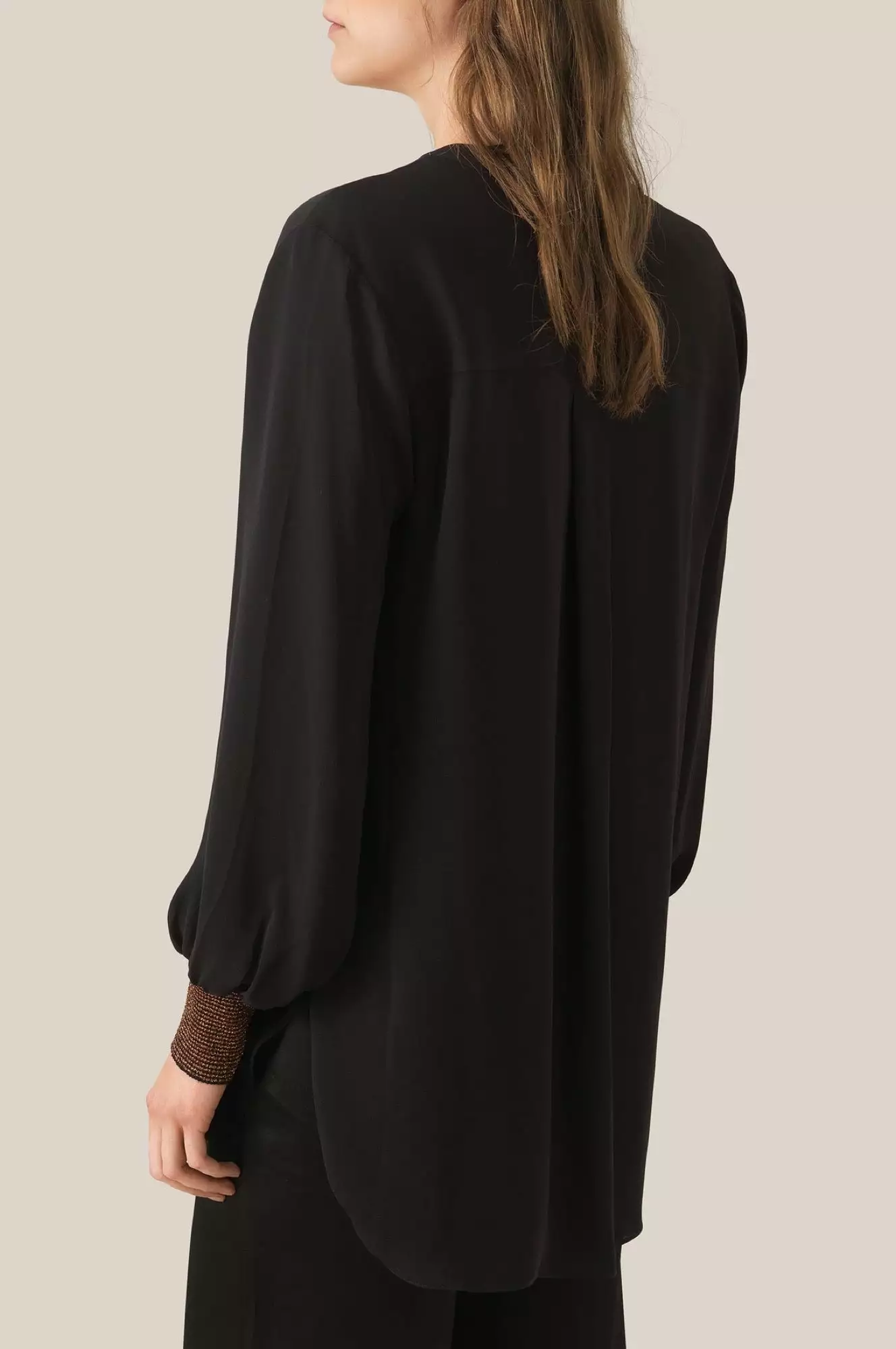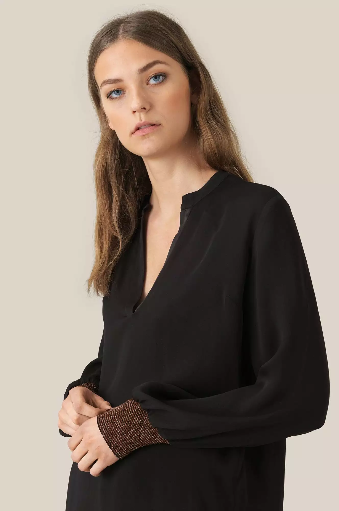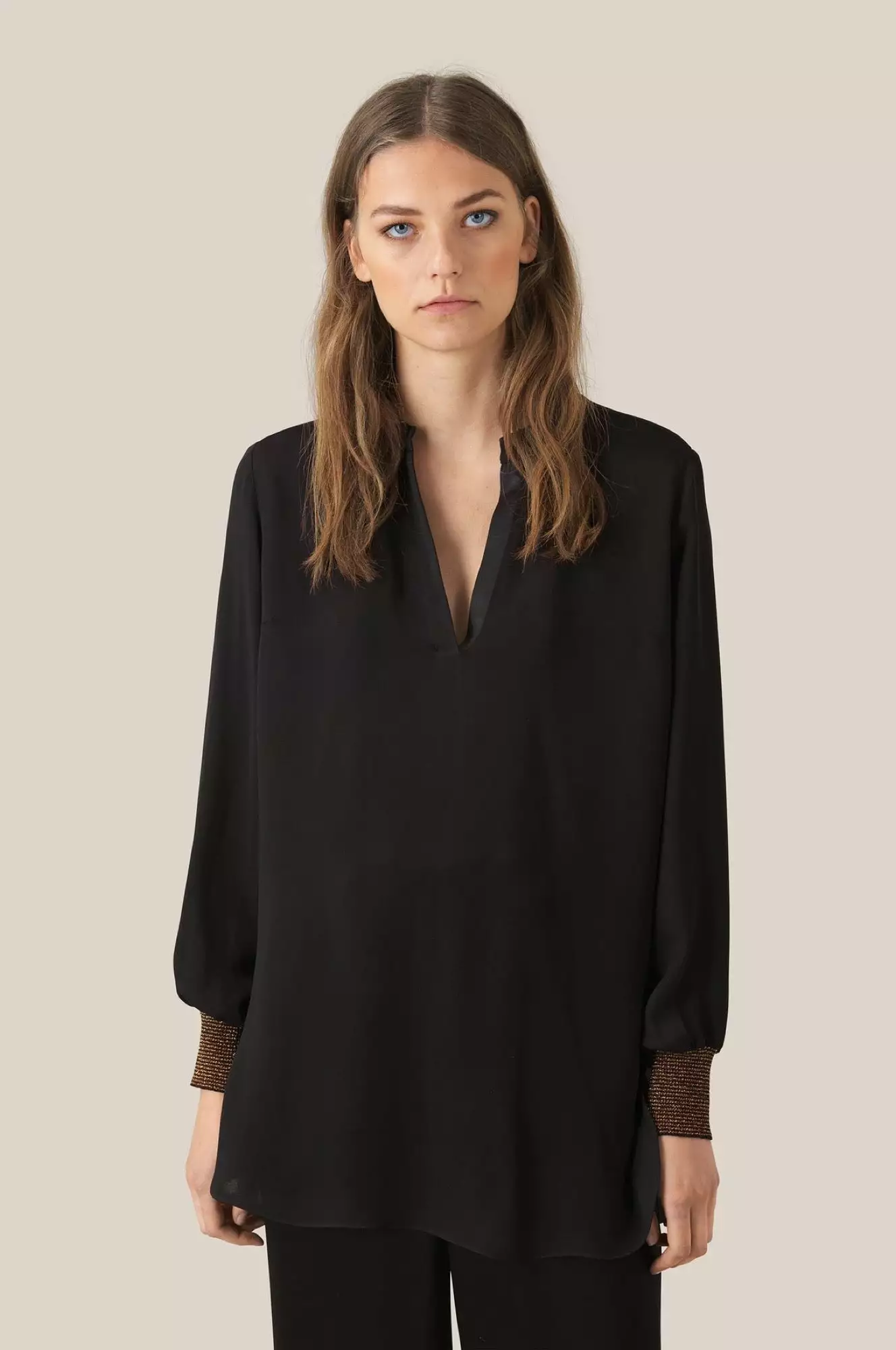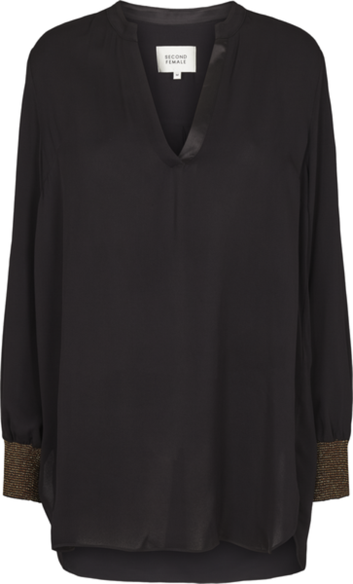 Fin bluse med v-hals og glittrende detaljer nederst på ermene. Blusen er løs i passformen.