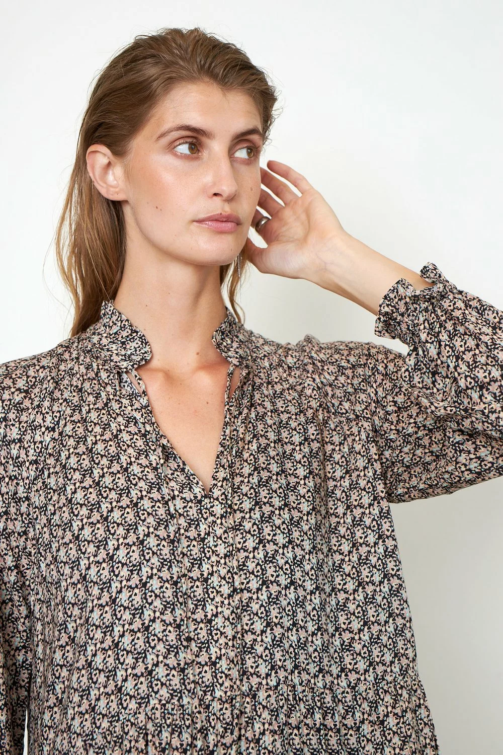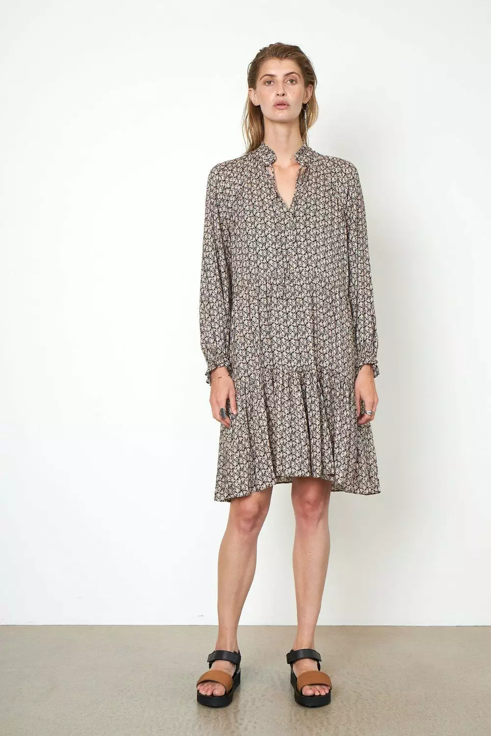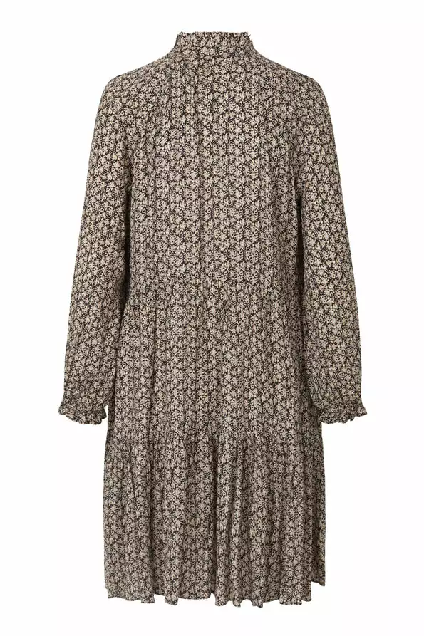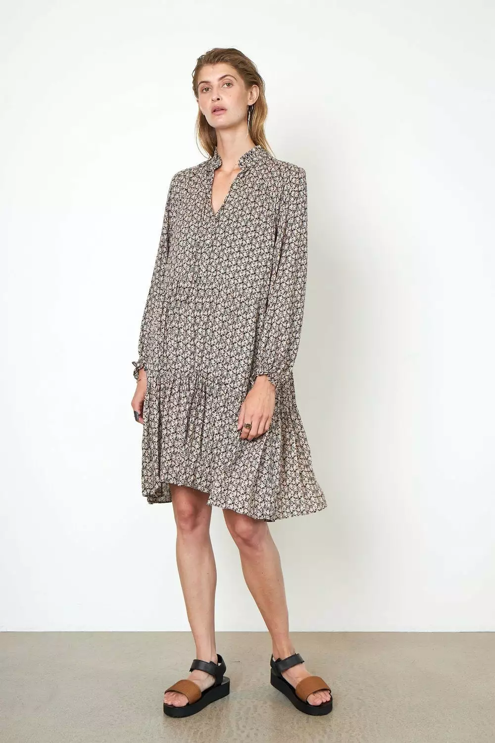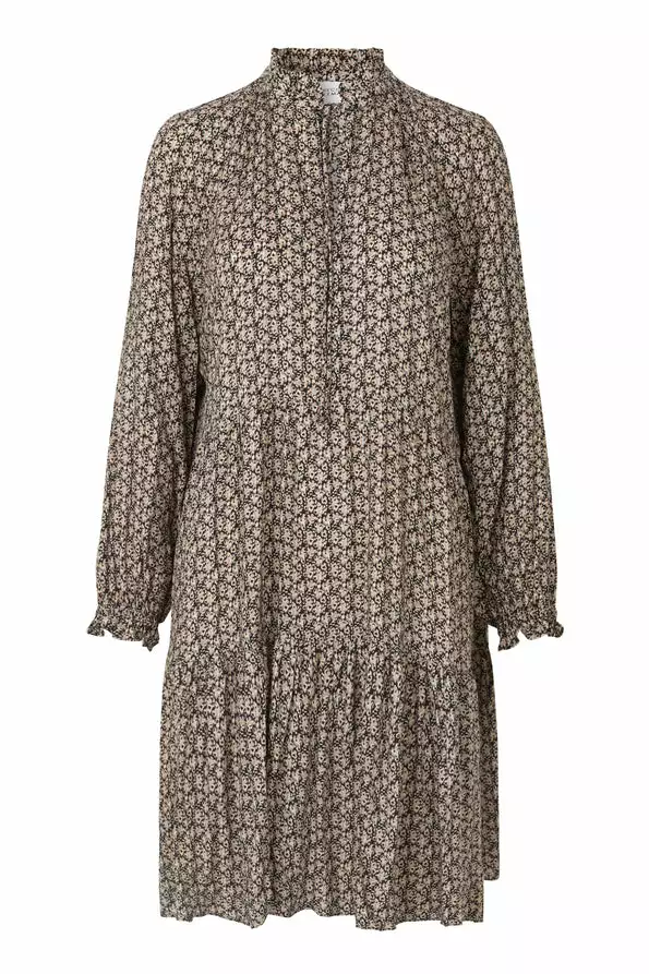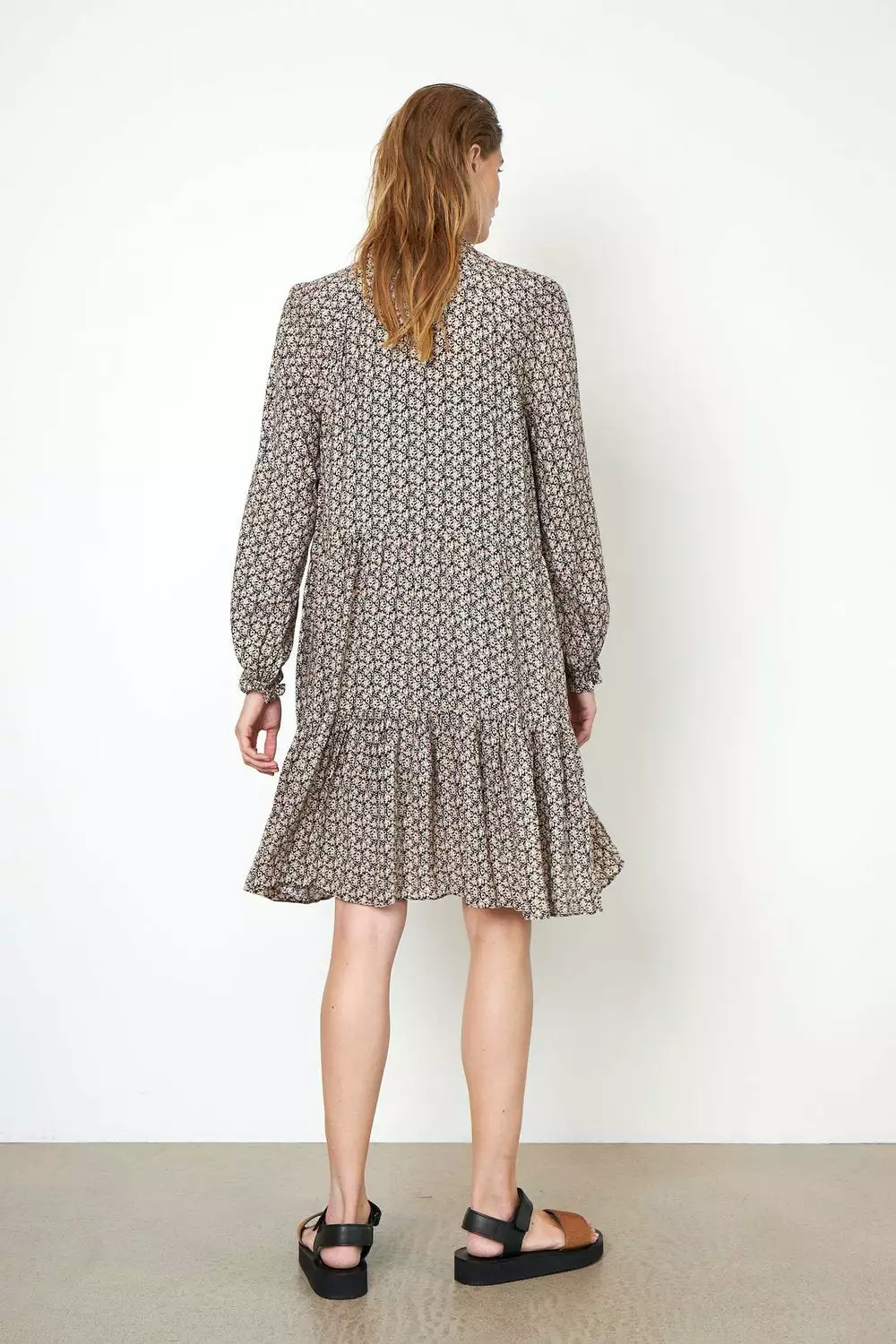 Frank dress fra Second Female. Denne nydelige kjolen er laget i en vakker, 100% viskosekvalitet. Kjolen har klassisk krage med frynser rundt og dyp V-utringning med snøring. Den har flytende, lagdelt skjørtdel og voluminøse raglan-ermer med elastisk mansjett.