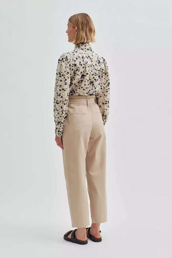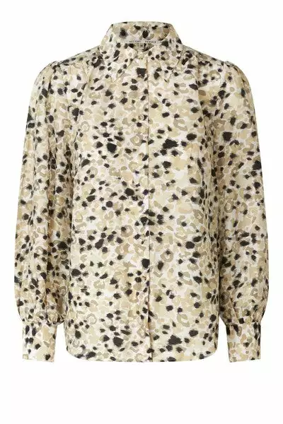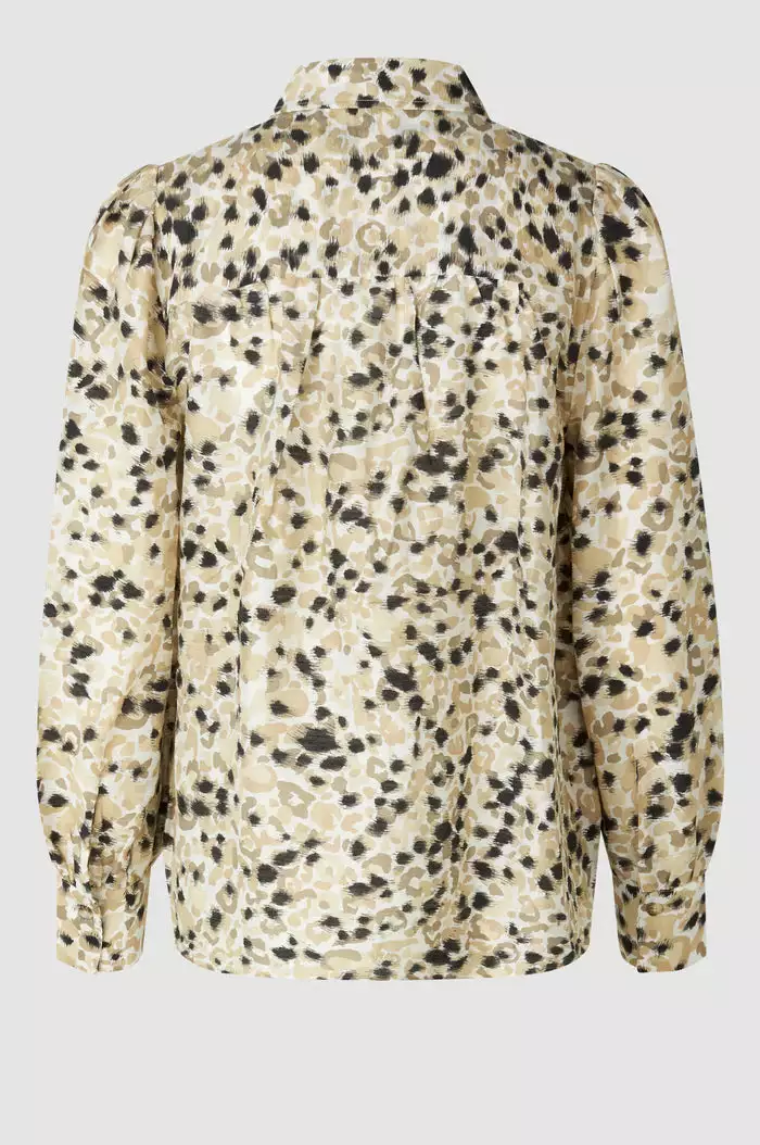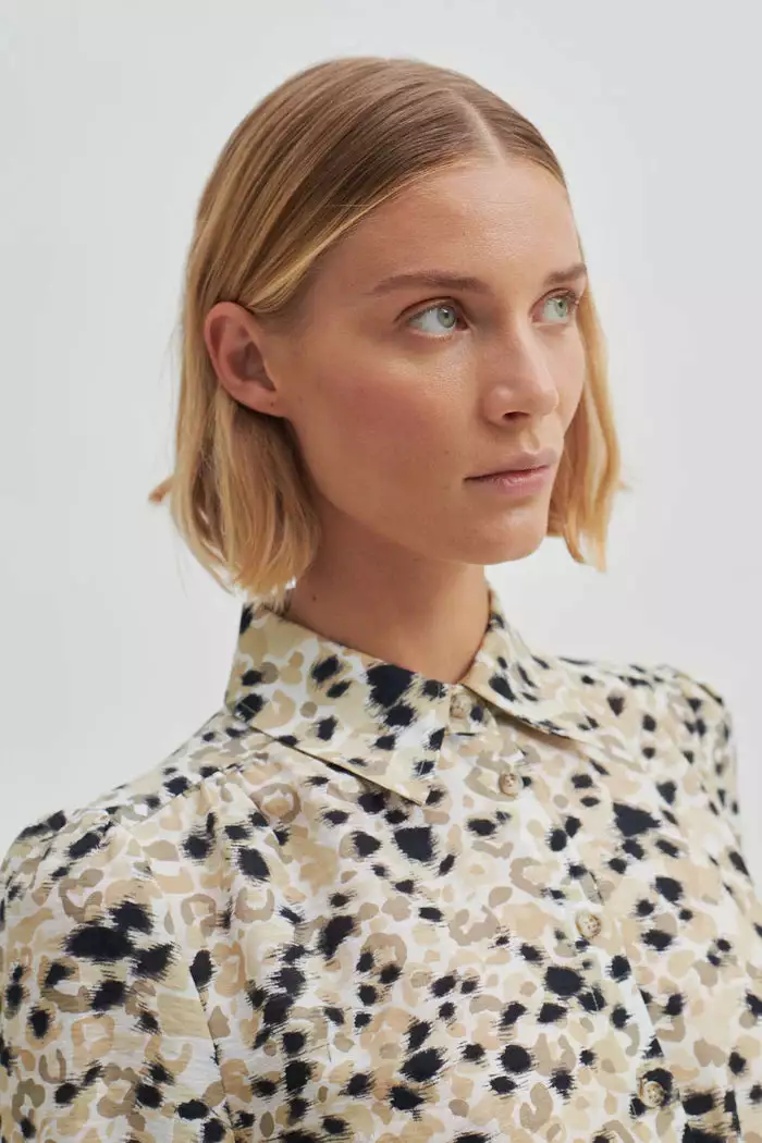 Gaura Shirt fra Second Female. Laget i lett og halvgjennomsiktig tencel-blanding med et print i ulike beigenyanser med sorte detaljer. Med spiss krage og knappelukking foran. Lange ermer og mansjetter med knapp. Formsydd kant med lengre rygg. Løs passform.