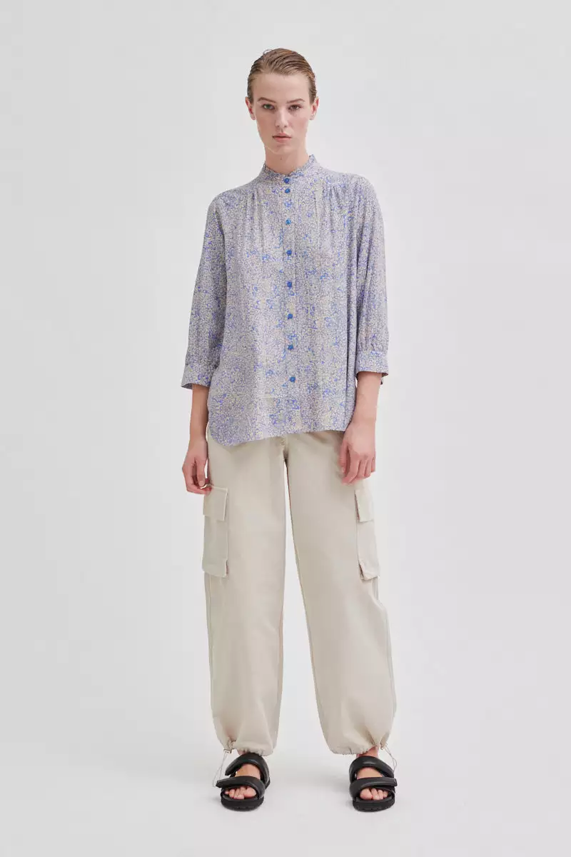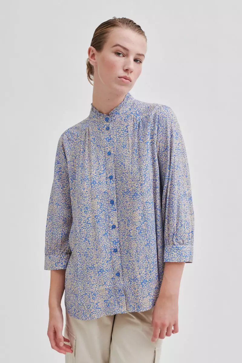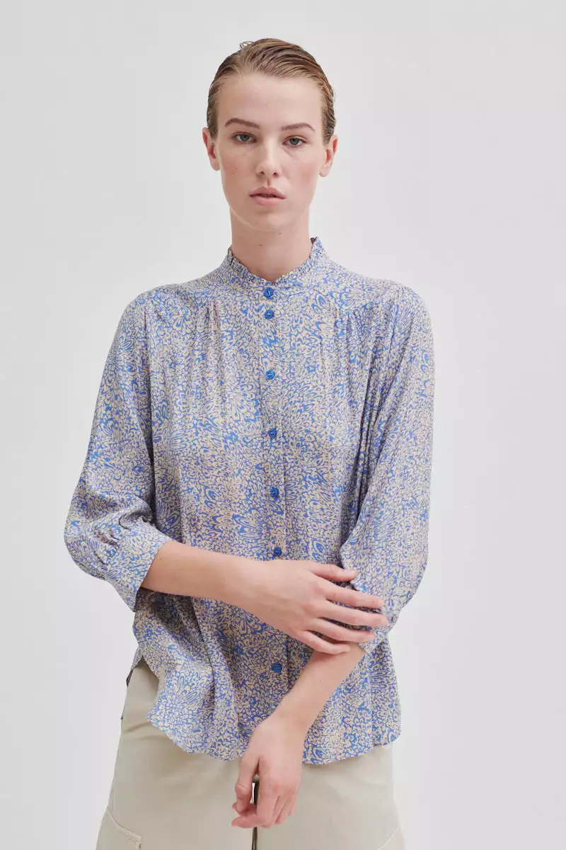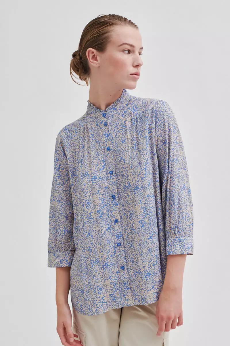 Gioia Shirt fra Second Female. Enkel og fin hverdagsskjorte fra Second Female.Gioia Shirt har 3/4 lange ermer og en liten krage med rysjekant. Skjorten har knappestolpe i front og en løs passform. Printet i blått gjør Gioia Shirt enkel å style til både jeans og lyse linbukser.