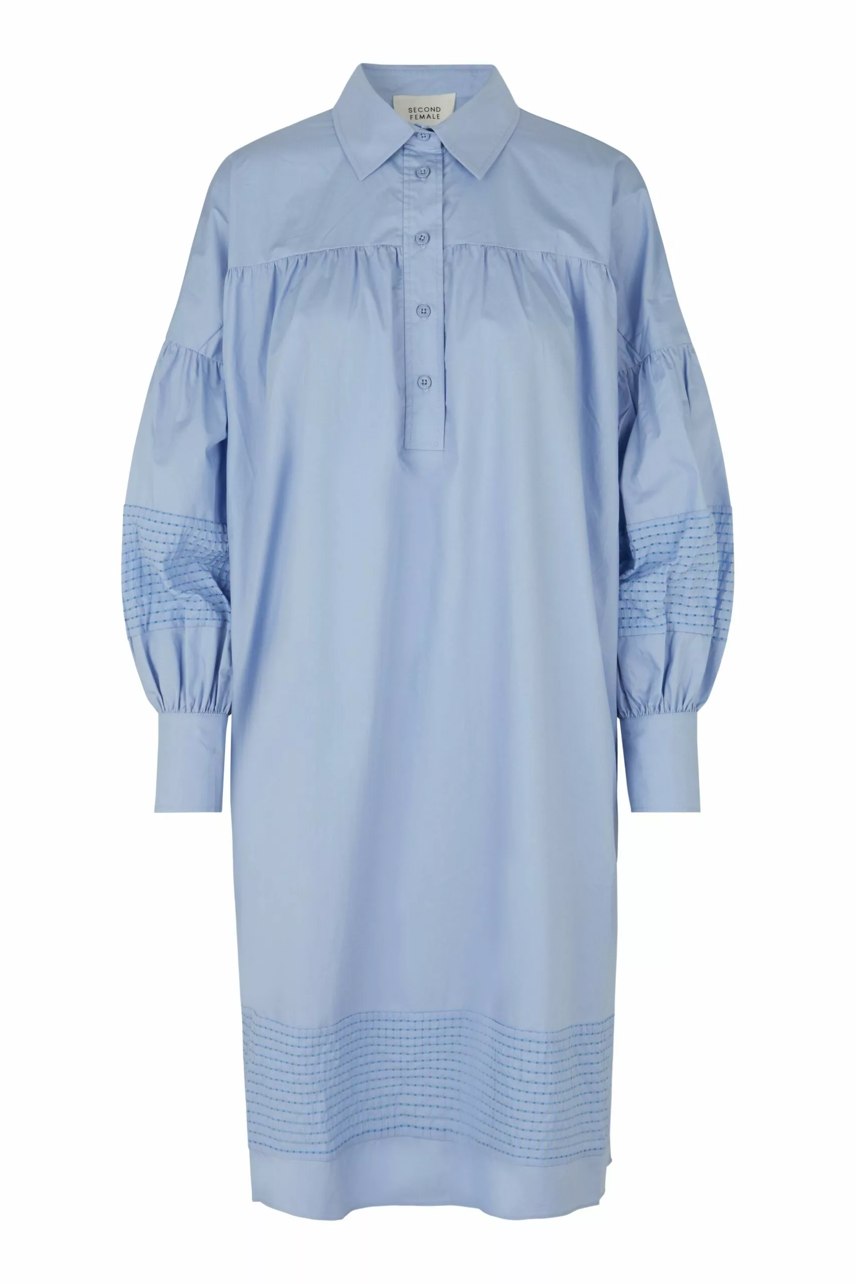 Henri New Shirt Dress fra Second Female. Herlig skjortekjole fra Second Female, med nydelige detaljer og en løs, behagelig passform. Henri har skjortekrage og knappelukking i front, ballongermer med lave skuldre og fine detaljer som også går igjen på skjørtet.
