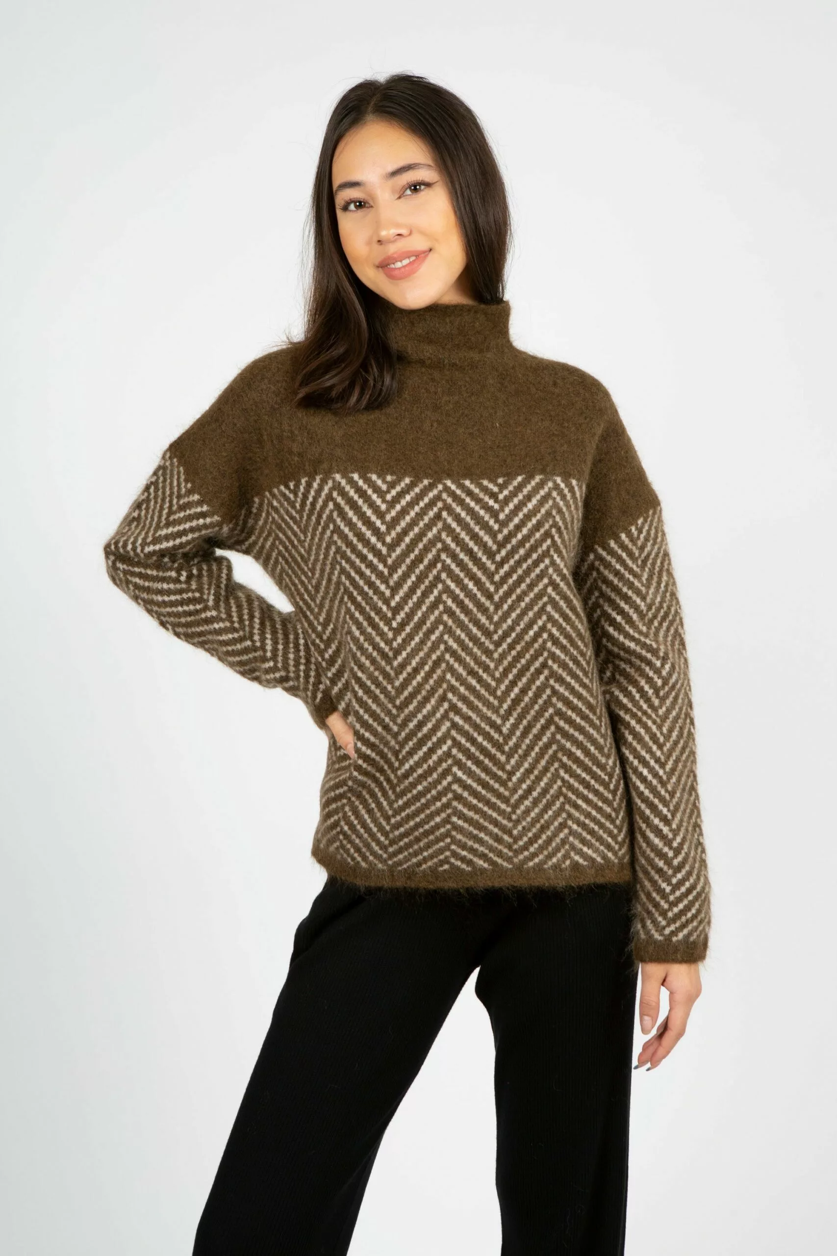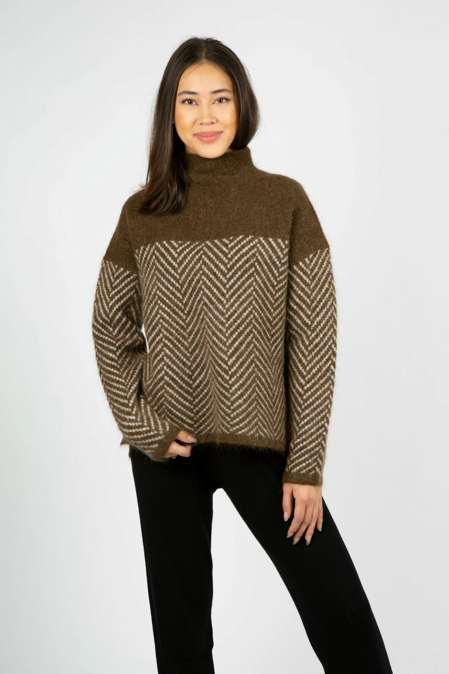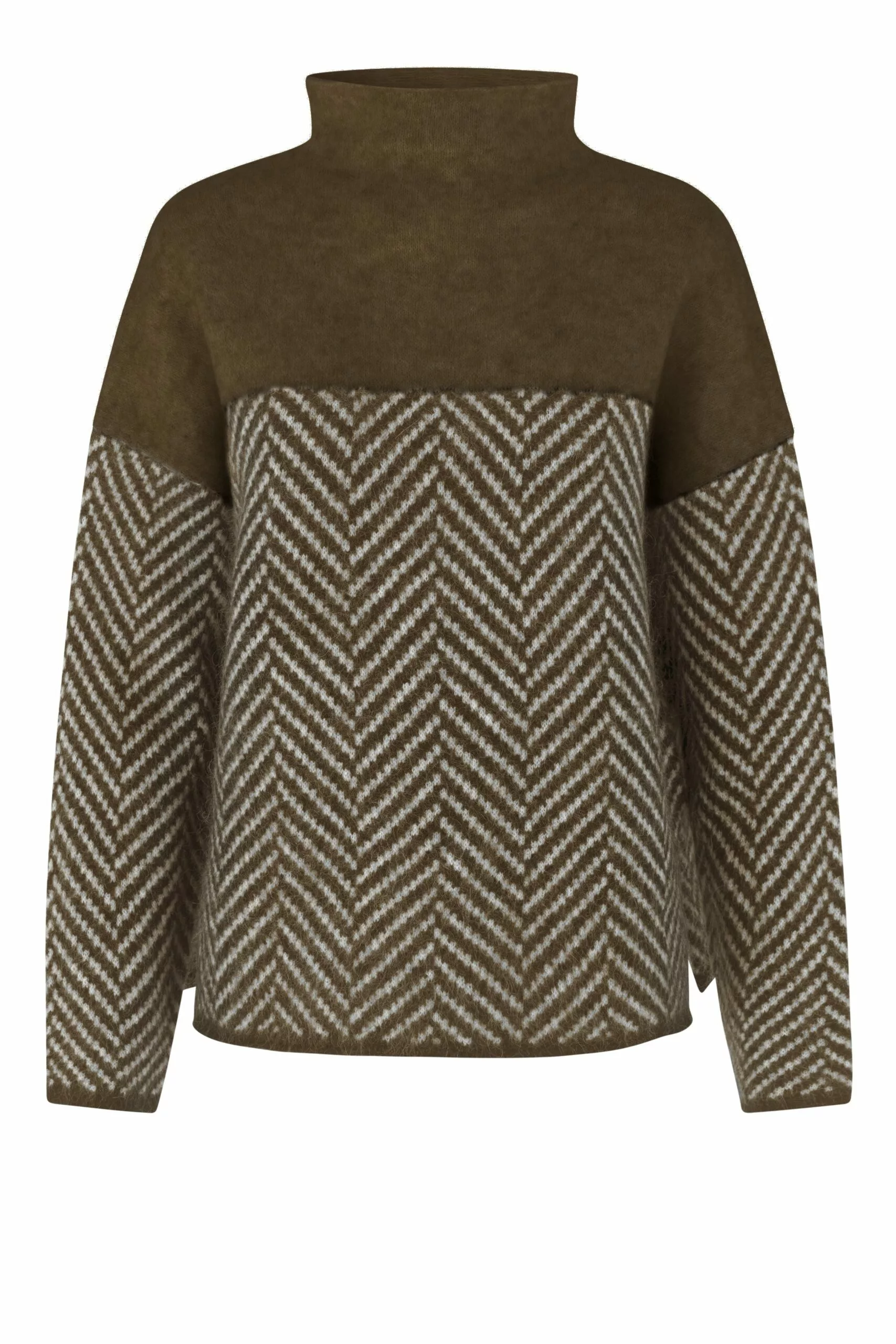 Herrin Knit T-neck fra Second Female. Merkets bestselger for sesongen! Myk og nydelig strikk med herring bone print laget av en fin mohair-blanding. Genseren har høy hals og lave skuldre, samt en avslappet passform. Varmer godt på en kald høst- eller vinterdag!