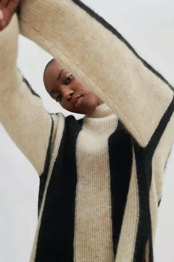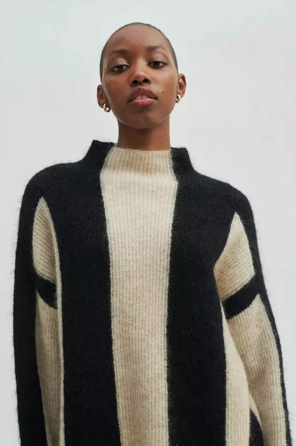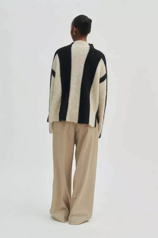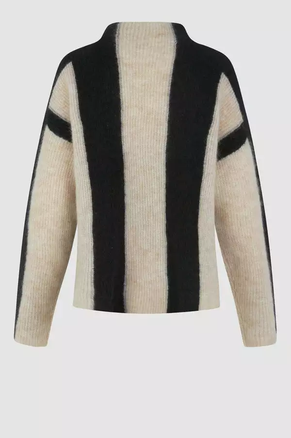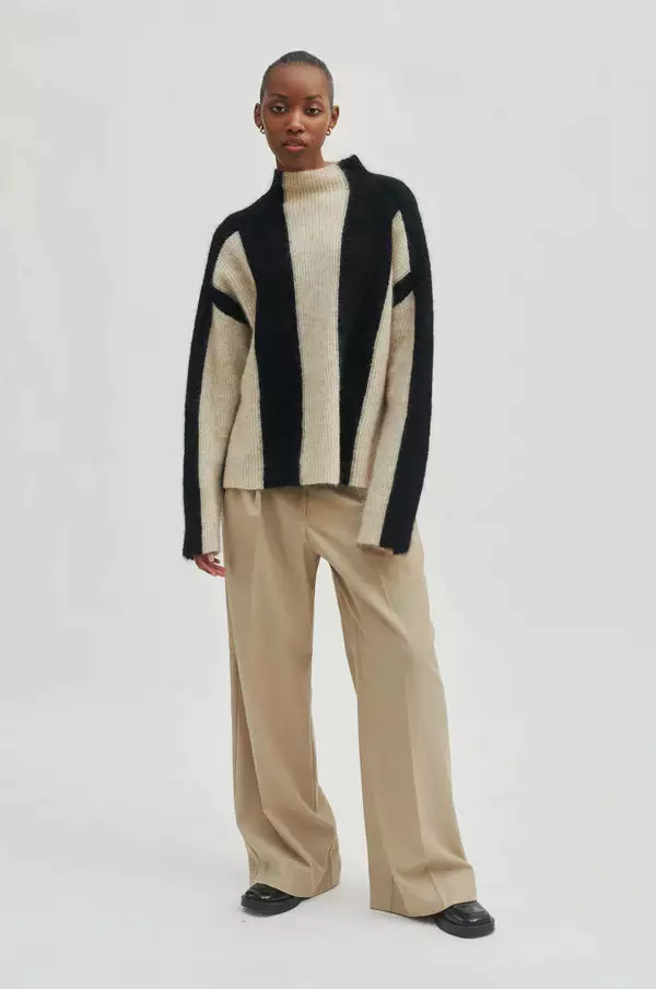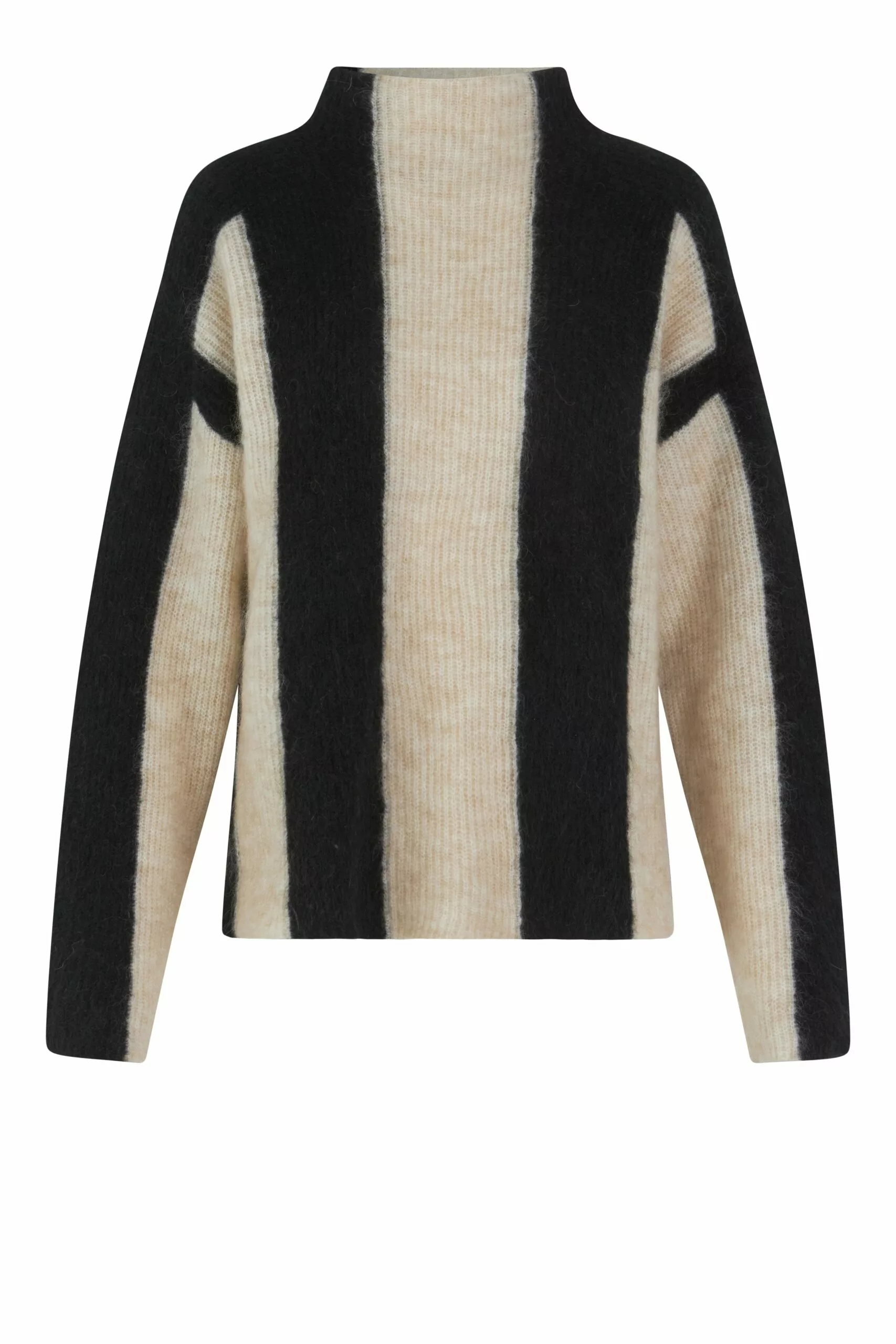 Hertha Knit T-Neck fra Second Female. En av høstens kuleste strikkegensere. God og varm genser med høy hals og lange ermer. Genseren er designet med vertikale striper i svart og beige. Denne gensere holder deg god og varm utover høsten, samtidig som du ser bra ut.