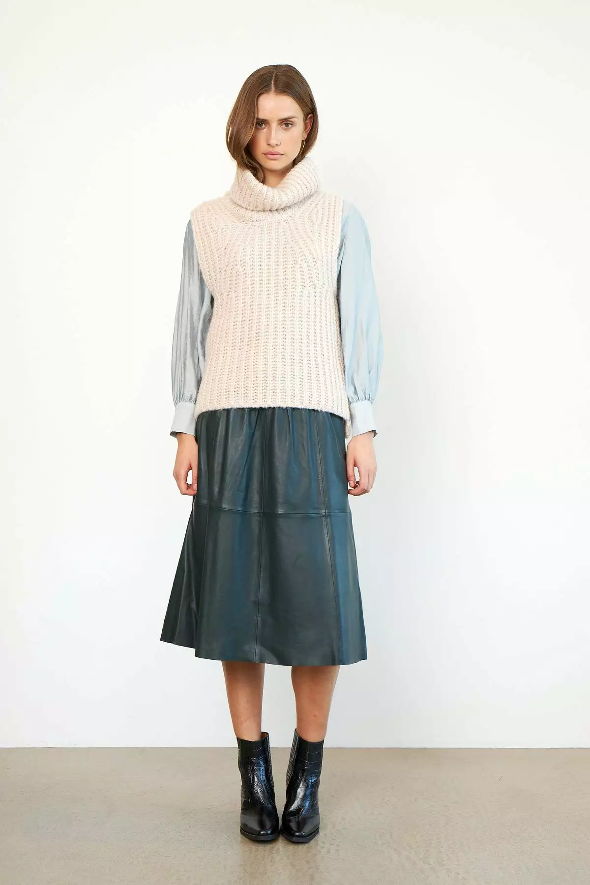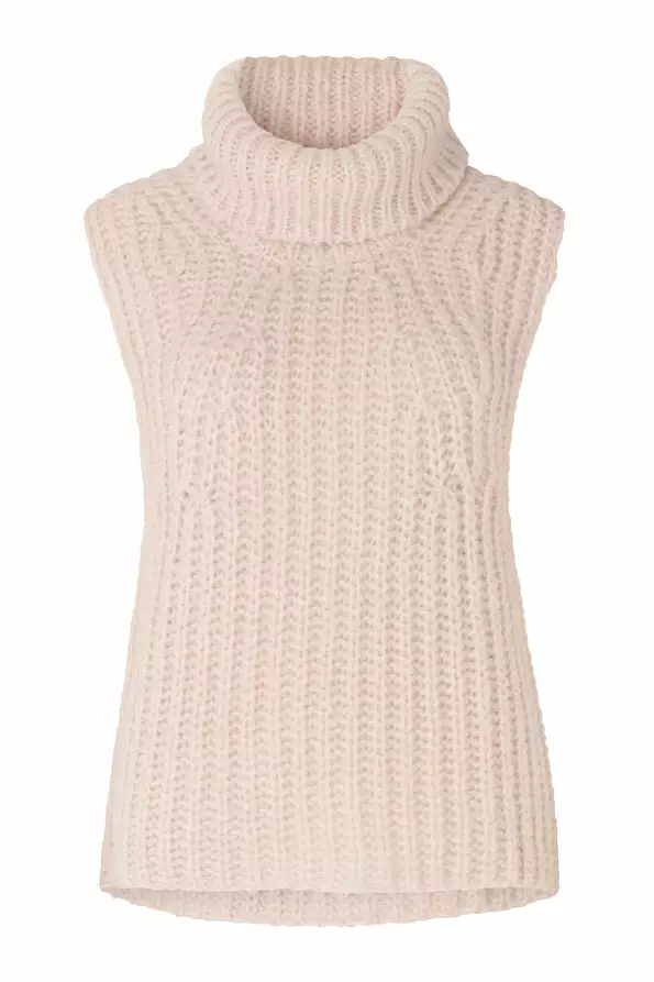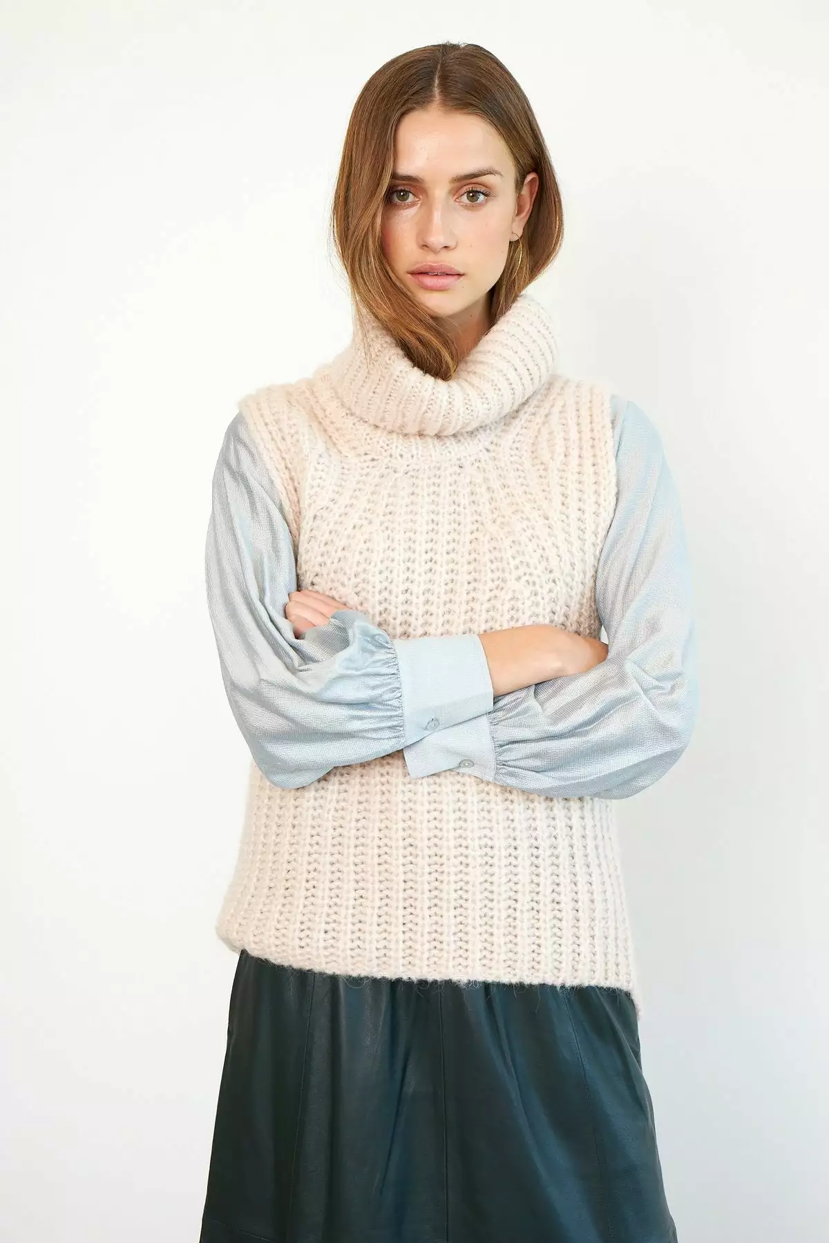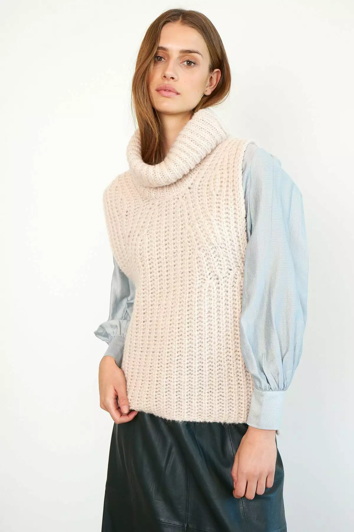 Ivory Knit Vest fra Second Female. Den perfekte strikkevesten for høsten! Denne trendy vesten er myk og behagelig med høy hals. Style den over en genser eller en skjorte.