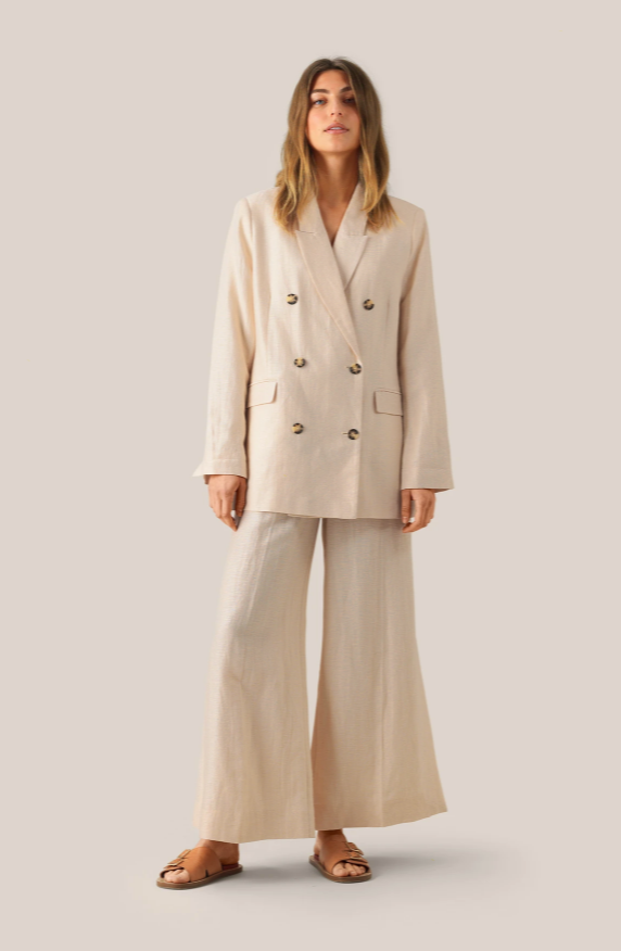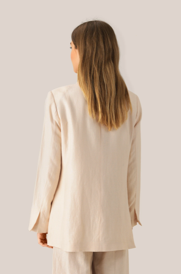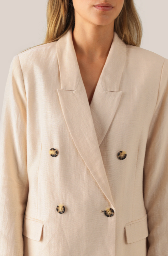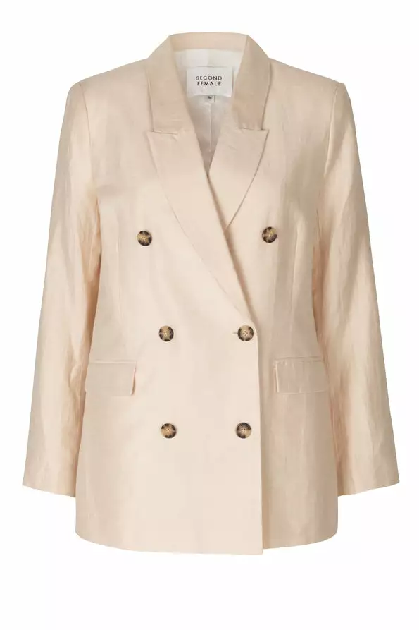 Lia Blazer fra Second Female er kul blazer laget i et ekslusivt stoff laget av tencel og lin. Jakken har klassisk krage, knapper og lommer foran. Denne blazeren har en oversized passform. Match den med et par kule linbukser for en avslappet stil.
