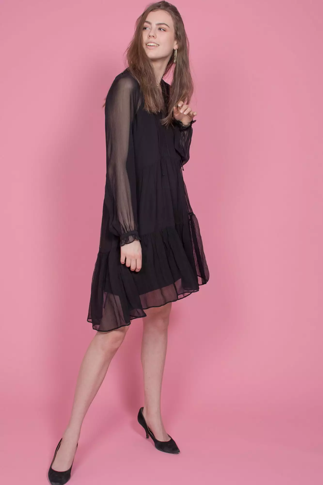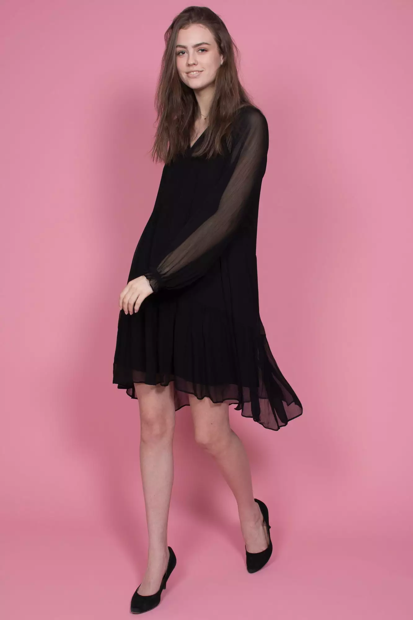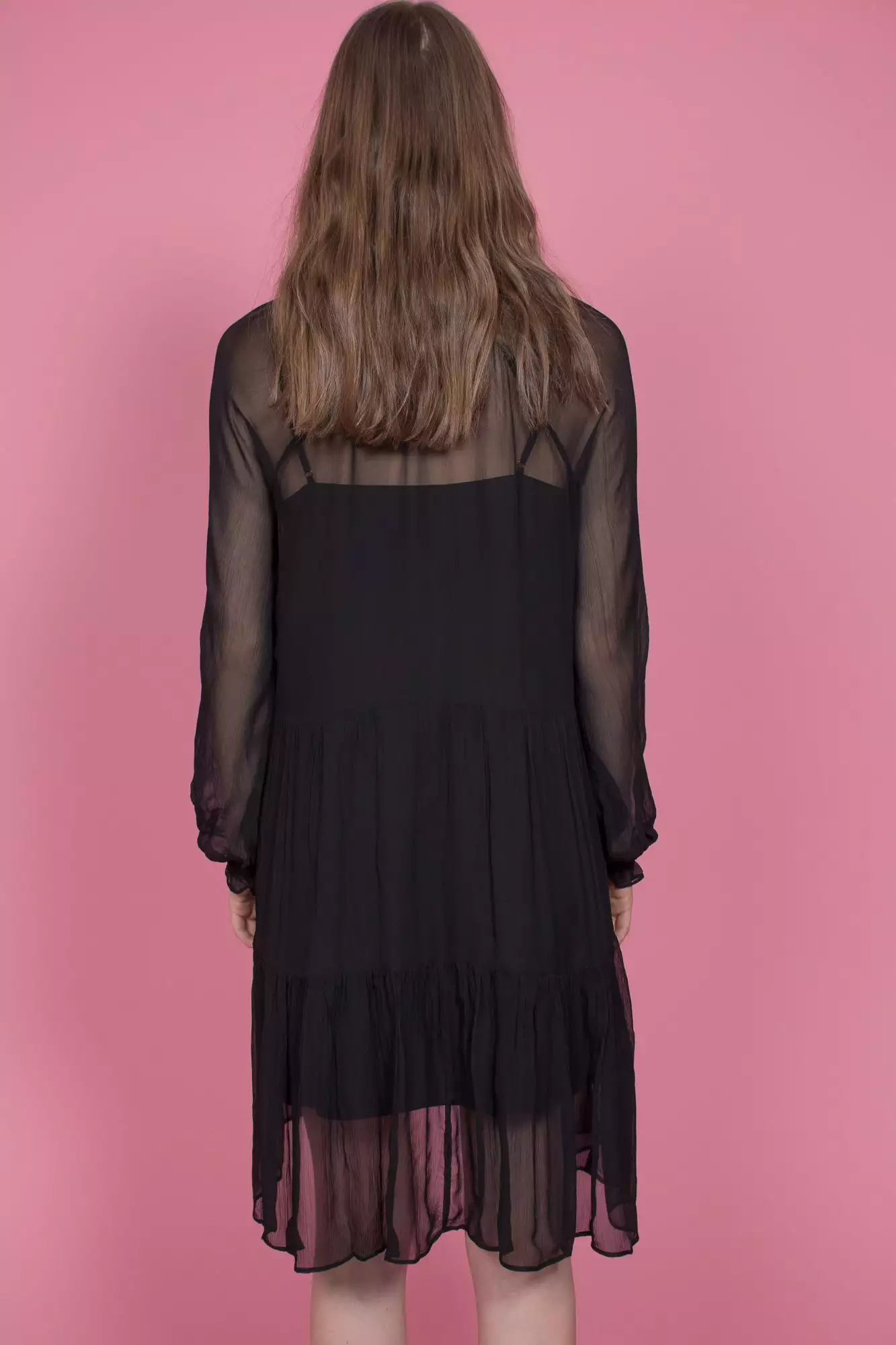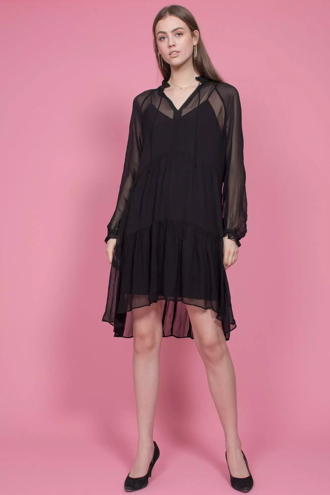 Kjempefin langermet kjole med bånd rundt halsen. Kjolen er gjennomsiktig ved armpartiet.