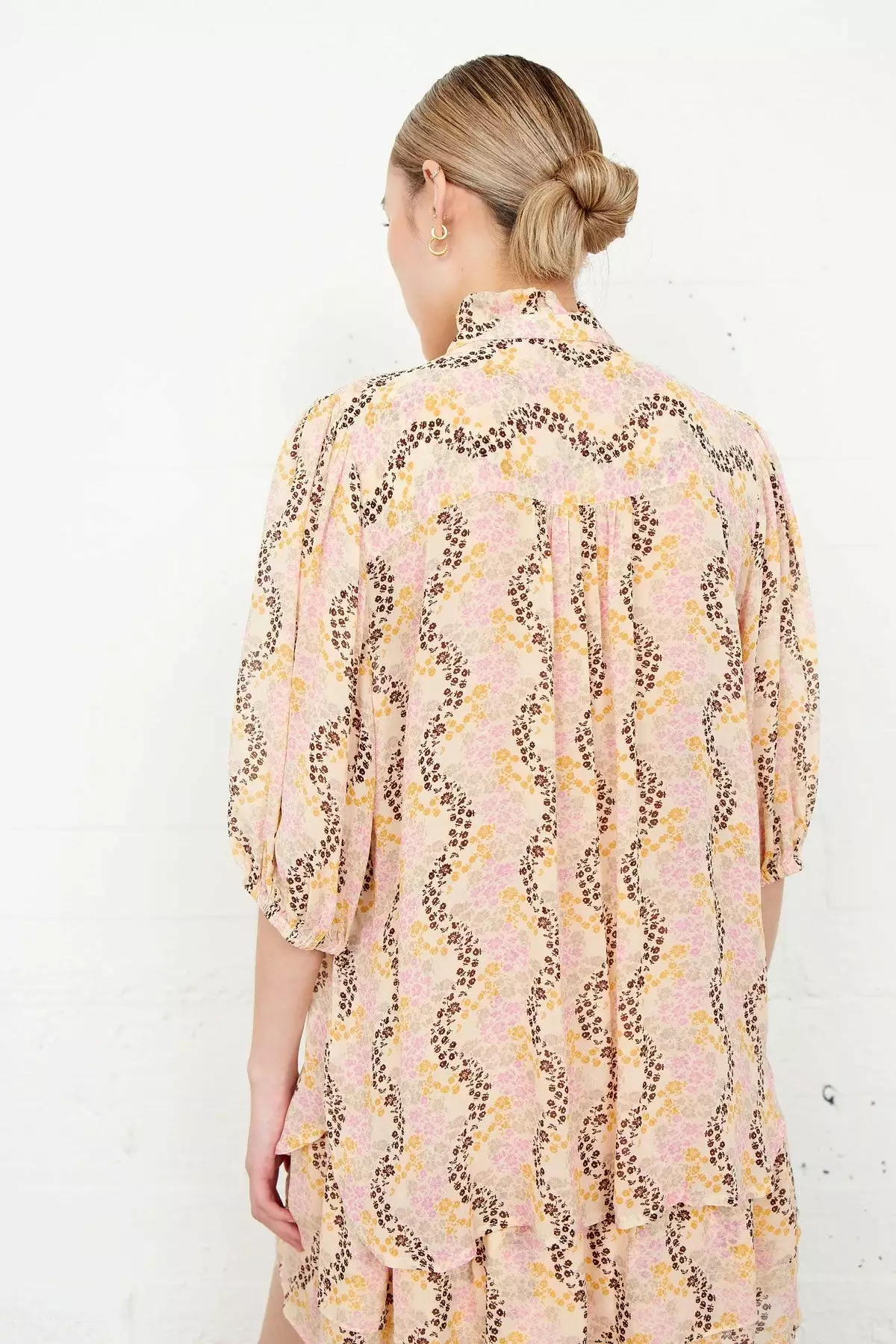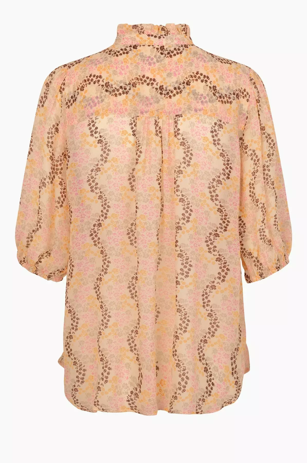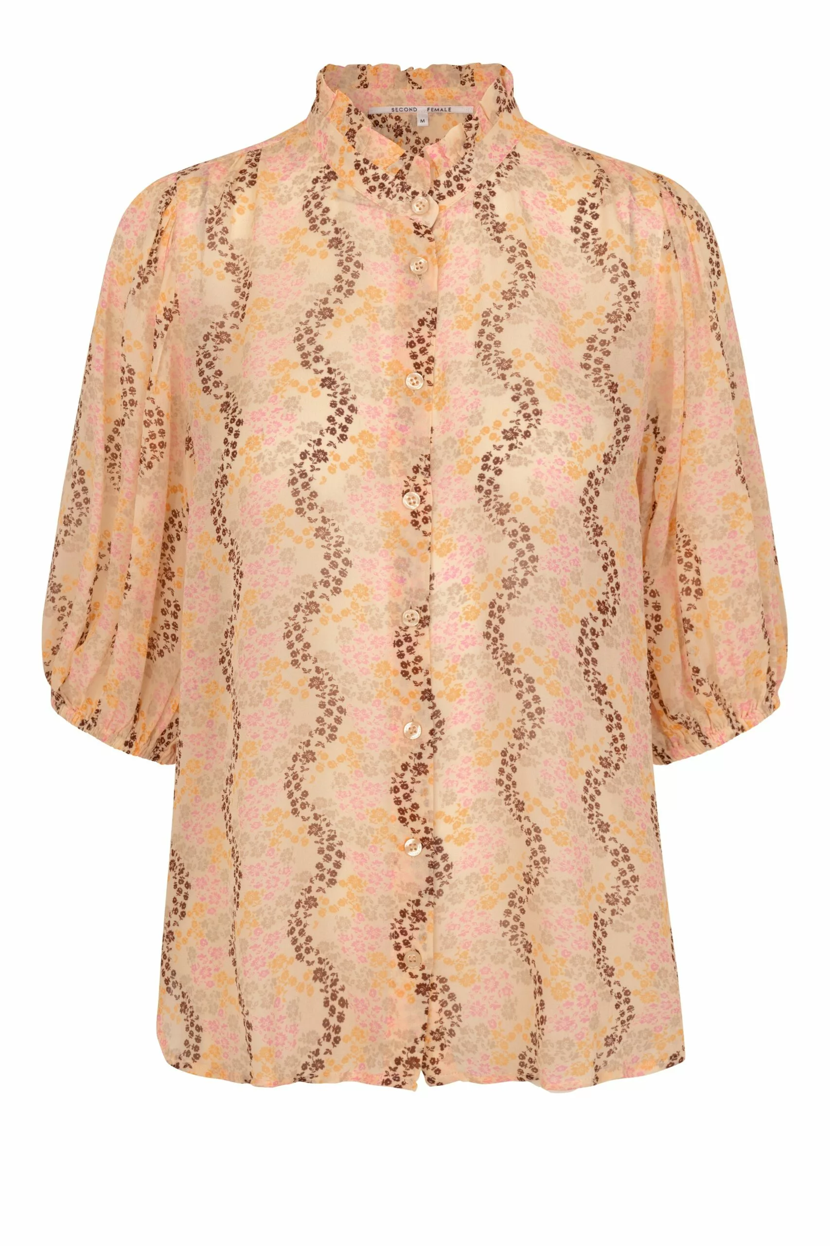 Magne Shirt fra Second Female. Nydelig bluse fra Second Female, som enkelt kles opp og ned gjennom våren og sommeren. Kombiner den med Magne Skirt og et par høye heler for en festlook, eller en vid bukse og sneakers for en casual, men velkledd hverdagslook. Halvgjennomsiktig viskose med trykk, krage med volangkant og en løs og luftig passform samt halvlange ermer.