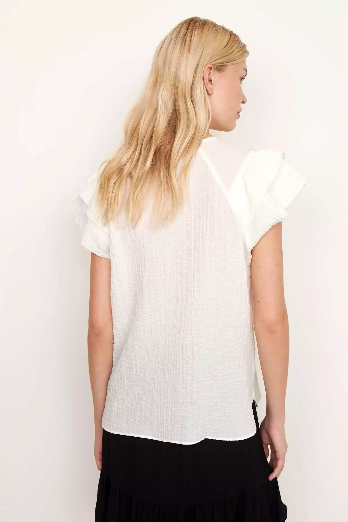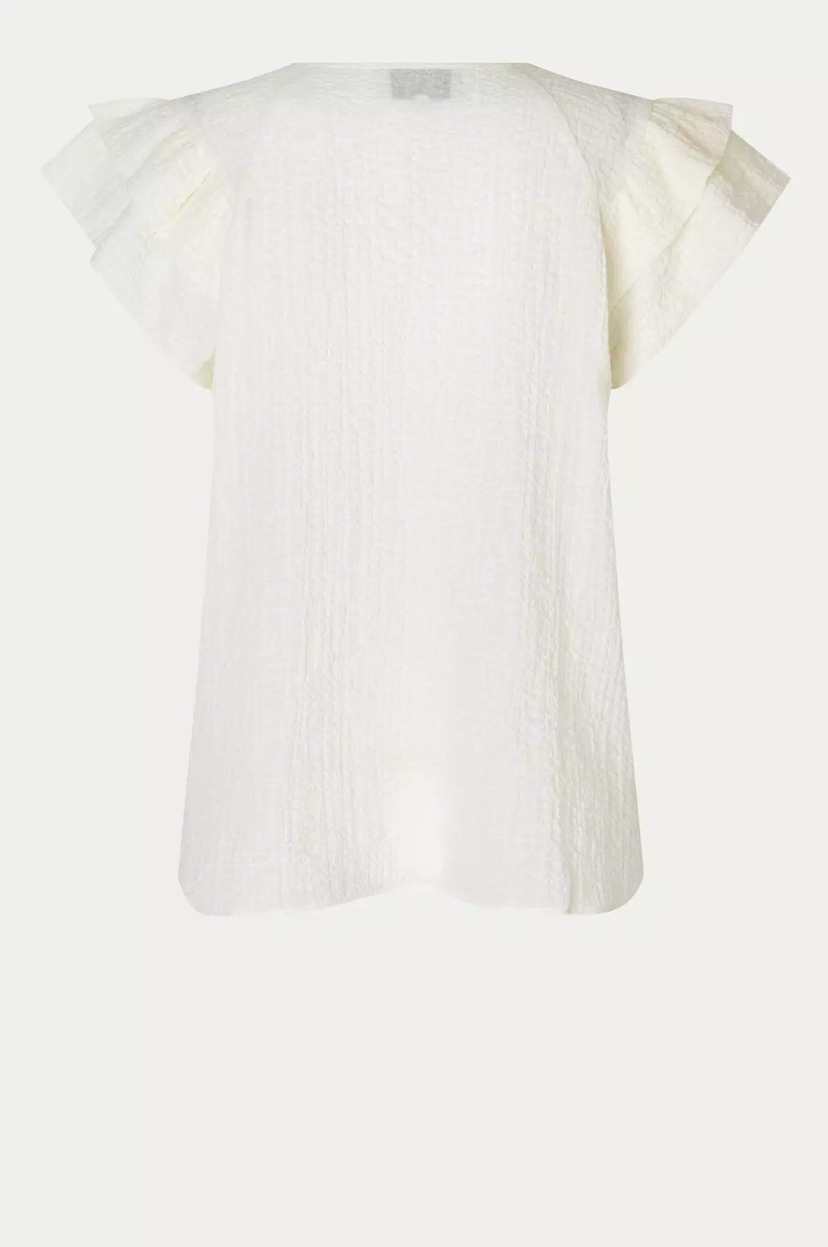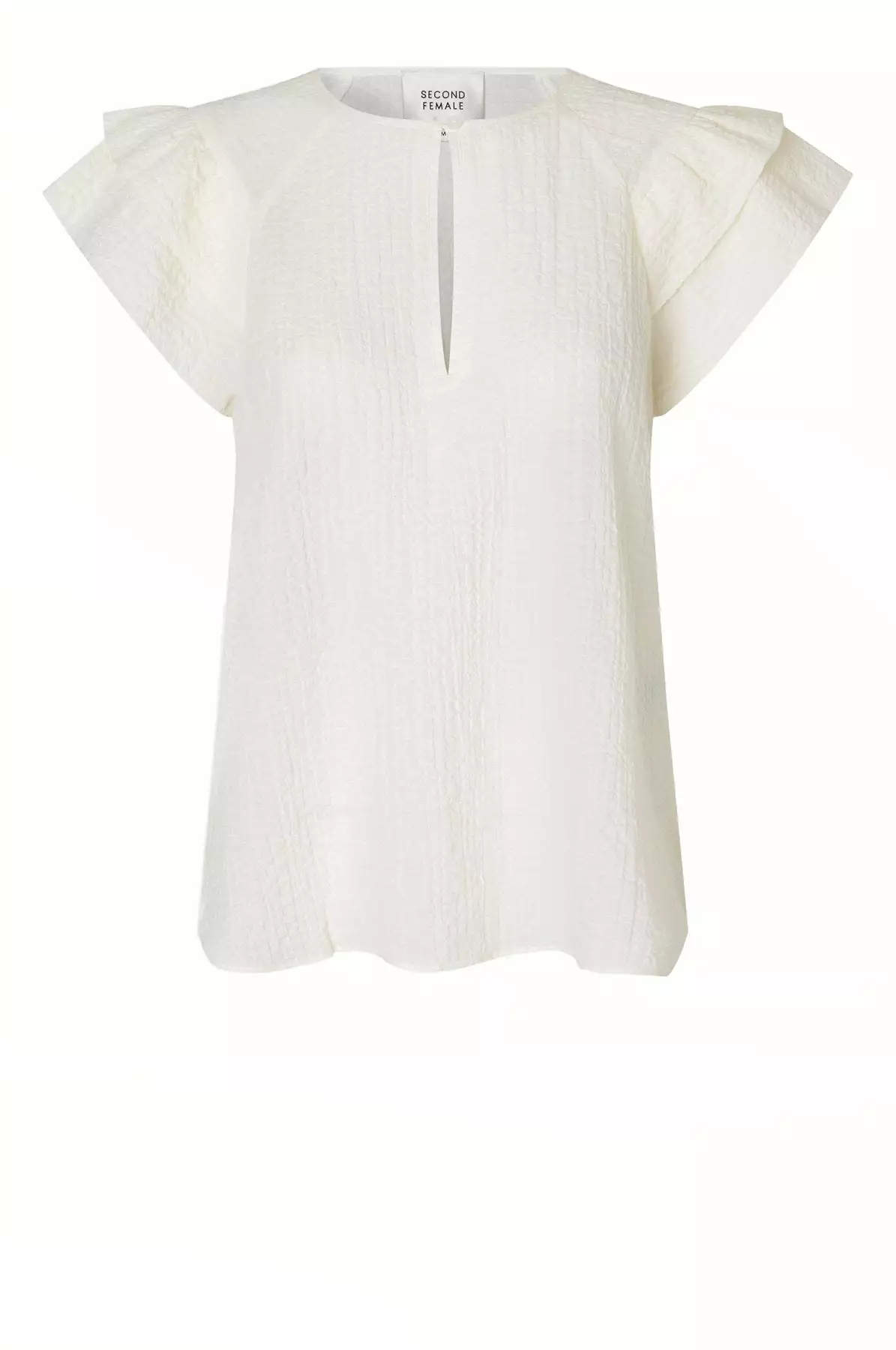 Mallorca Top fra Second Female. Denne toppen laget i en strukturert bomullsblanding i seersucker-kvalitet. Toppen har raglanermer med volangdetaljer og avslappet passform. Den har nøkkelhullsüpning med knappelukking foran. Style den med jeans eller sommerlige shorts.