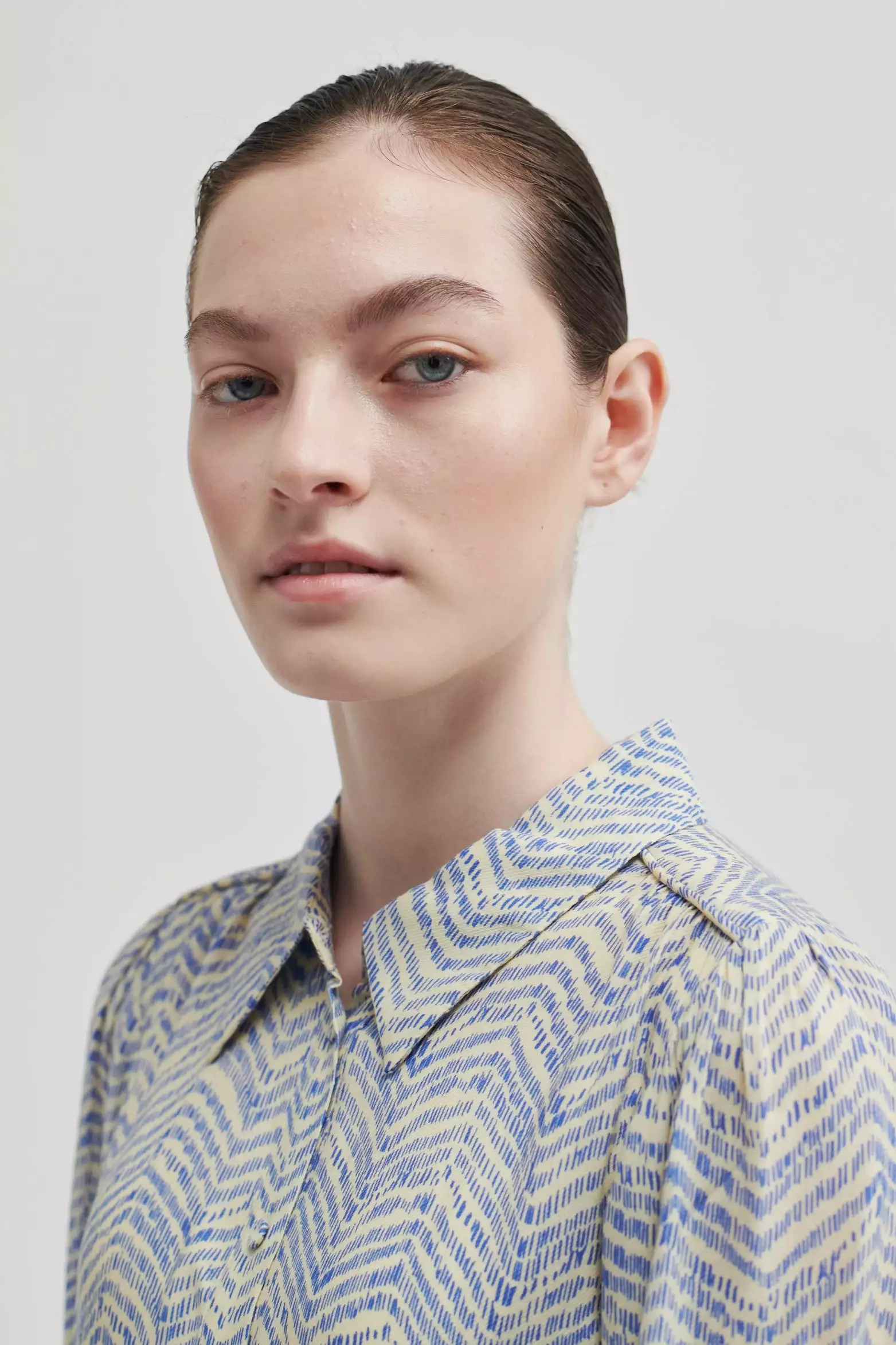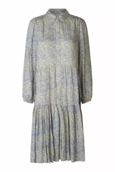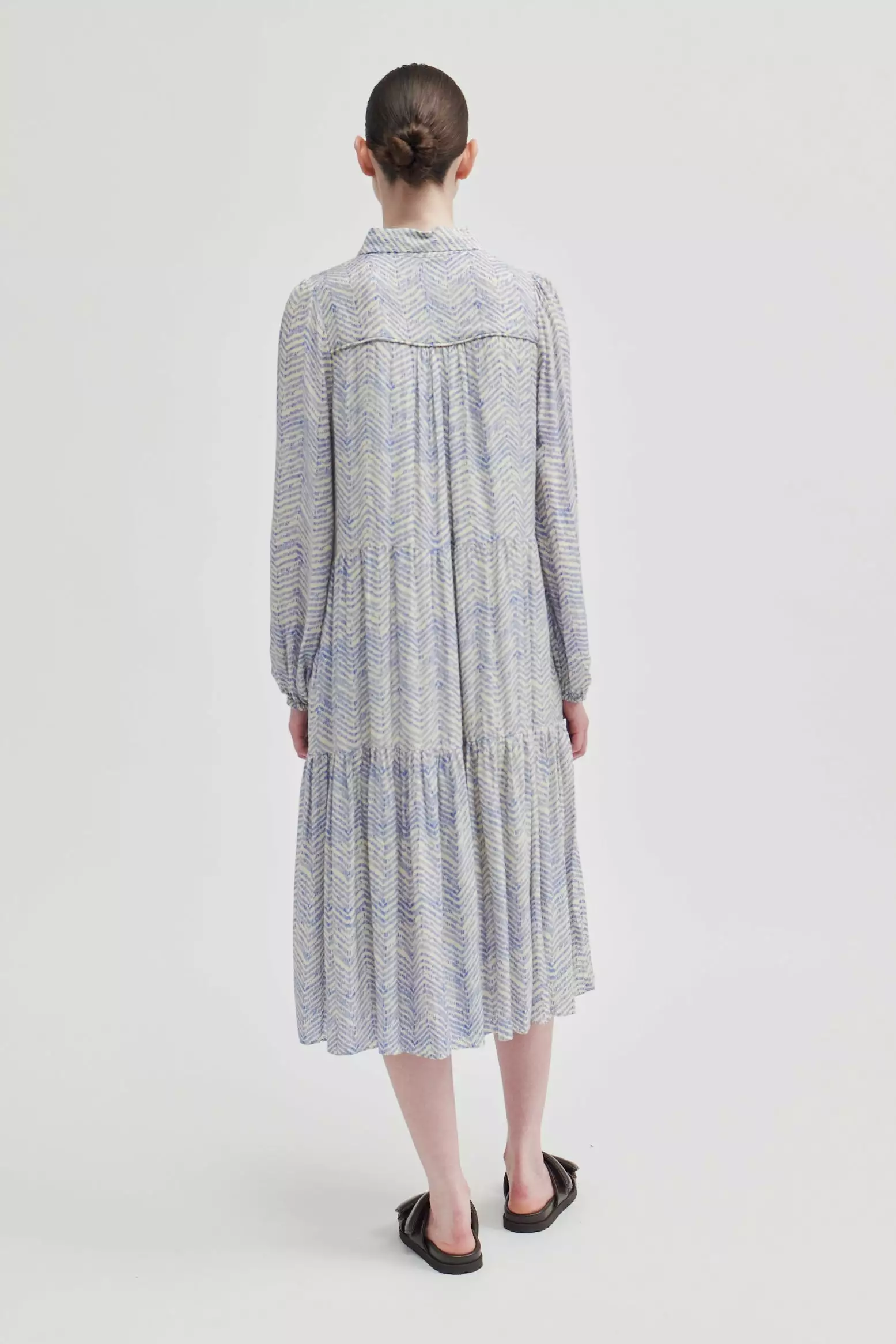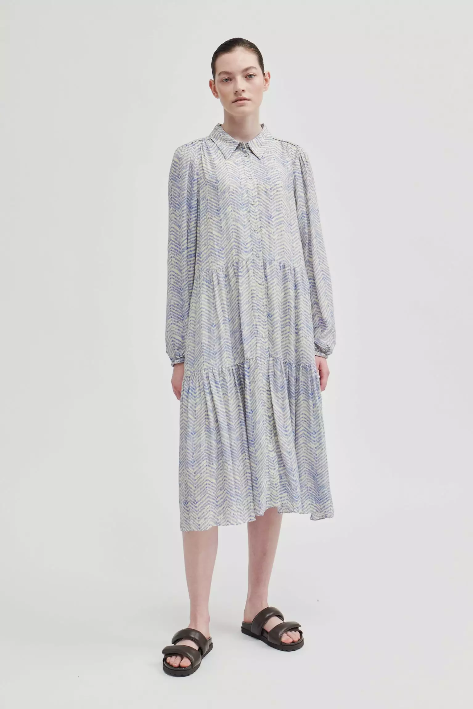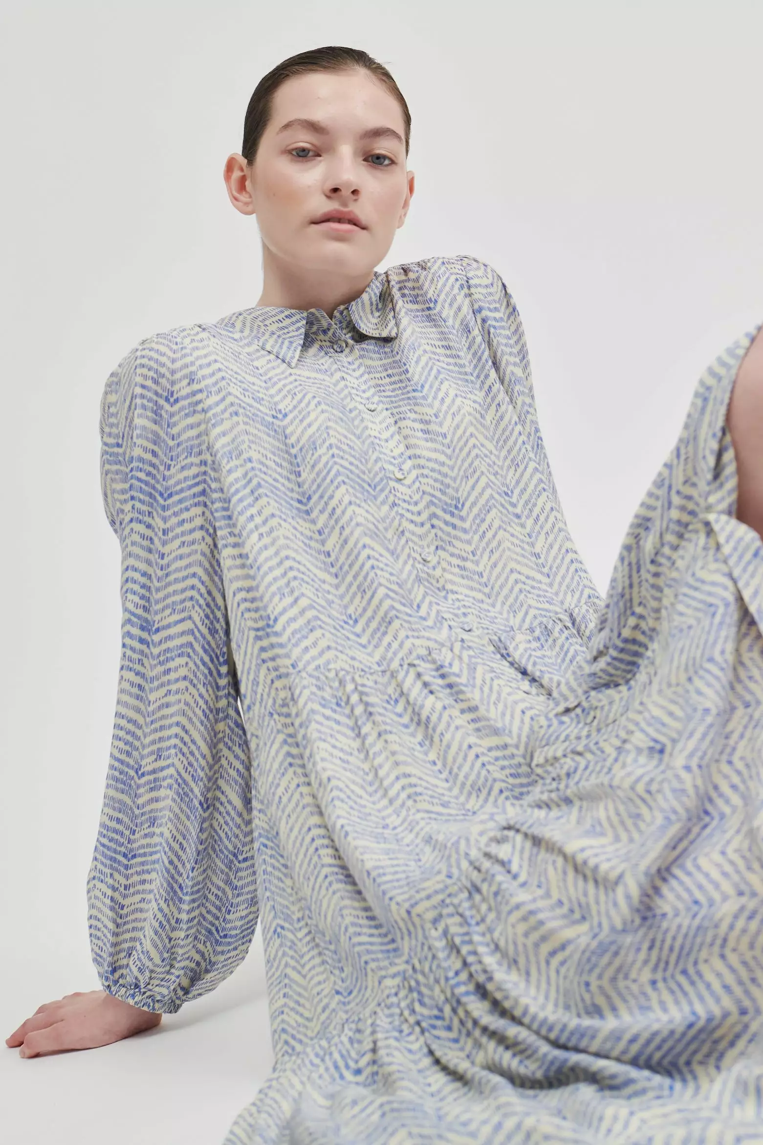 Mallow Dress fra Second Female. Fin kjole fra Second Female i et vakkert, organisk herringbone-print i blått på en delikat cream bunnfarge. Mallow Dress har lange ballongermer med elastisk mansjett og puff på skuldrene. Kjolen har en løs og ledig passform, rund hals og knappestolpe i front. Mallow Dress har et fint fall i skjørtet som er etasjedelt med fine rynkedetaljer.