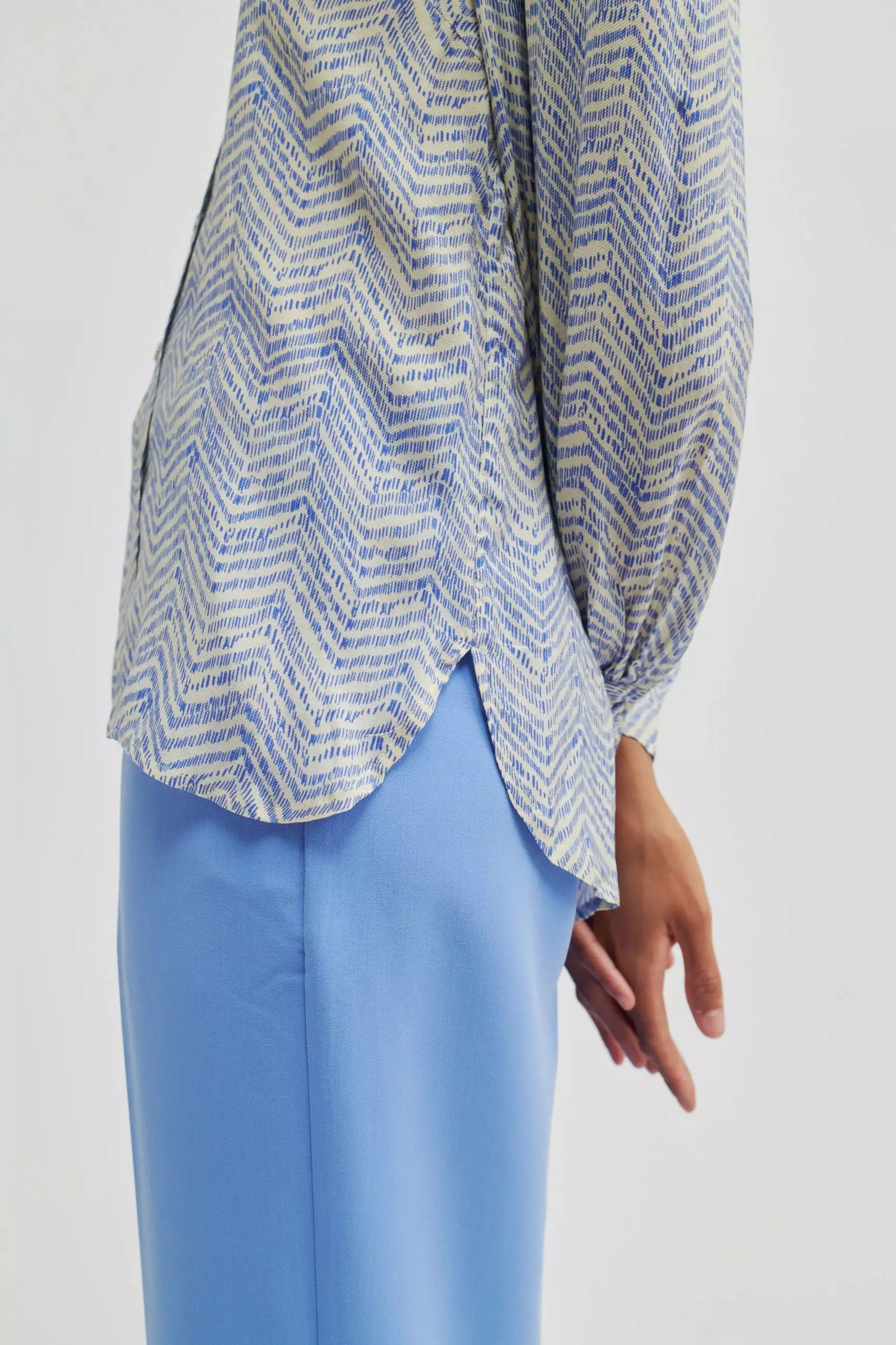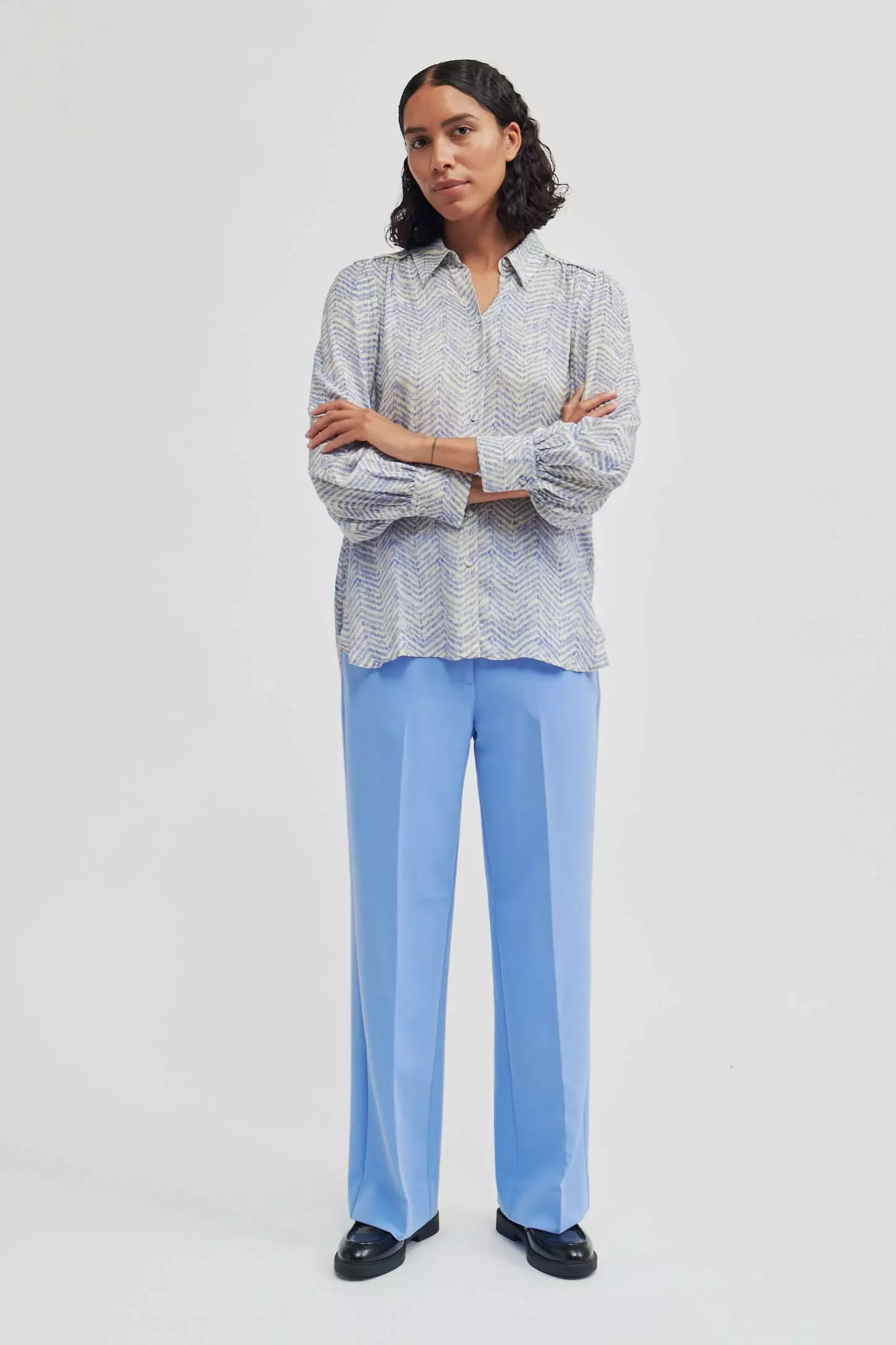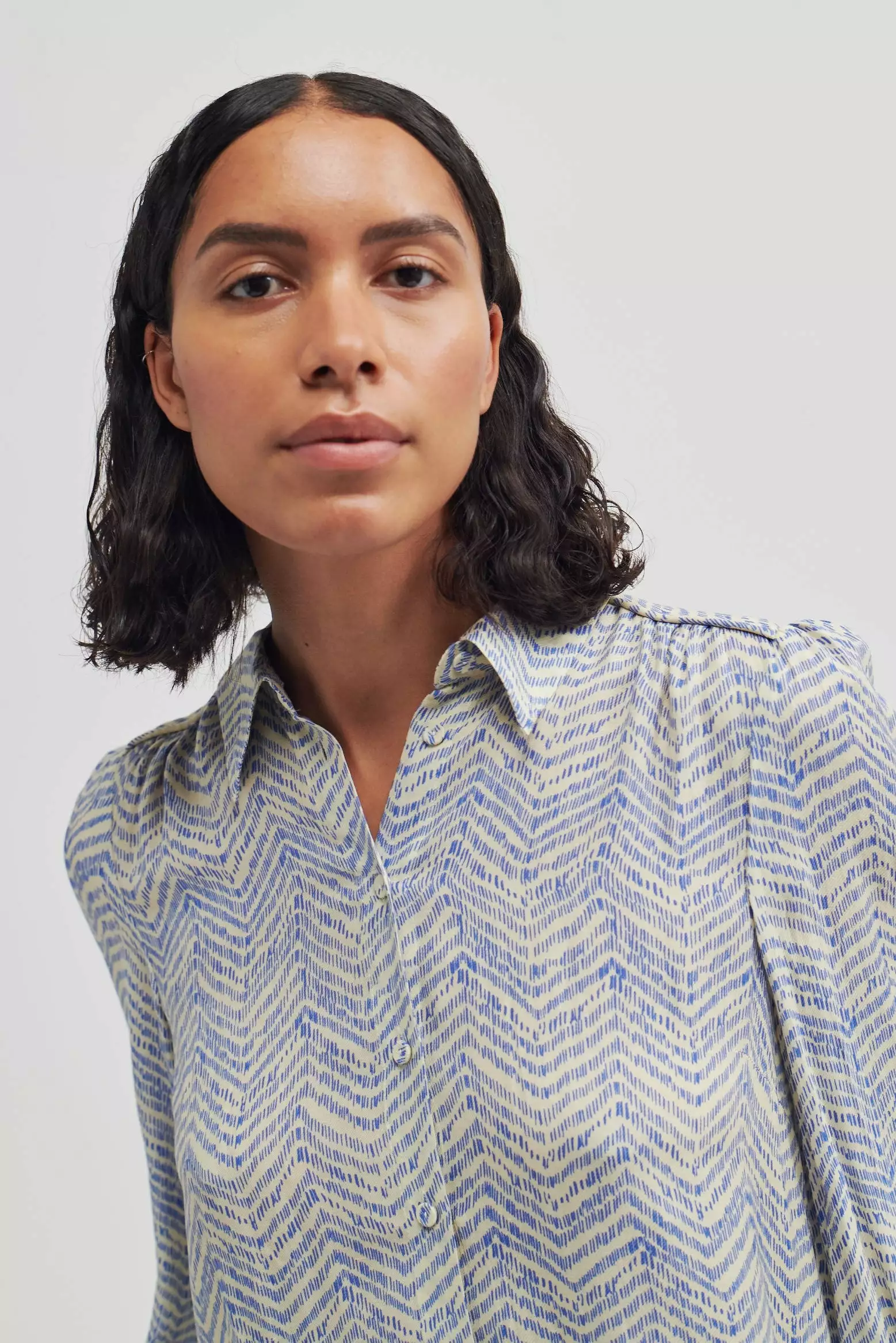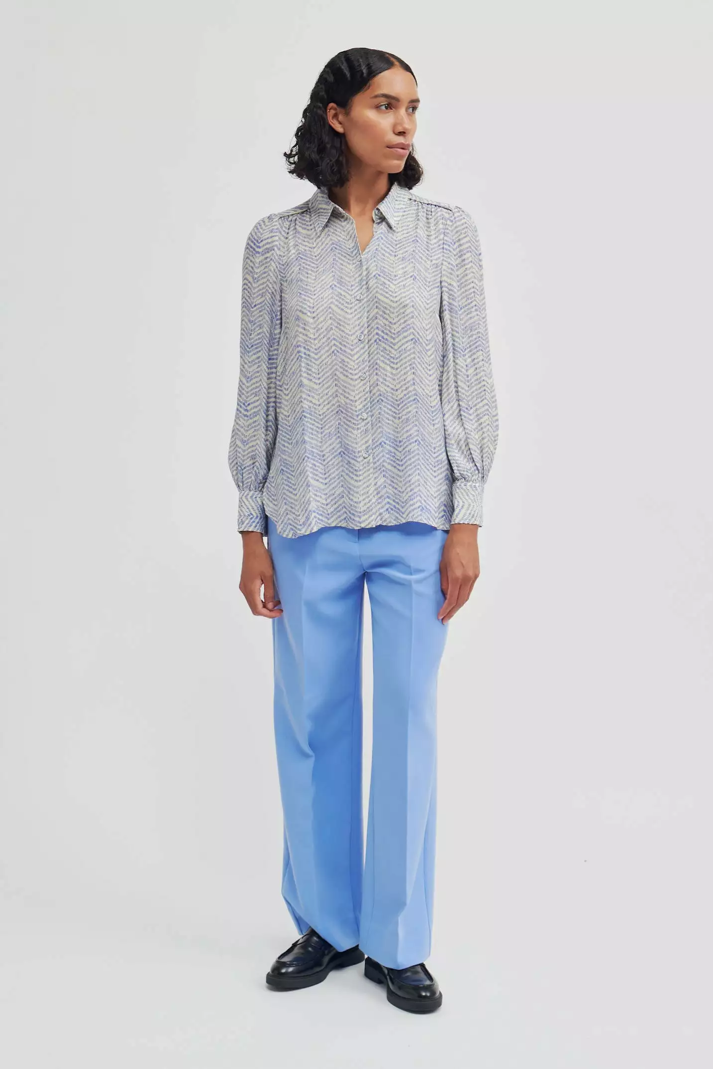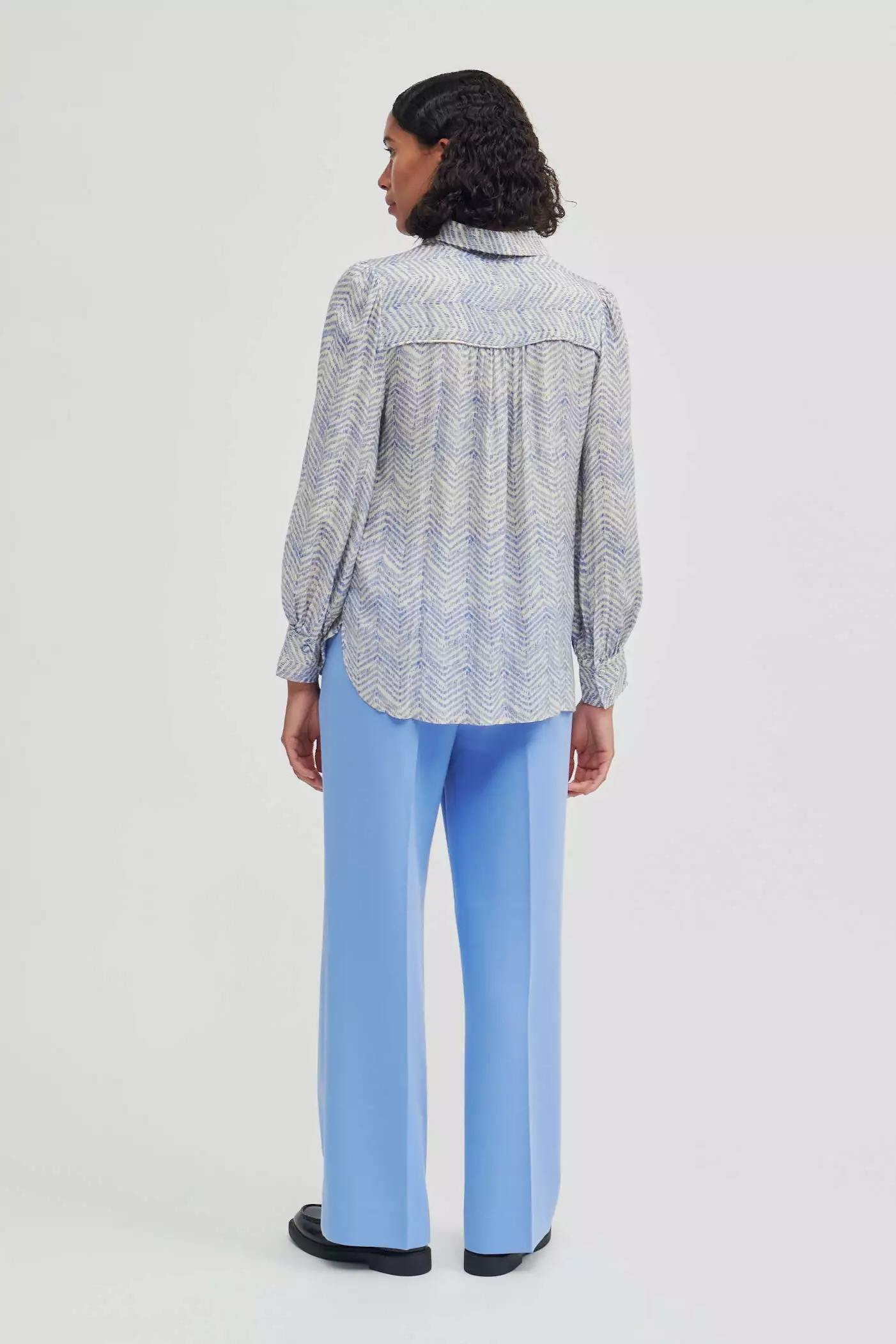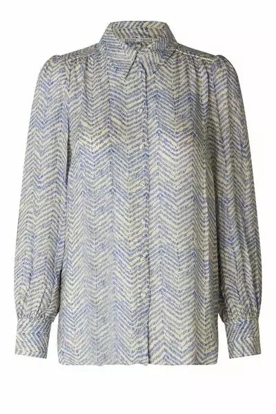 Mallow Shirt fra Second Female. Enkel og fin skjorte fra Second Female med organisng herringbone-print i blått og cream. Laget i supermyk og silkeaktig viskose med spiss krage og knappelukking foran med dekkede knapper. Lange ermer med rynkede mansjetter med knappelukking. Pipekant foran og bak på skuldrene. Søm over ryggen med rynker for å skape en feminin effekt. Avslappet passform.