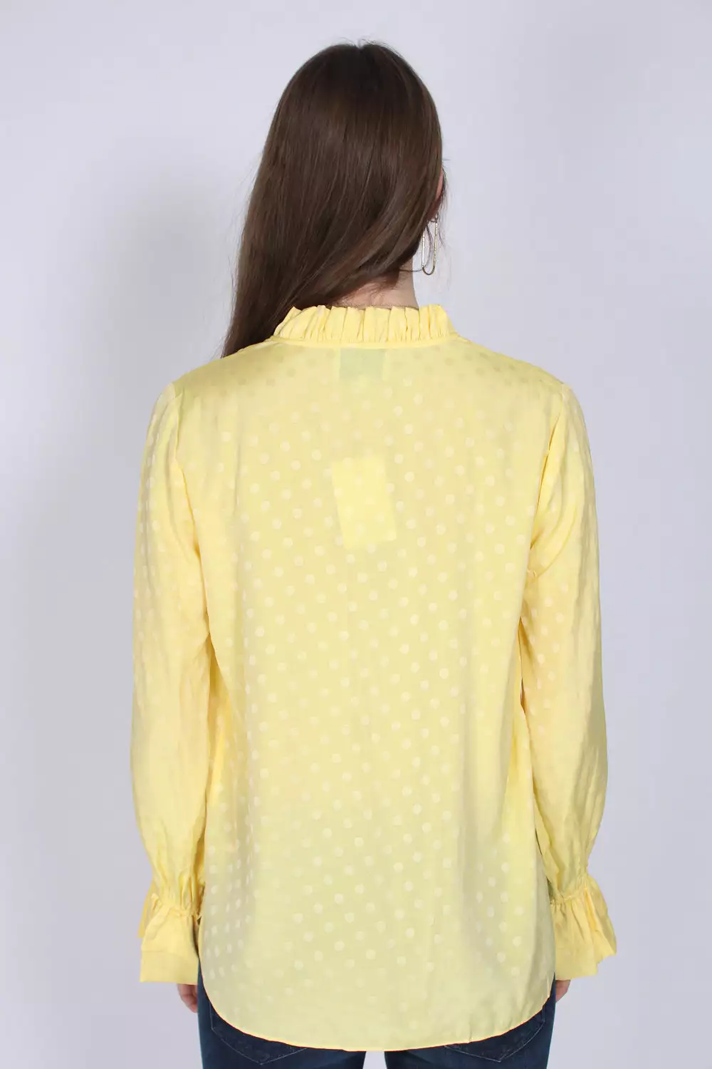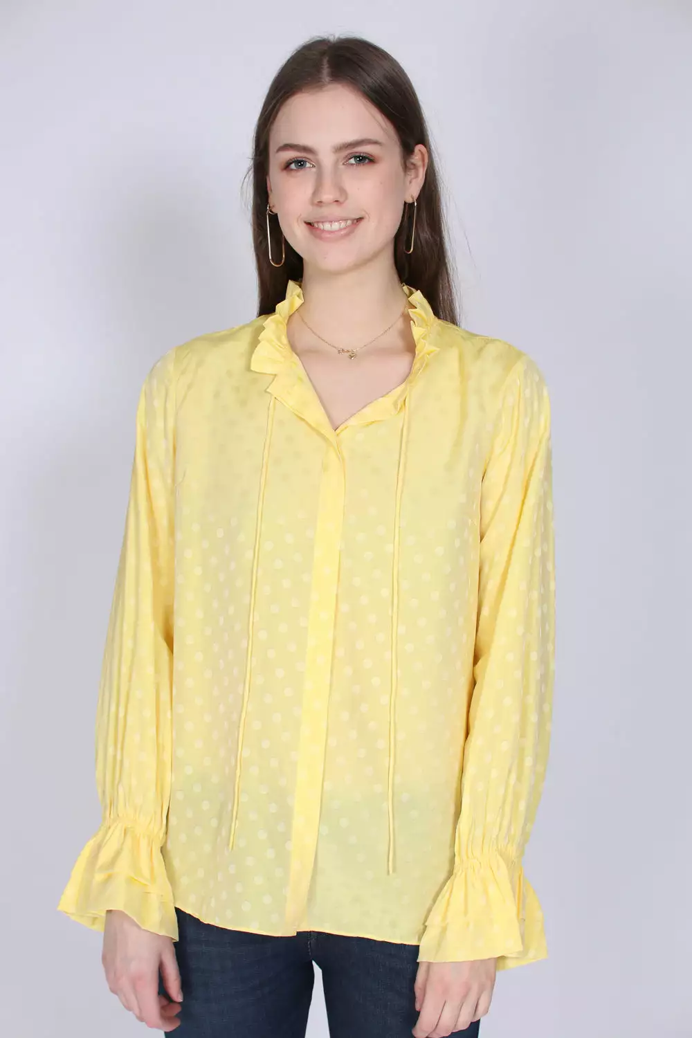 Søt bluse som kan pyntes opp til fest eller bruke til hverdags. Den har snor rundt halsen som kan knytes. Blusen henger løs på kroppen.