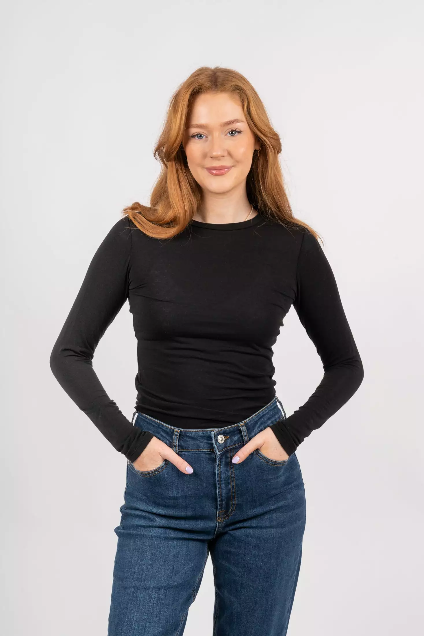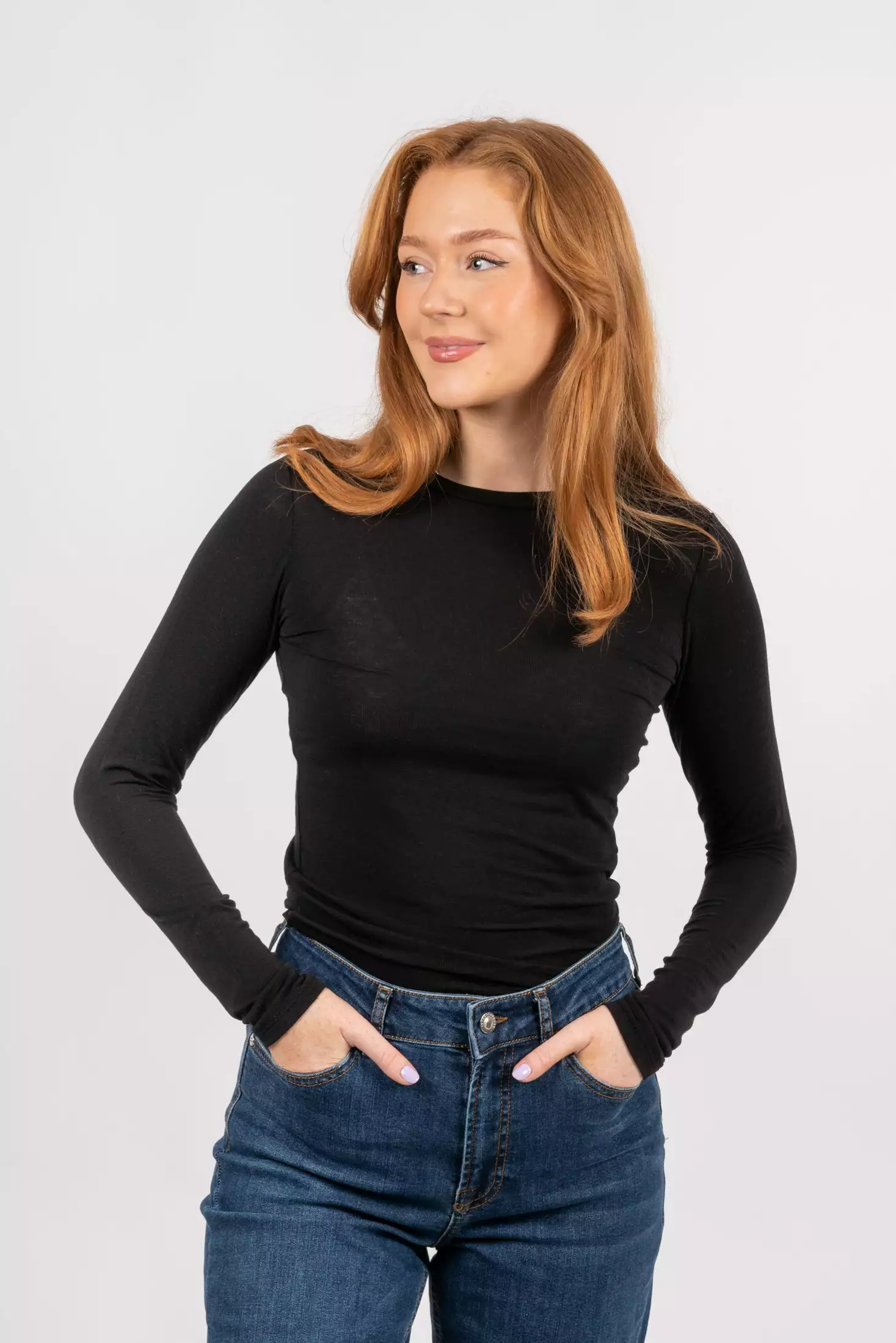 Matima O-Neck Tee fra Second female. Langermet t-skjorte laget i en fin merino- og tencel-blanding. T-skjorten har avrundet hals og tettsittende passform. Fungerer perfekt som et baseplagg for layering denne sesongen.