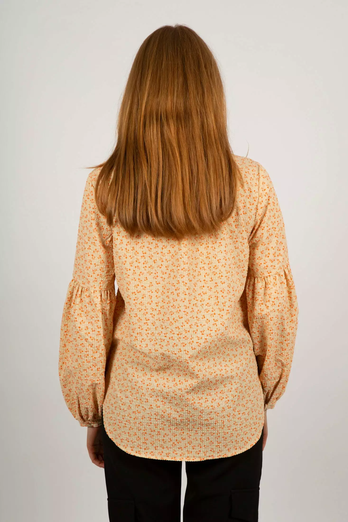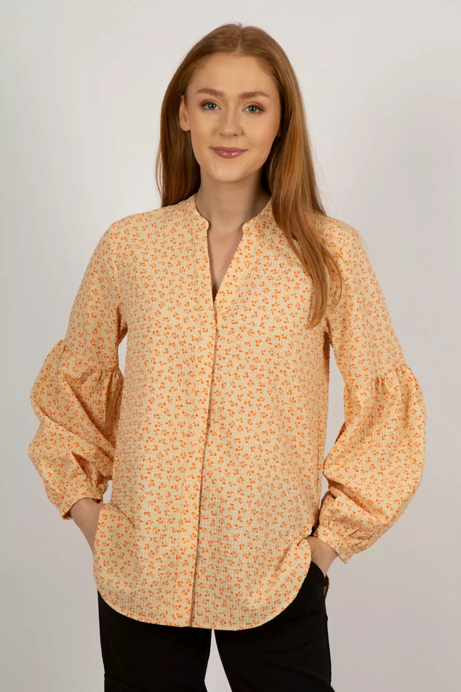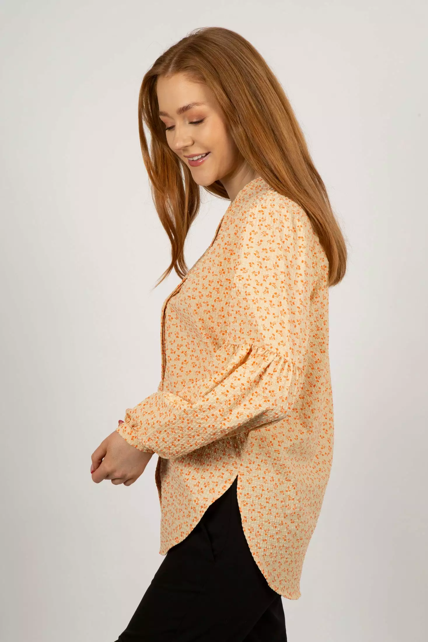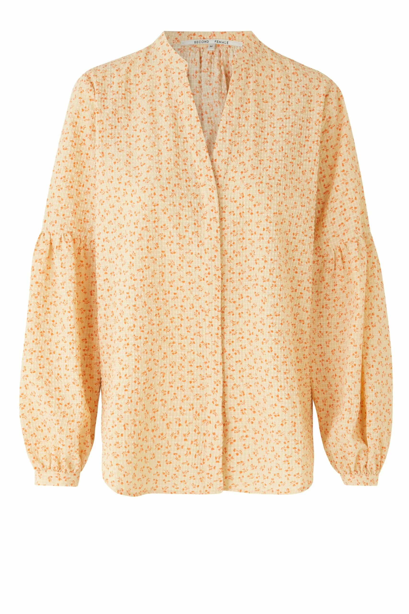 Mica Shirt fra Second Female. Herlig skjorte som gir umiddelbar vårfølelse! Mica Shirt har en ett kreppet effekt, og et nydelig blomsterprint. Den har V-utringning, skjult knappestolpe i front og en avslappet passform, og ballongermer med lav skuldersøm.
