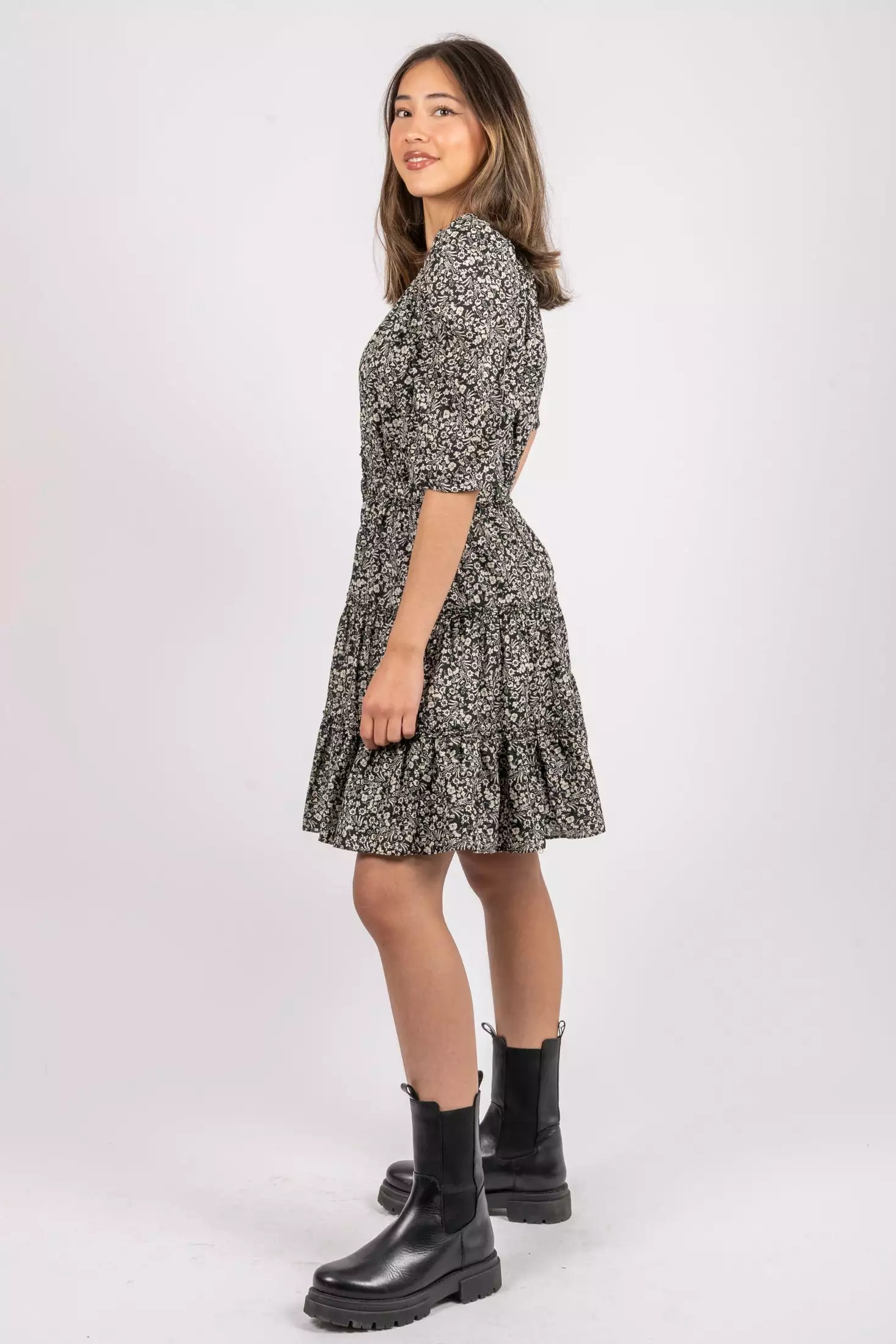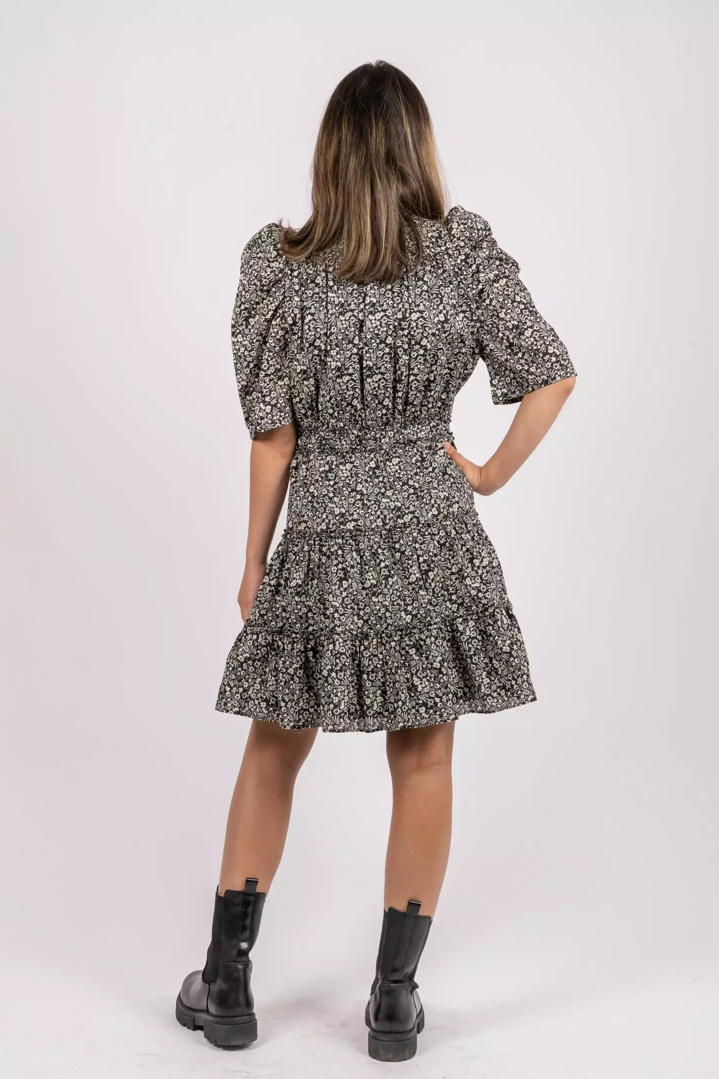 Mikka Waist Dress fra Second Female. Si hei til en av sesongens fineste kjoler fra Second Female! Mikka Waist Dress har alt vi ønsker oss – halvlange ermer med puff på skuldrene som skaper en kul silhuett, V-hals som enkelt fremhever favorittsmykkene og en innsvingt midje som skaper en feminin og flatterende passform. Kjolen har feminine rysjedetaljer i halsen og på skjørtet.