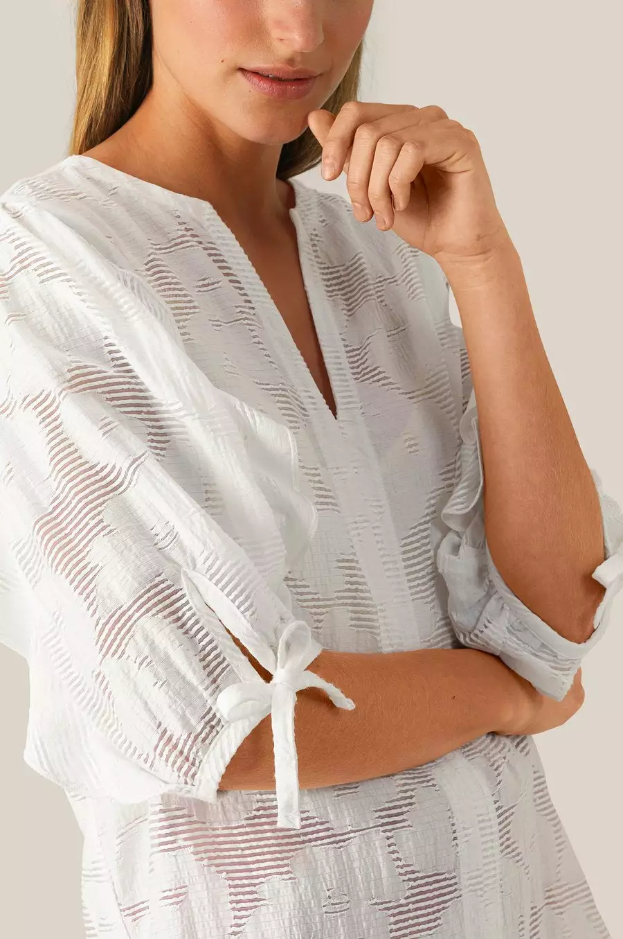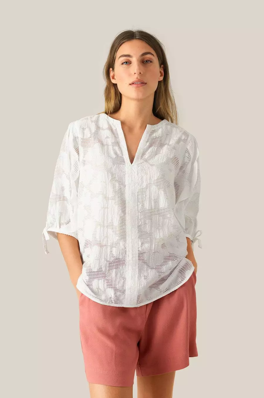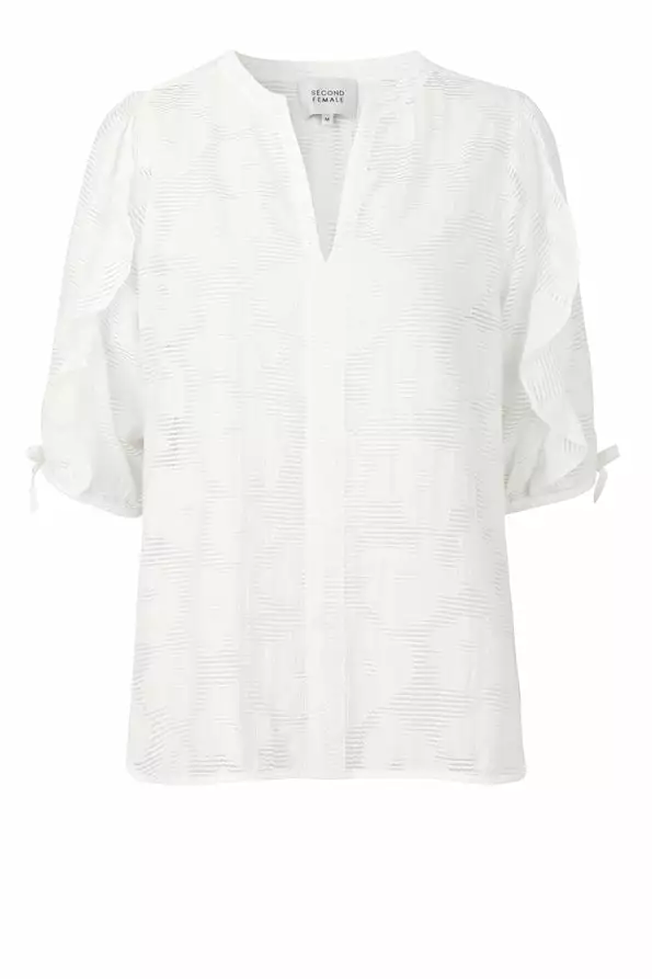 Mila SS Blouse fra Second Female er en supersøt sommerlig bluse med 3D print av blomster. Blusen har v-hals, vide ermer med knyting i enden.