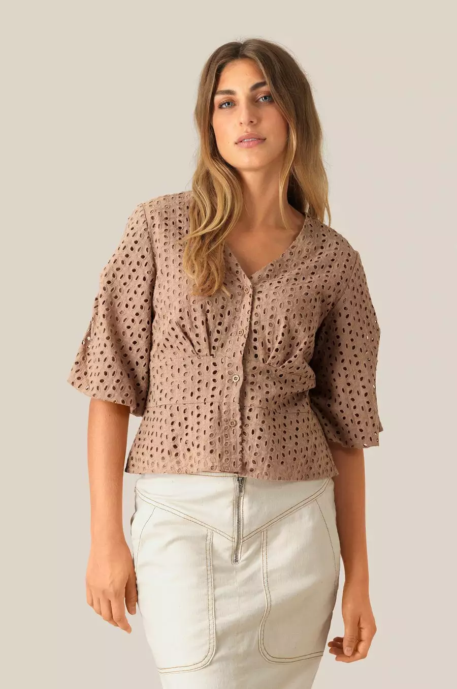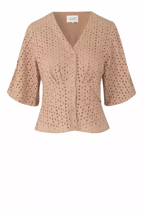Milly SS Blouse fra Second Female er en feminin bluse med hullete bomulls-print. Blusen har mellomlange ermer og går litt inn i midjen. Knapper foran for lukking.